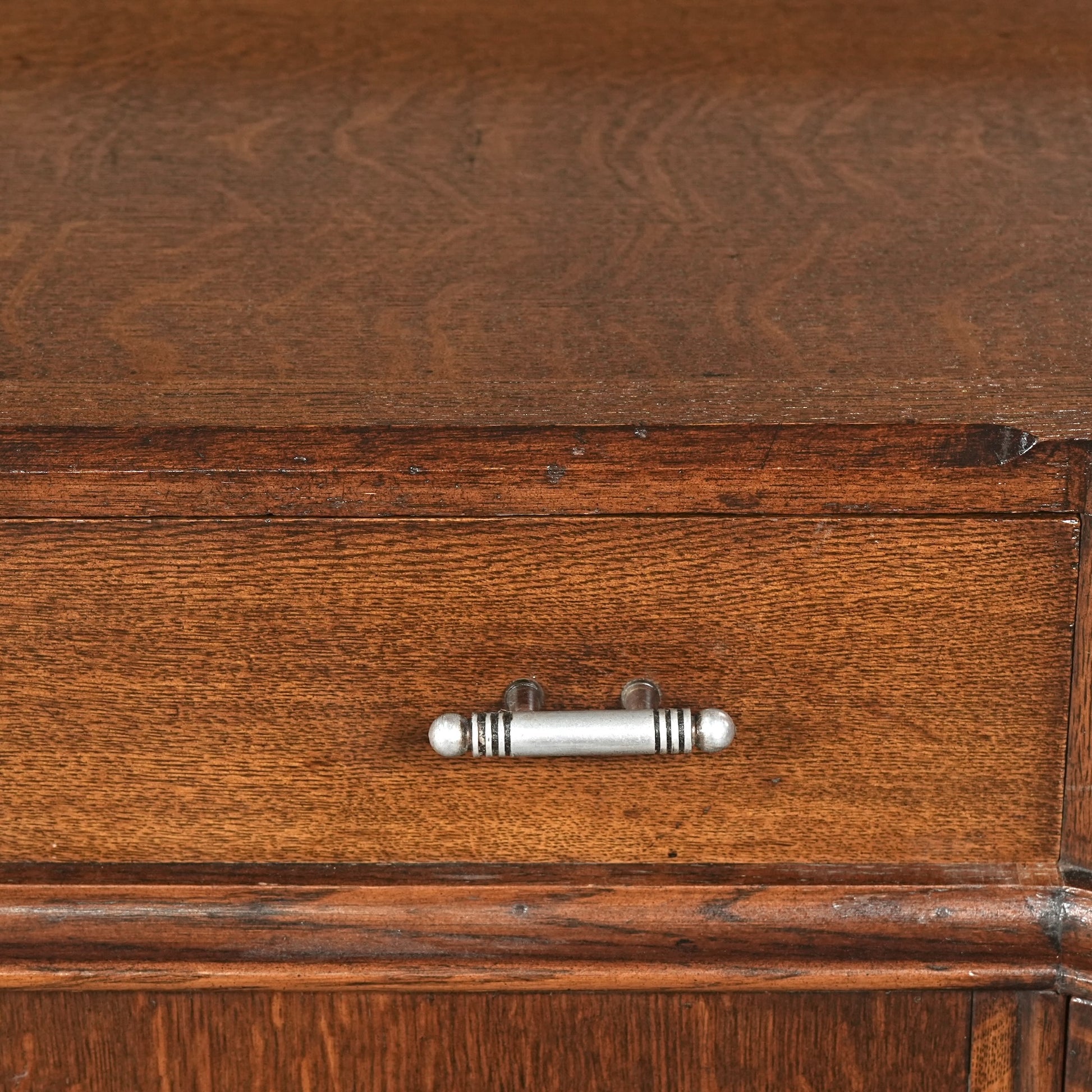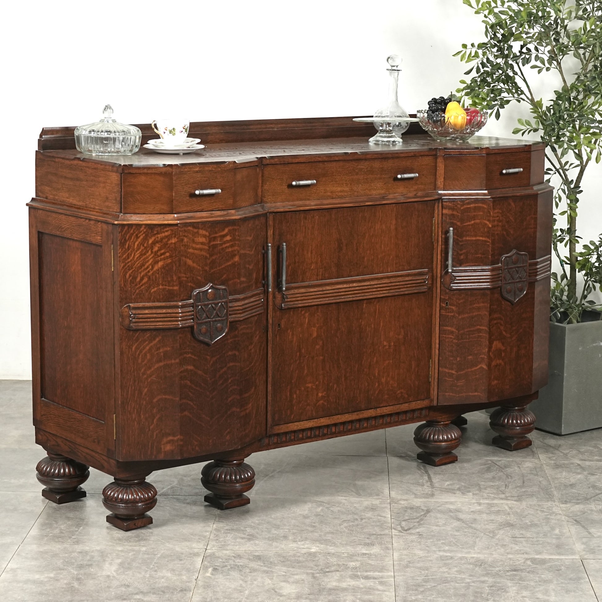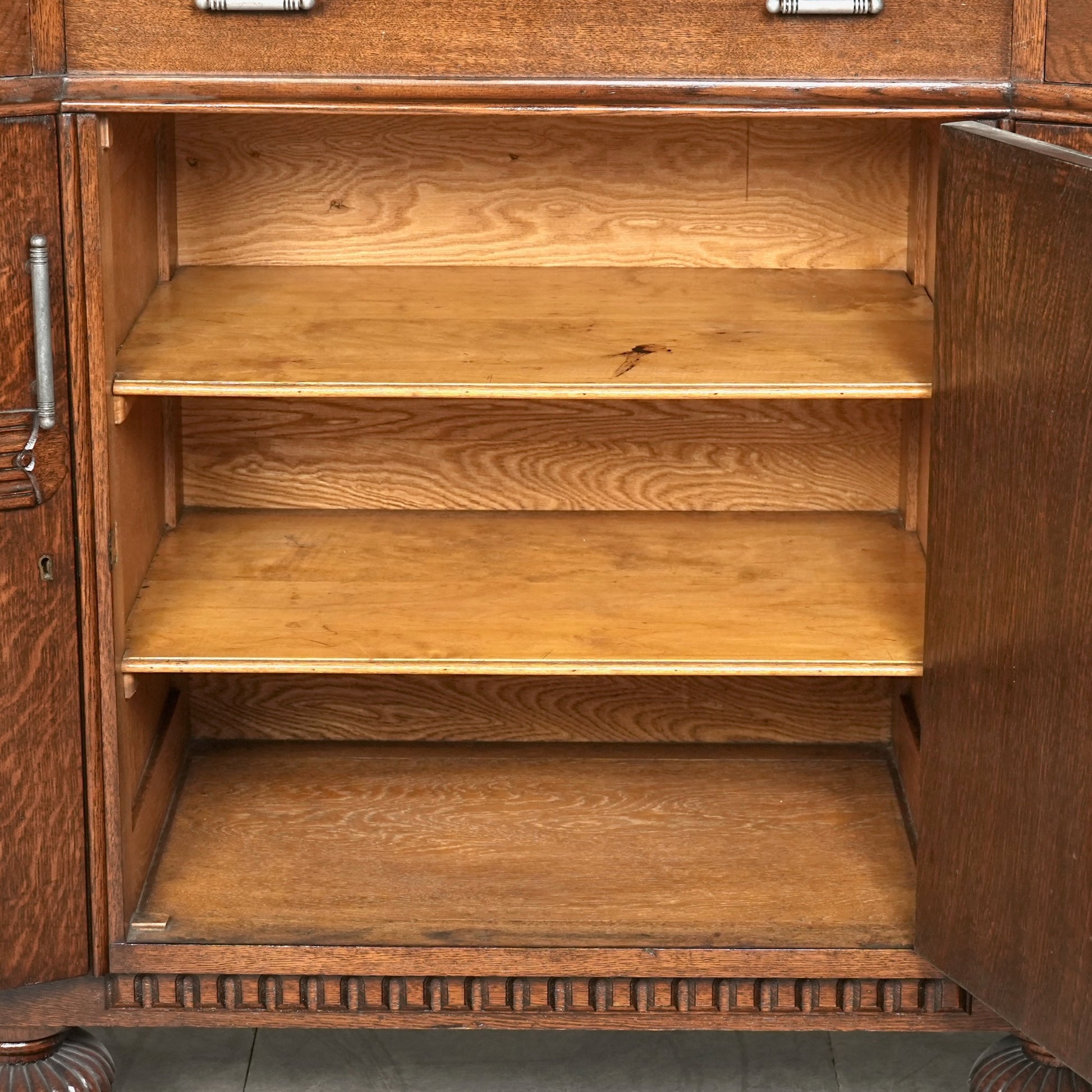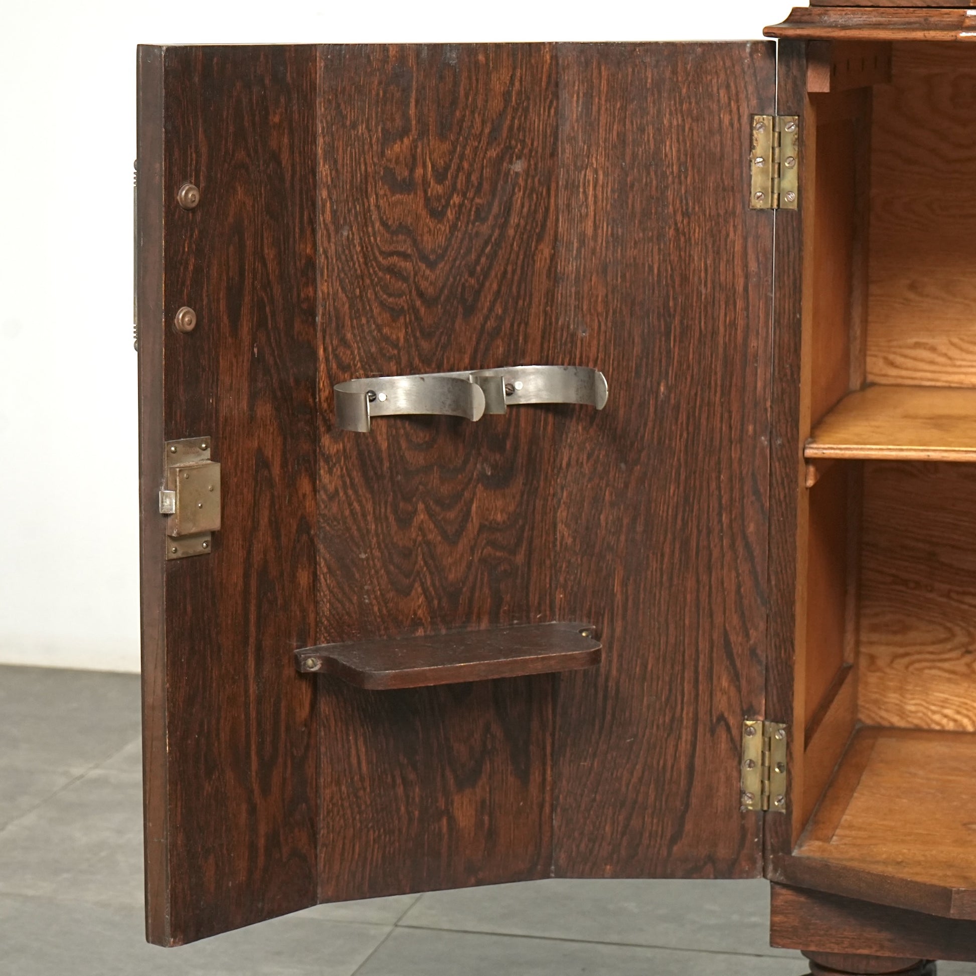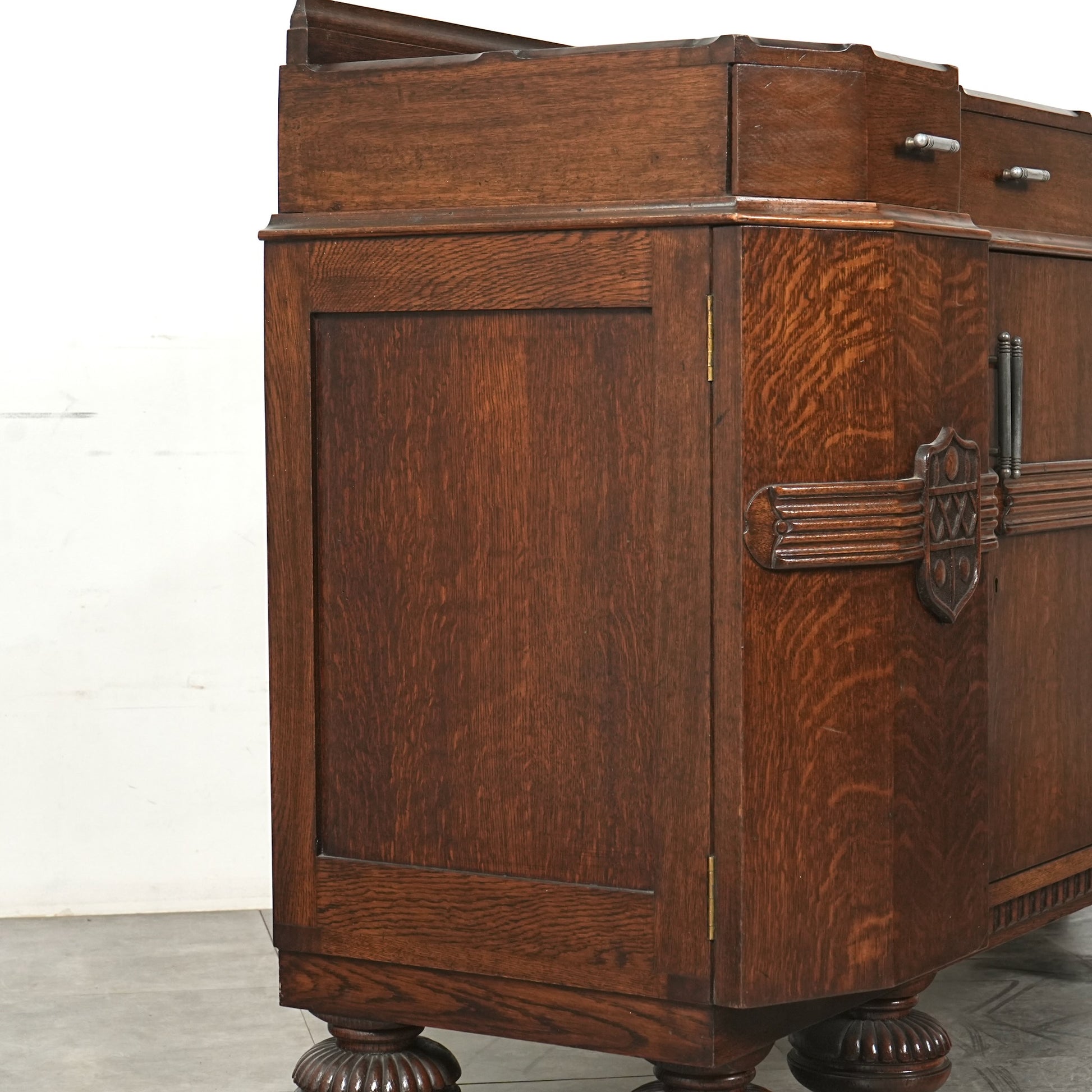 英国の伝統を感じさせる重厚で上品な佇まいで、オーク材の美しい木目と質感、随所に手作業で施された装飾や丁寧な作り込みからは当時の職人の高い技術と多大な労力が窺える上質な逸品。