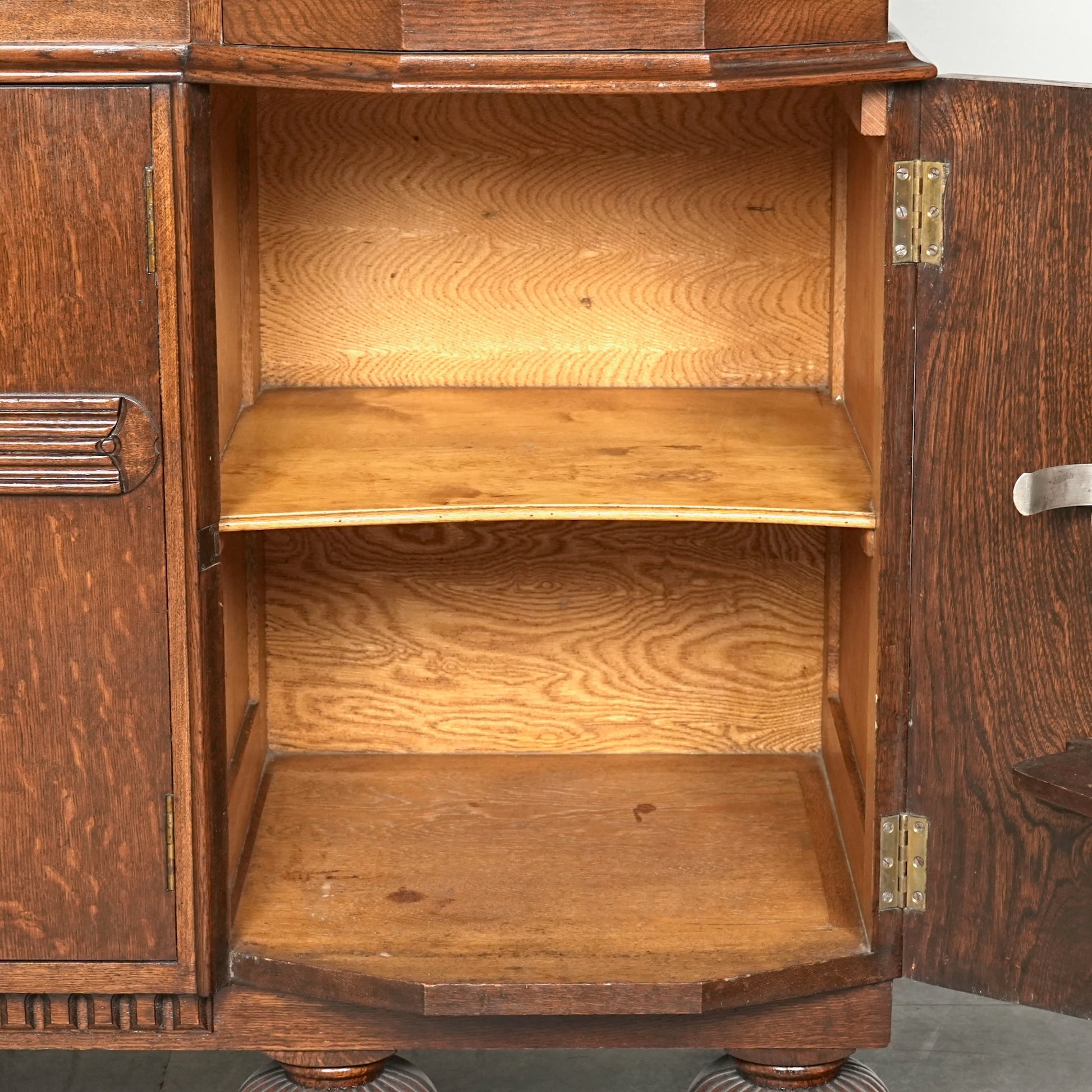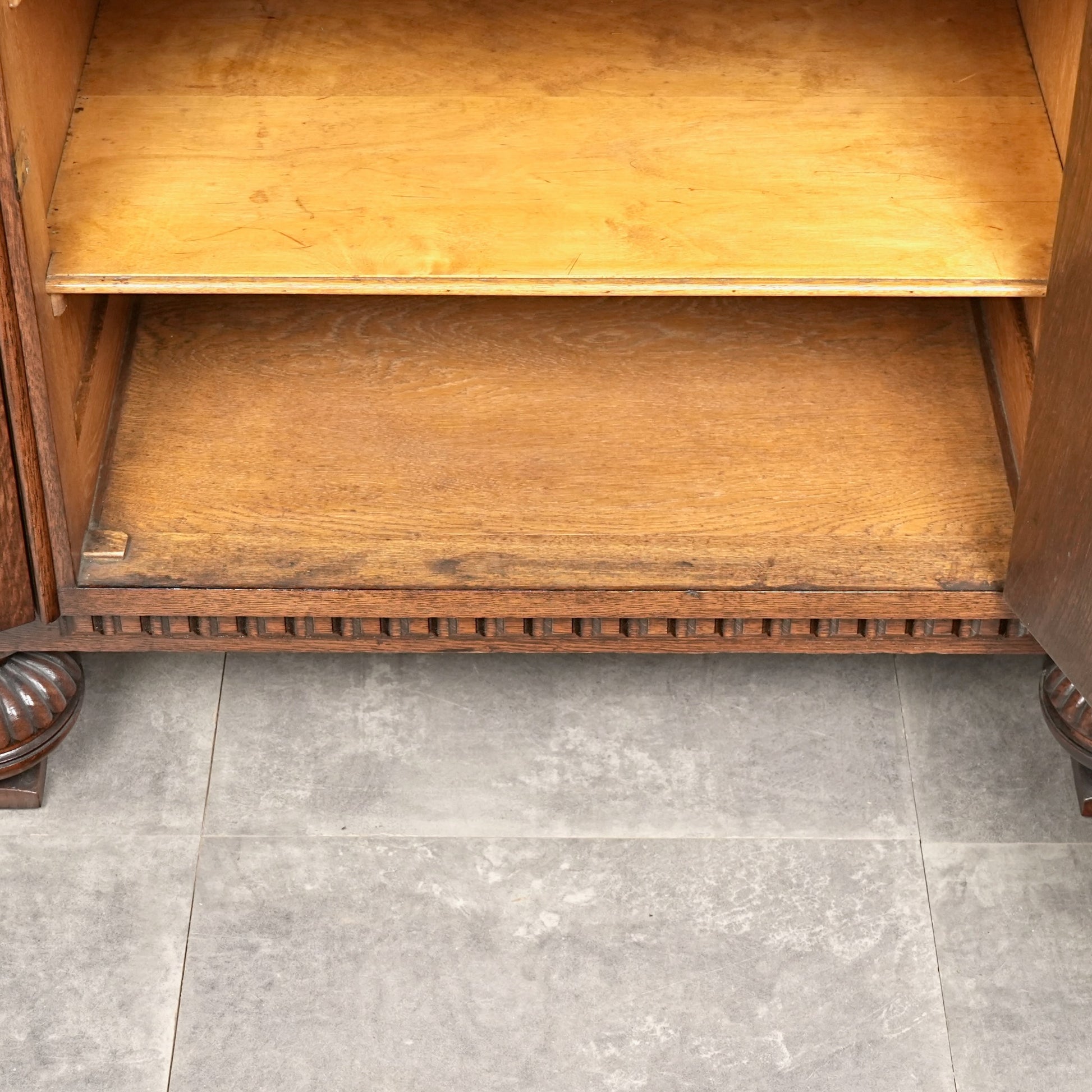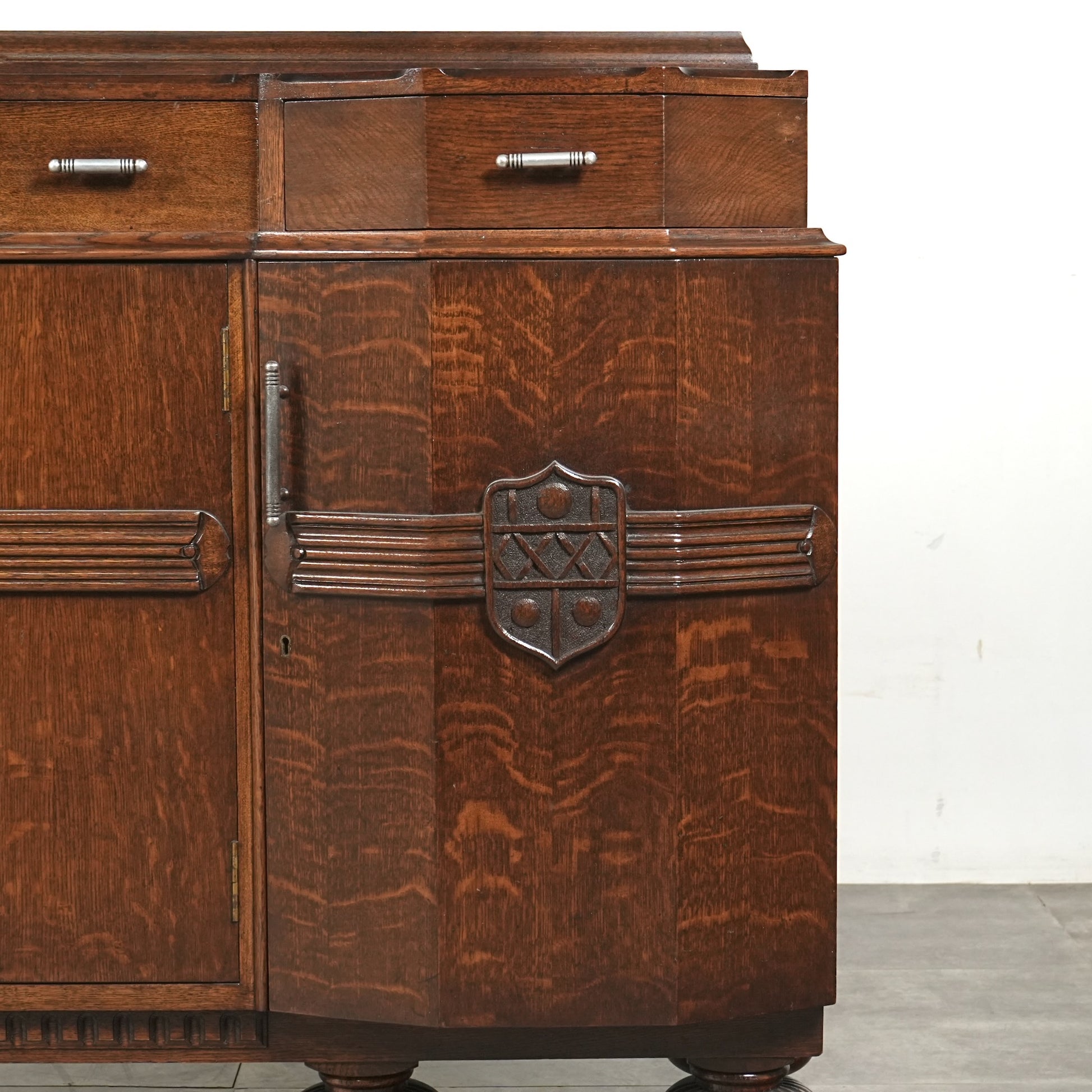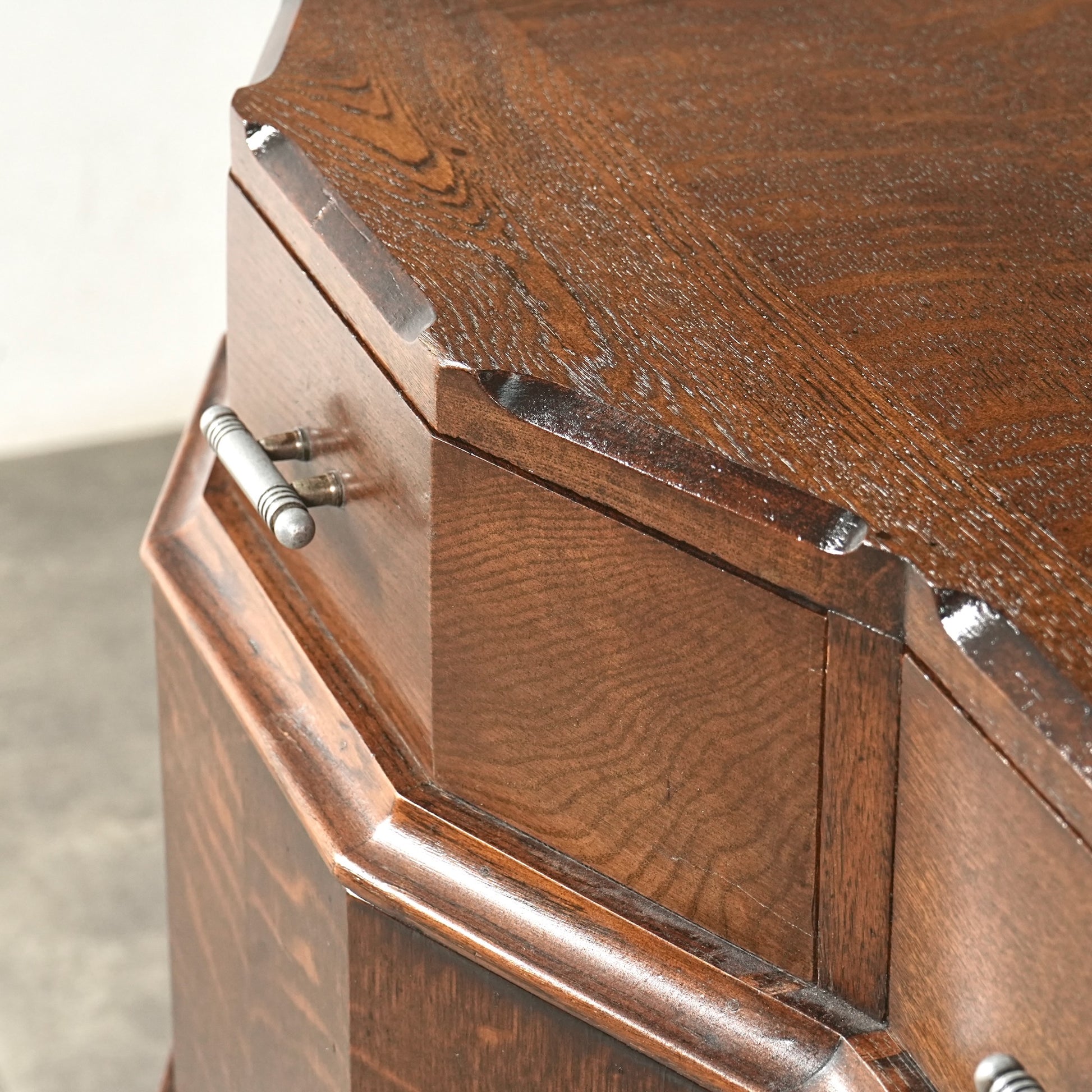 英国の伝統を感じさせる重厚で上品な佇まいで、オーク材の美しい木目と質感、随所に手作業で施された装飾や丁寧な作り込みからは当時の職人の高い技術と多大な労力が窺える上質な逸品。