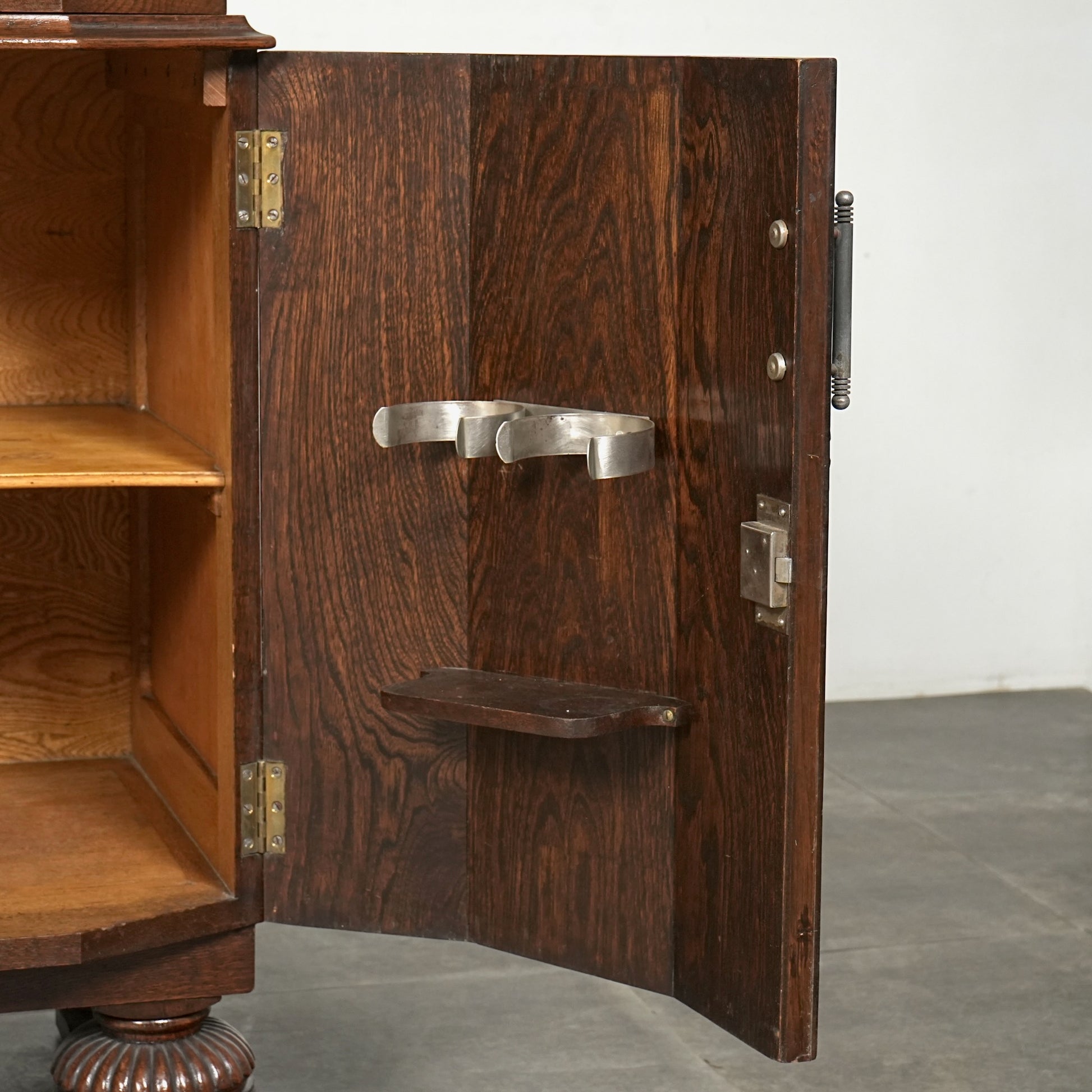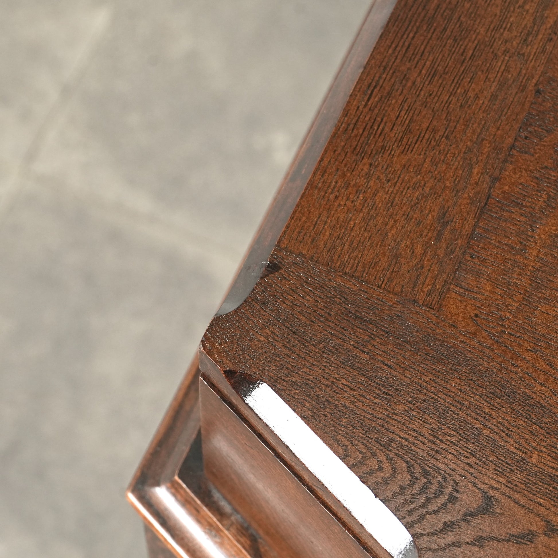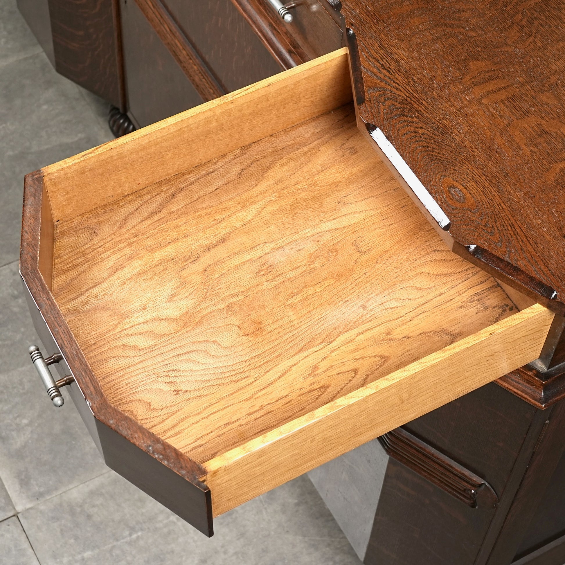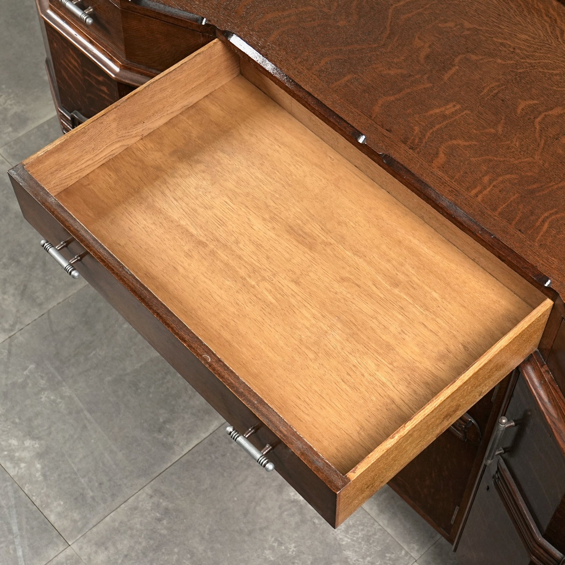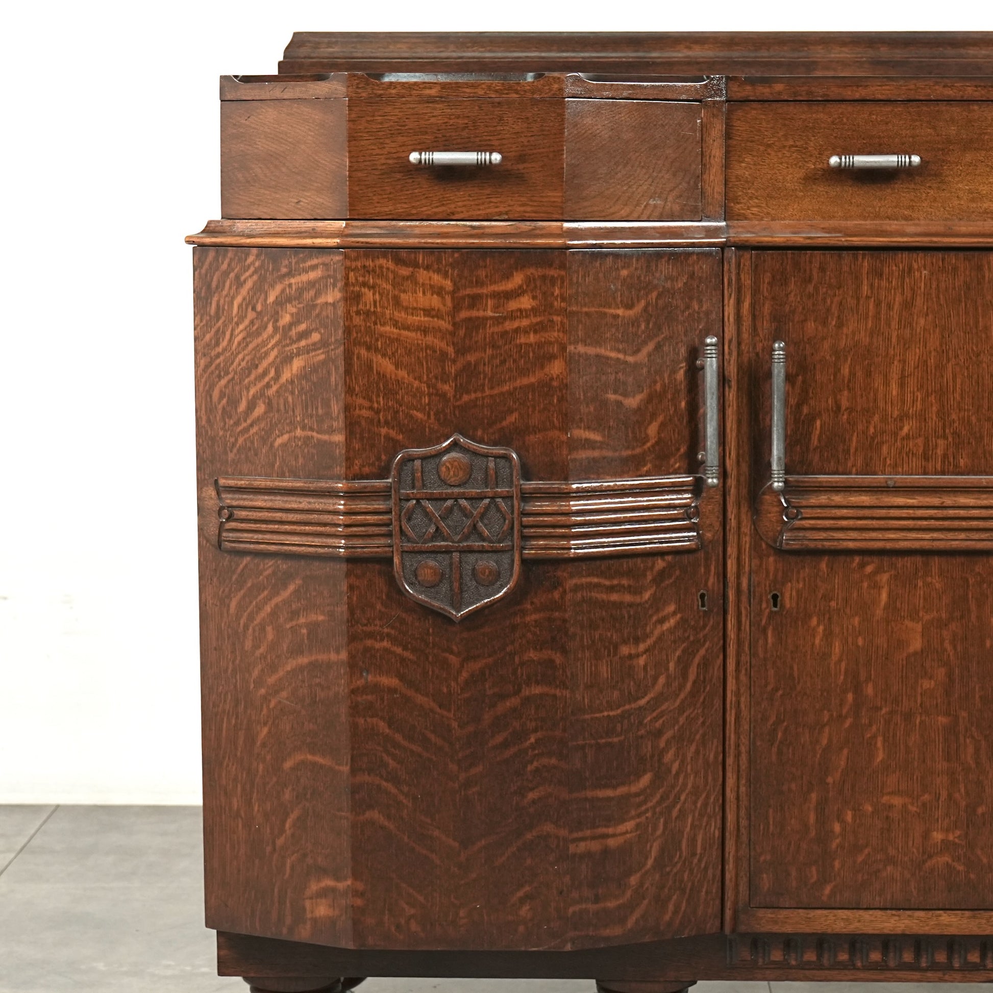 英国の伝統を感じさせる重厚で上品な佇まいで、オーク材の美しい木目と質感、随所に手作業で施された装飾や丁寧な作り込みからは当時の職人の高い技術と多大な労力が窺える上質な逸品。