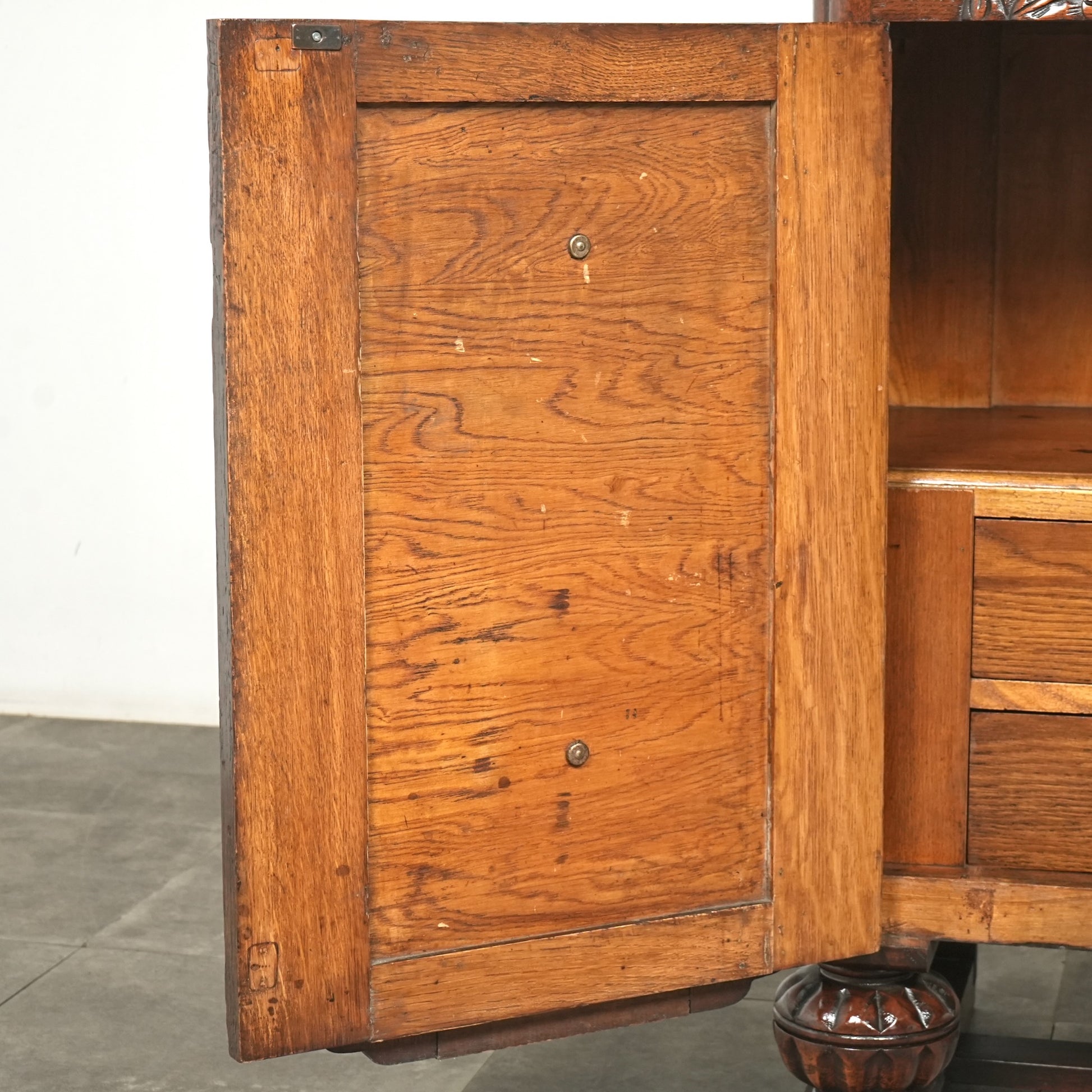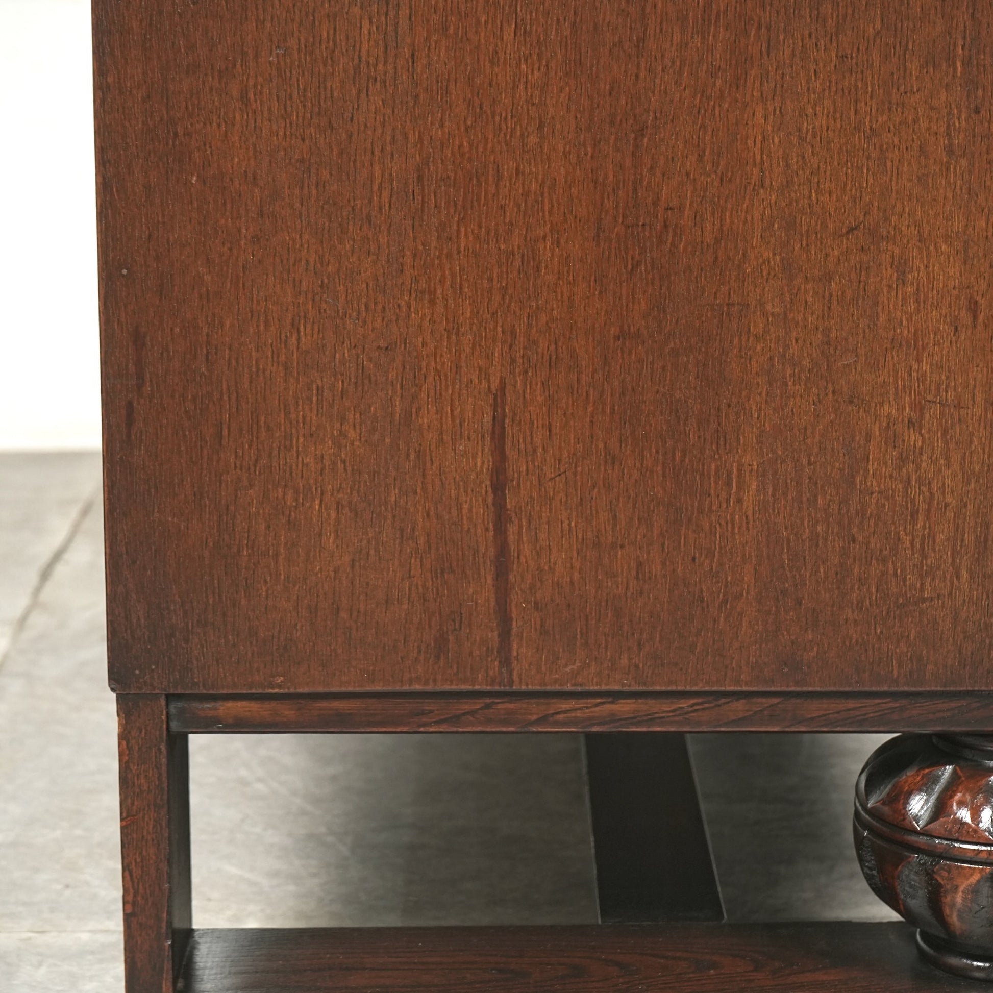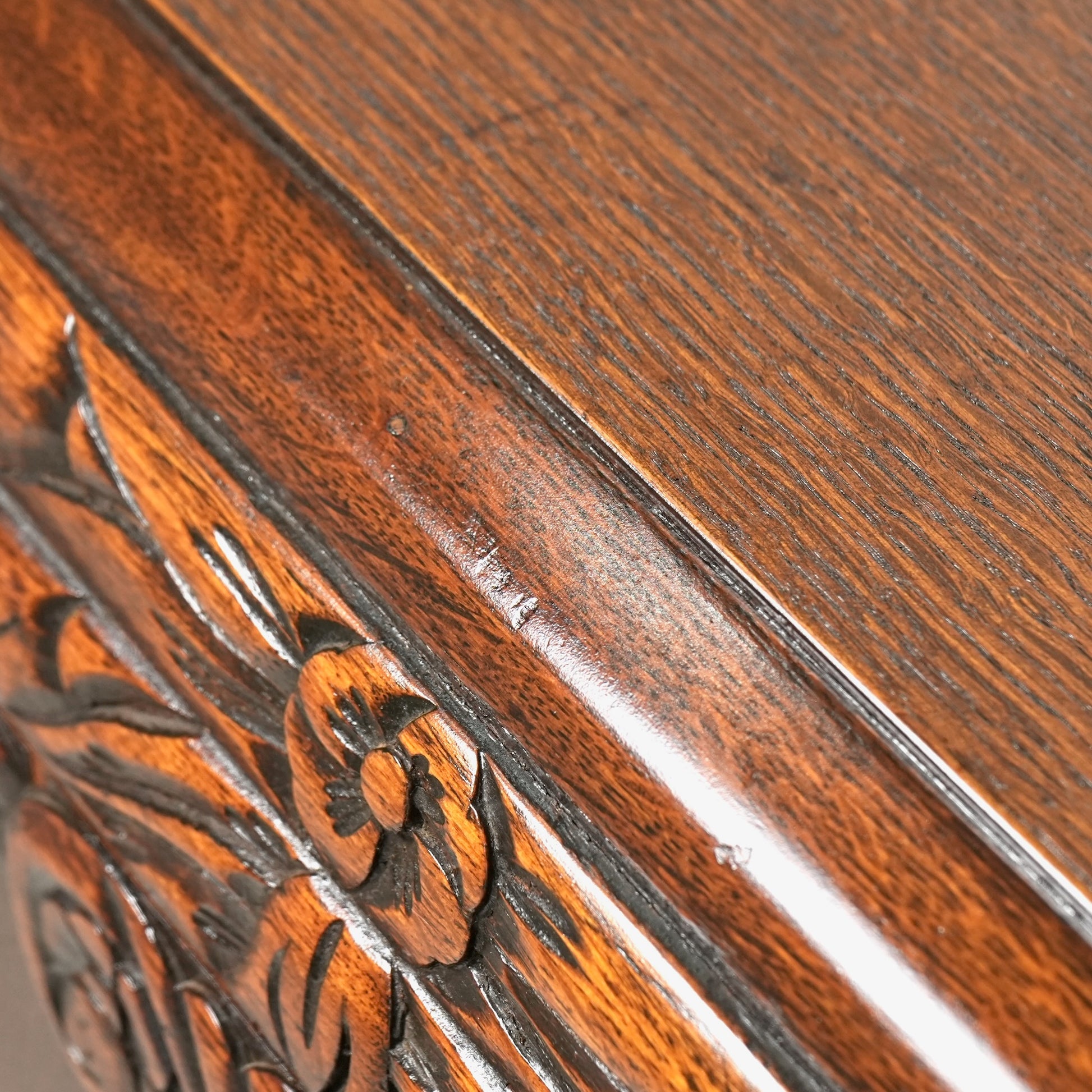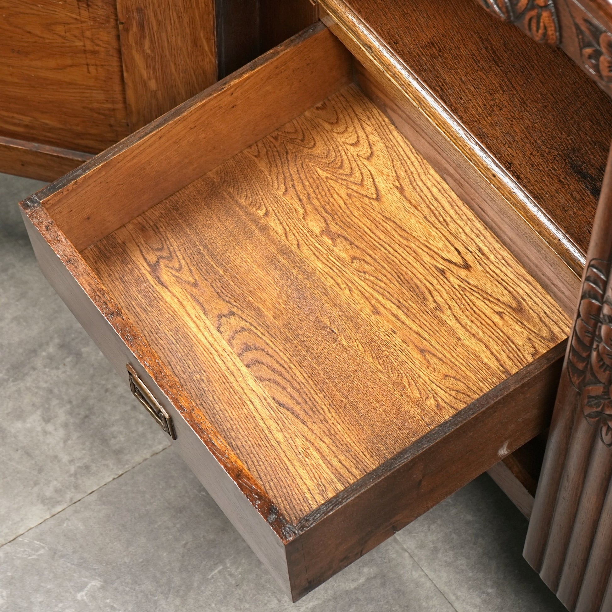 英国の伝統を感じさせる重厚で上品な佇まいで、オーク材の美しい木目と質感、随所に手作業で施された装飾や丁寧な作り込みからは当時の職人の高い技術と多大な労力が窺える上質な逸品で、まさに英国アンティークの魅力が詰まったアイテムと言えるでしょう。