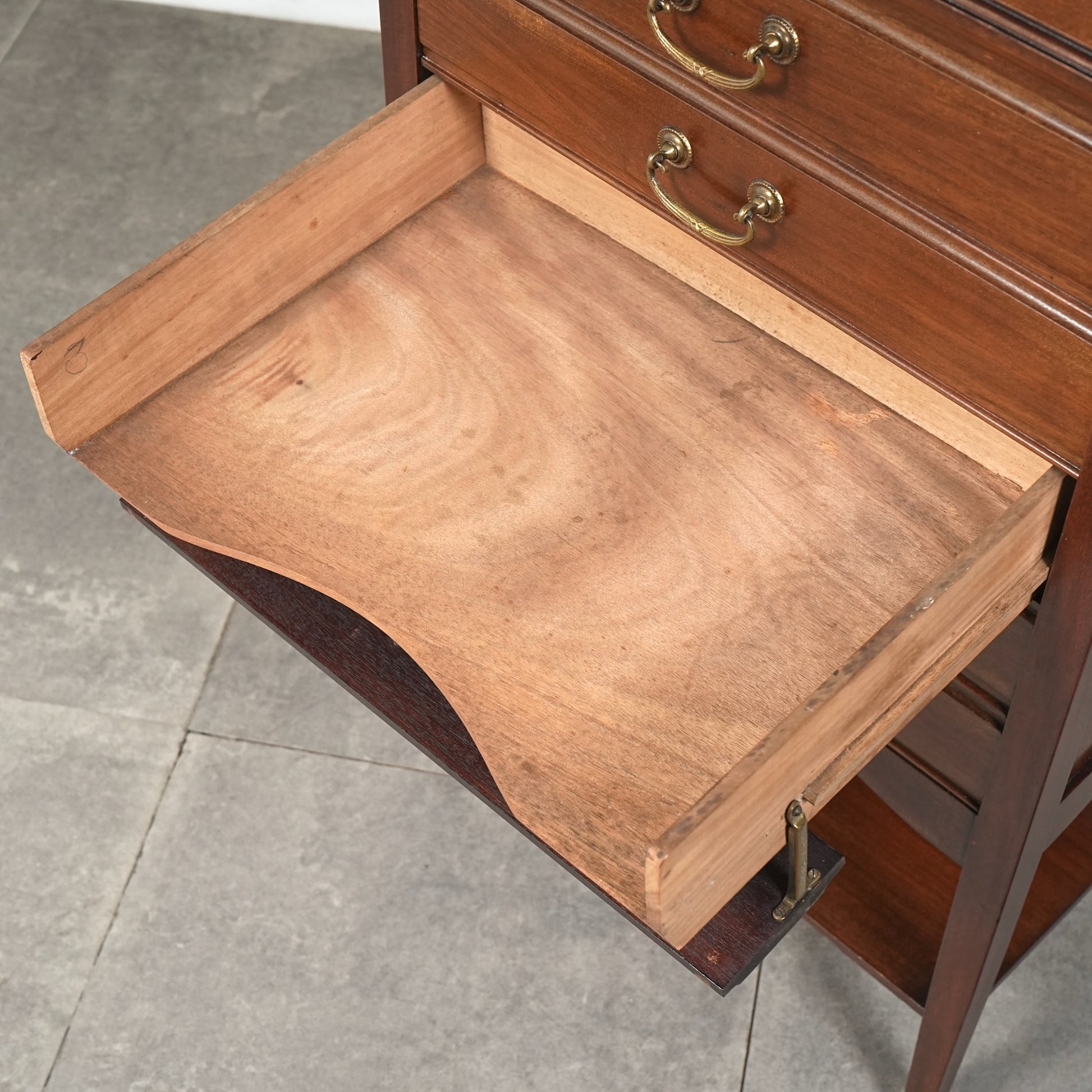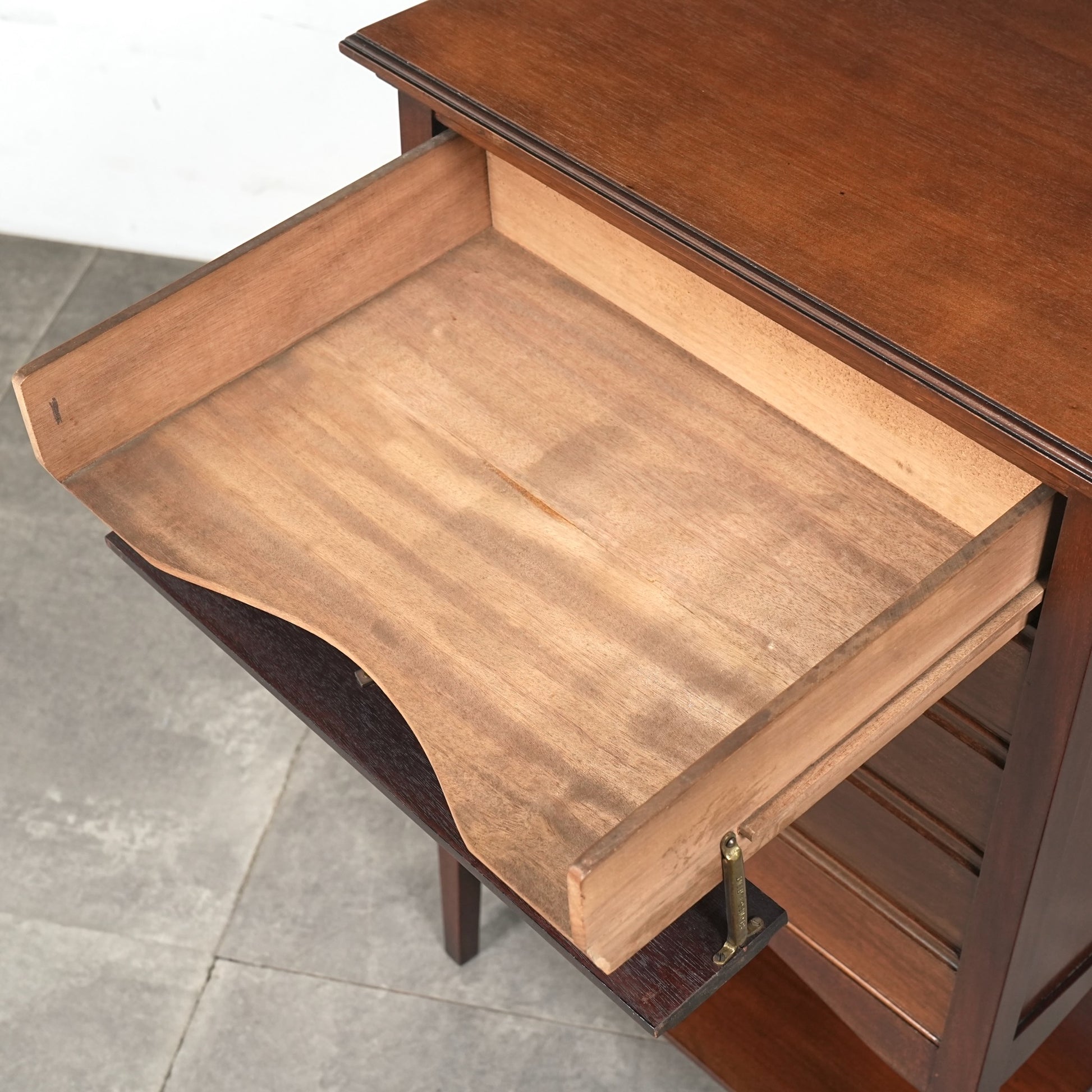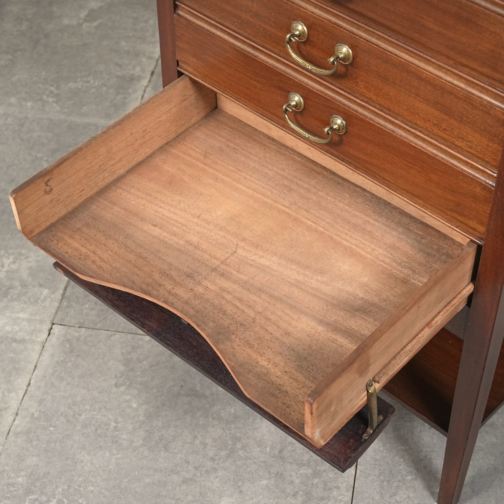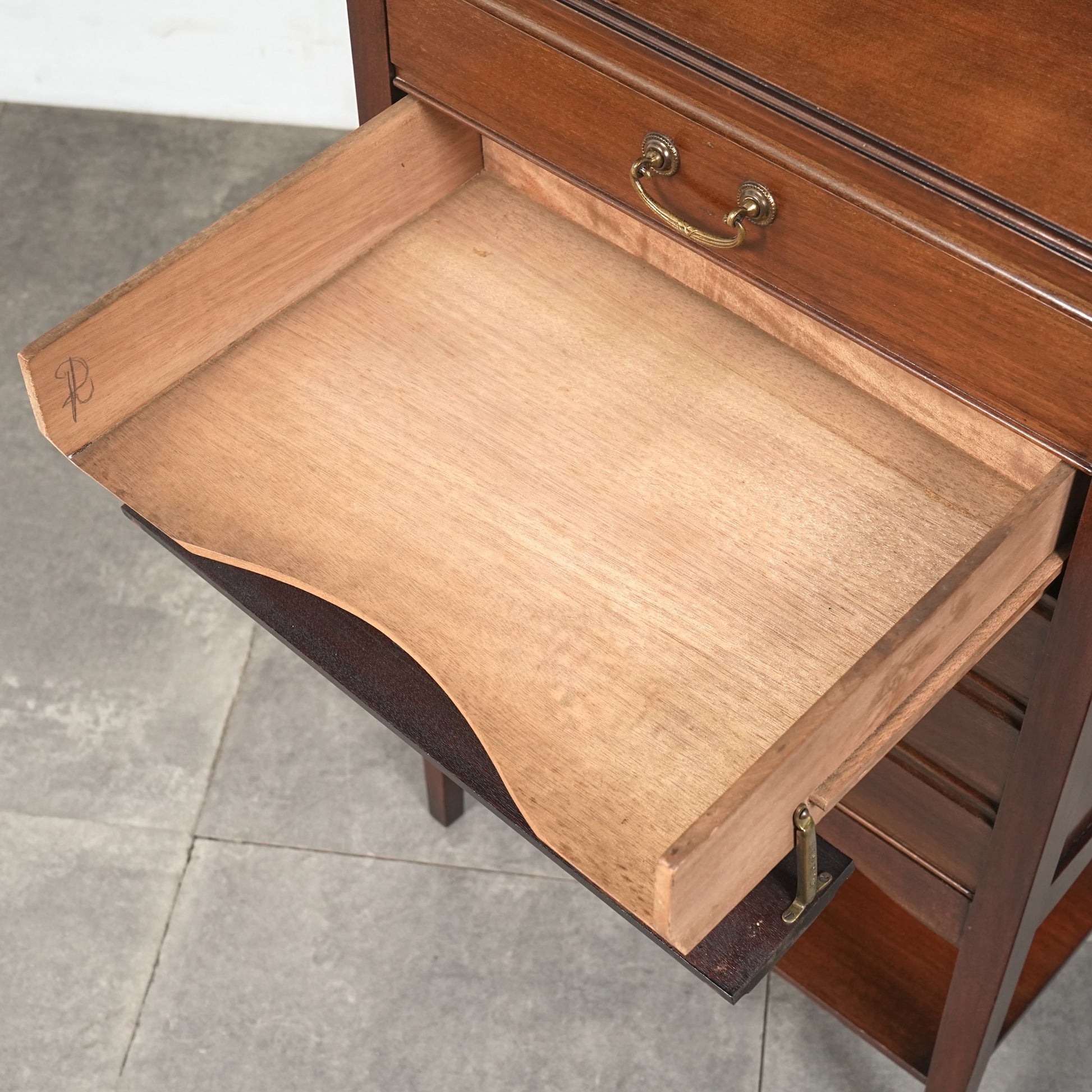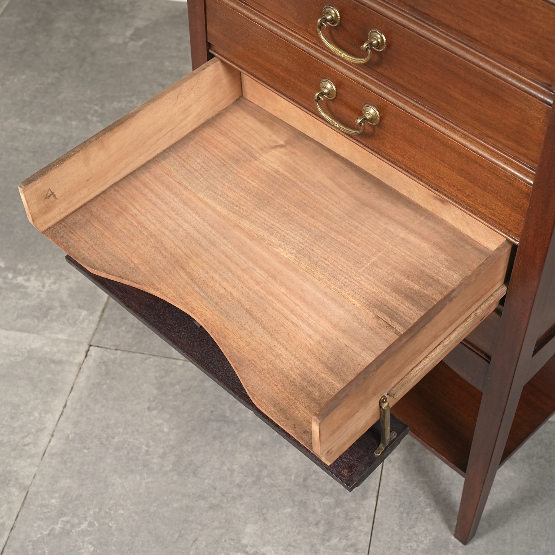 高品質なマホガニーならではの美しい質感が印象的で、シンプルながらも引き出し部分のユニークなギミックや可愛らしい取手が良いアクセントとなった、英国クラシック家具らしい上品な佇まい。