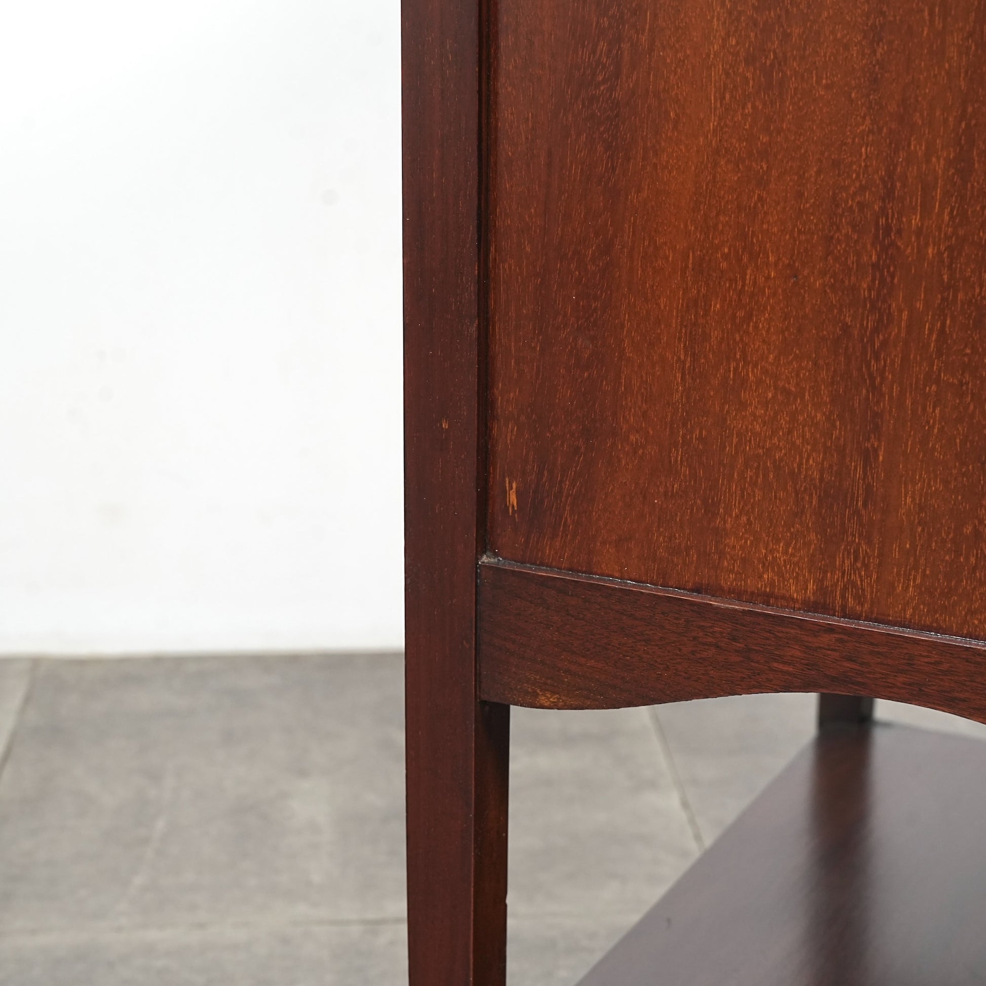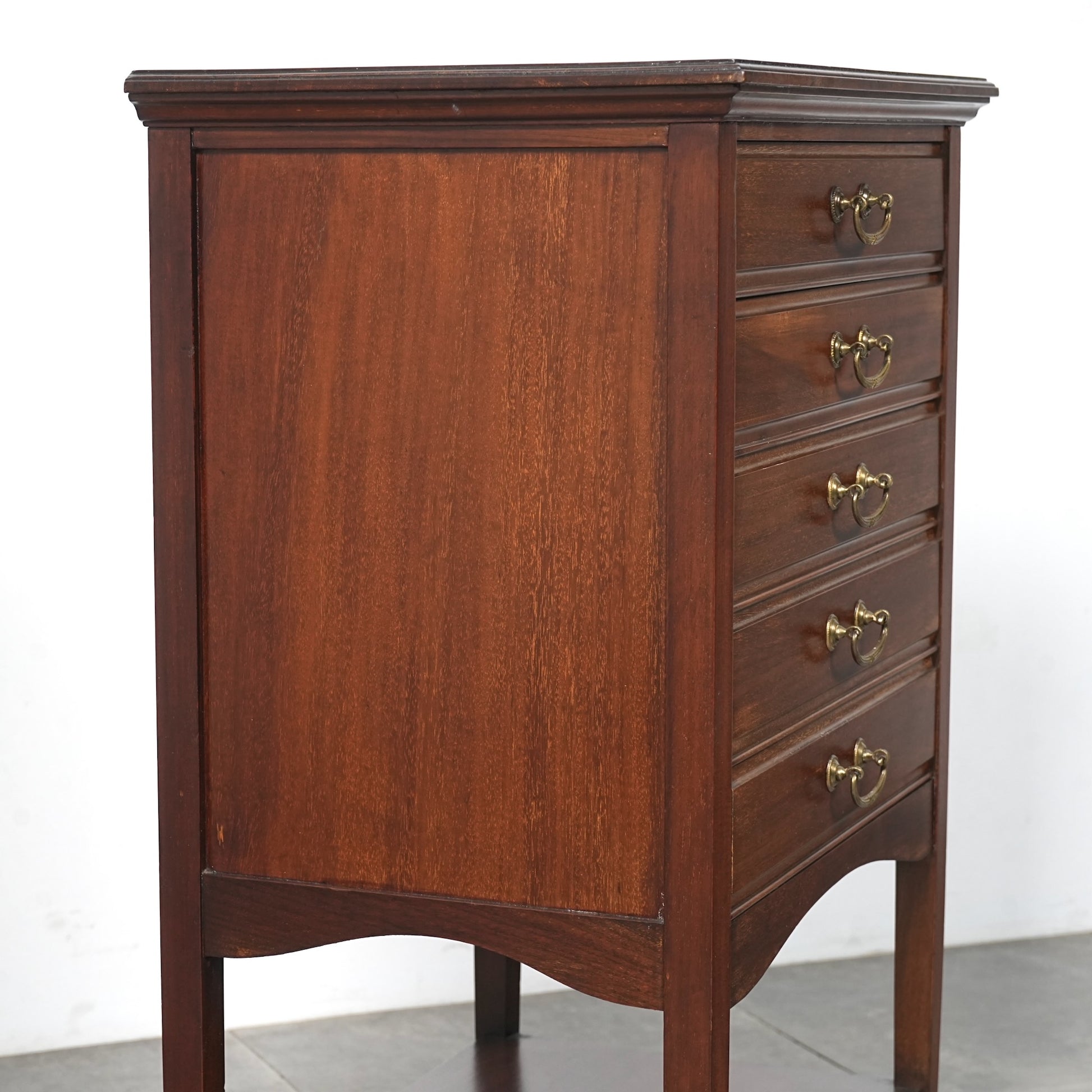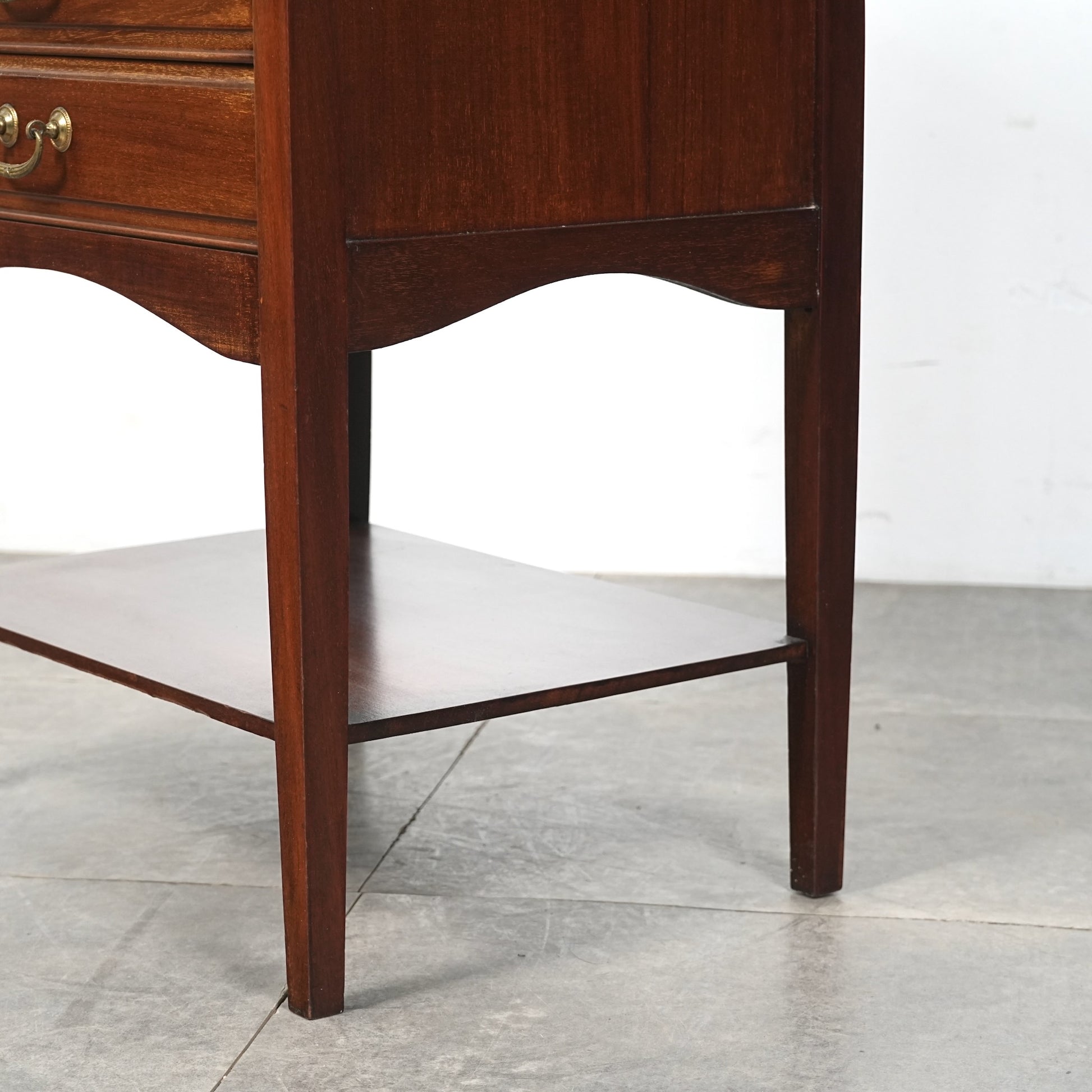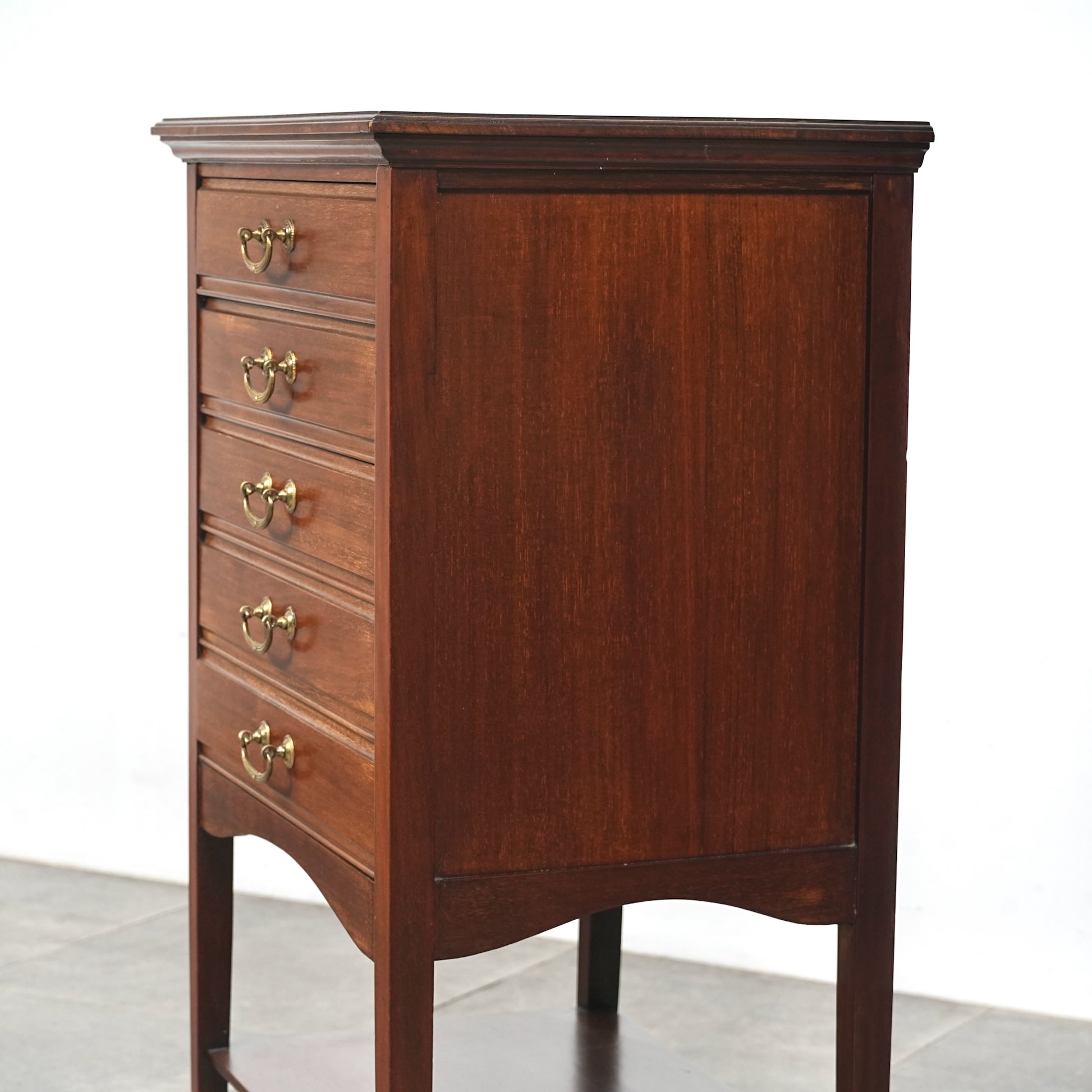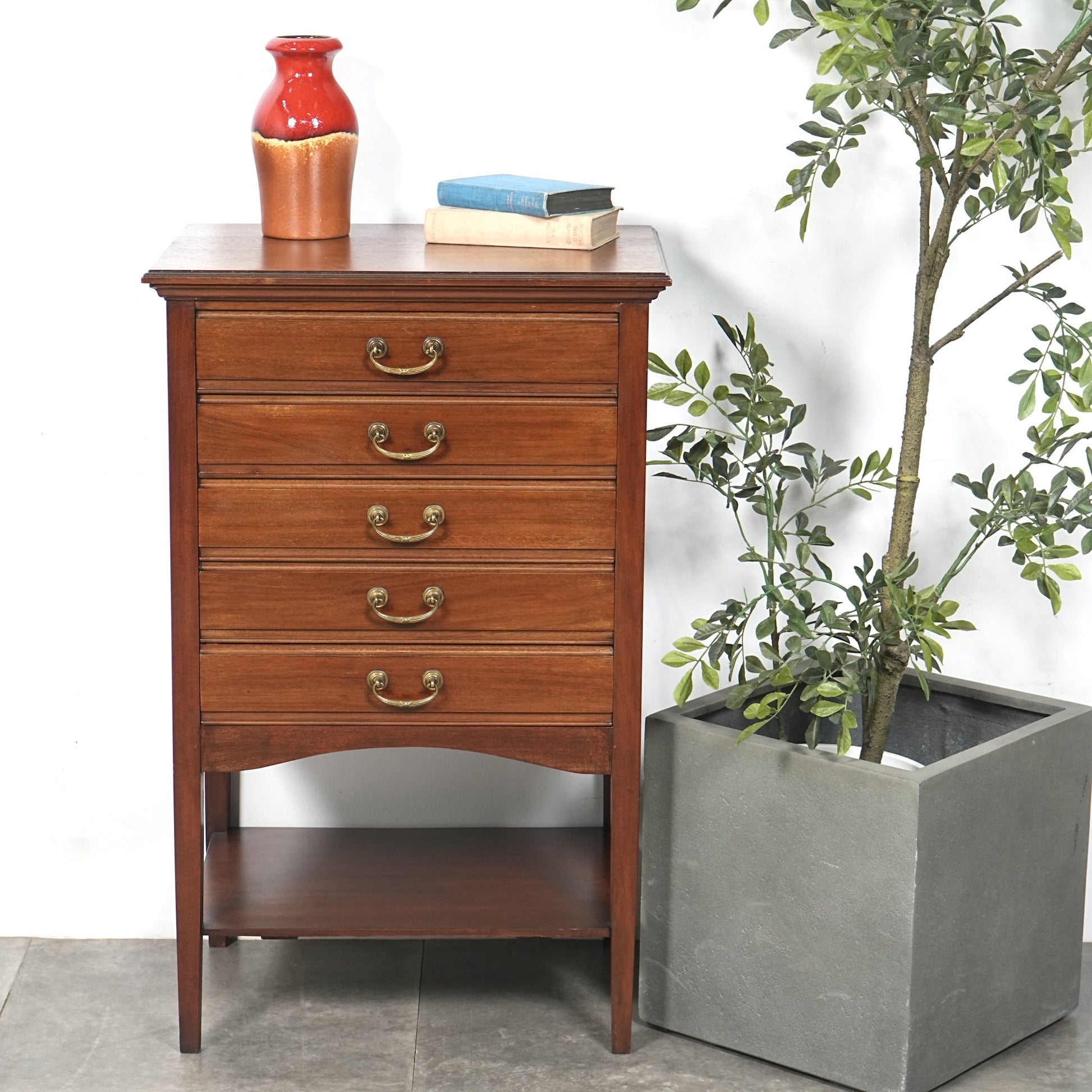 高品質なマホガニーならではの美しい質感が印象的で、シンプルながらも引き出し部分のユニークなギミックや可愛らしい取手が良いアクセントとなった、英国クラシック家具らしい上品な佇まい。