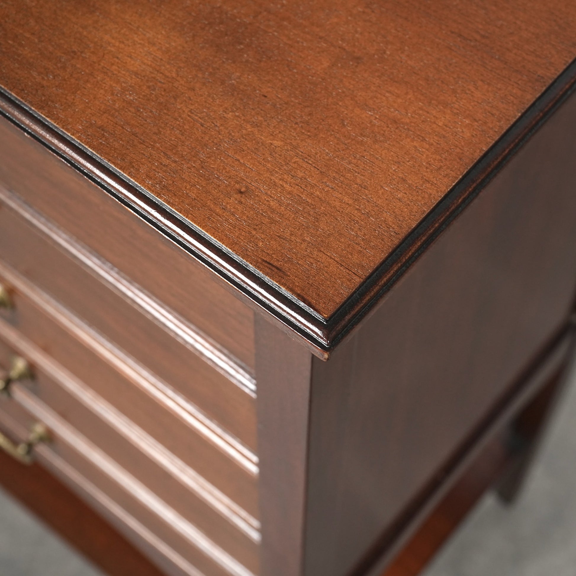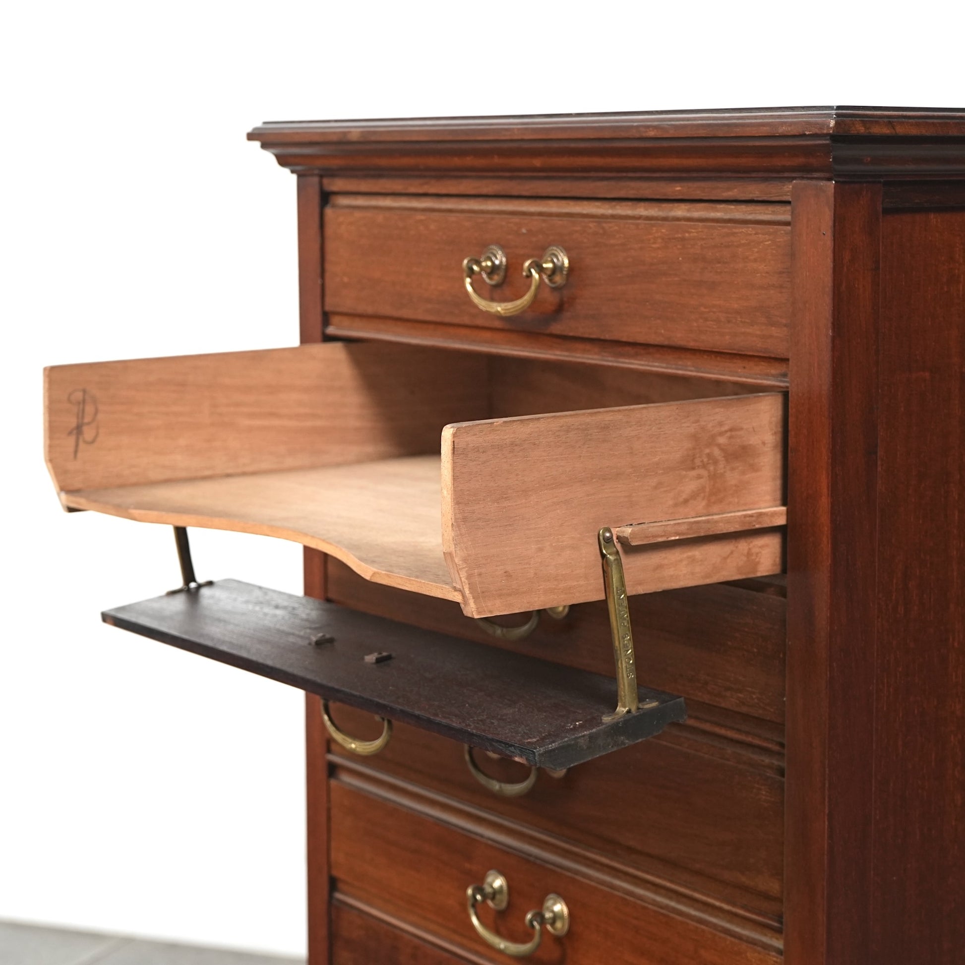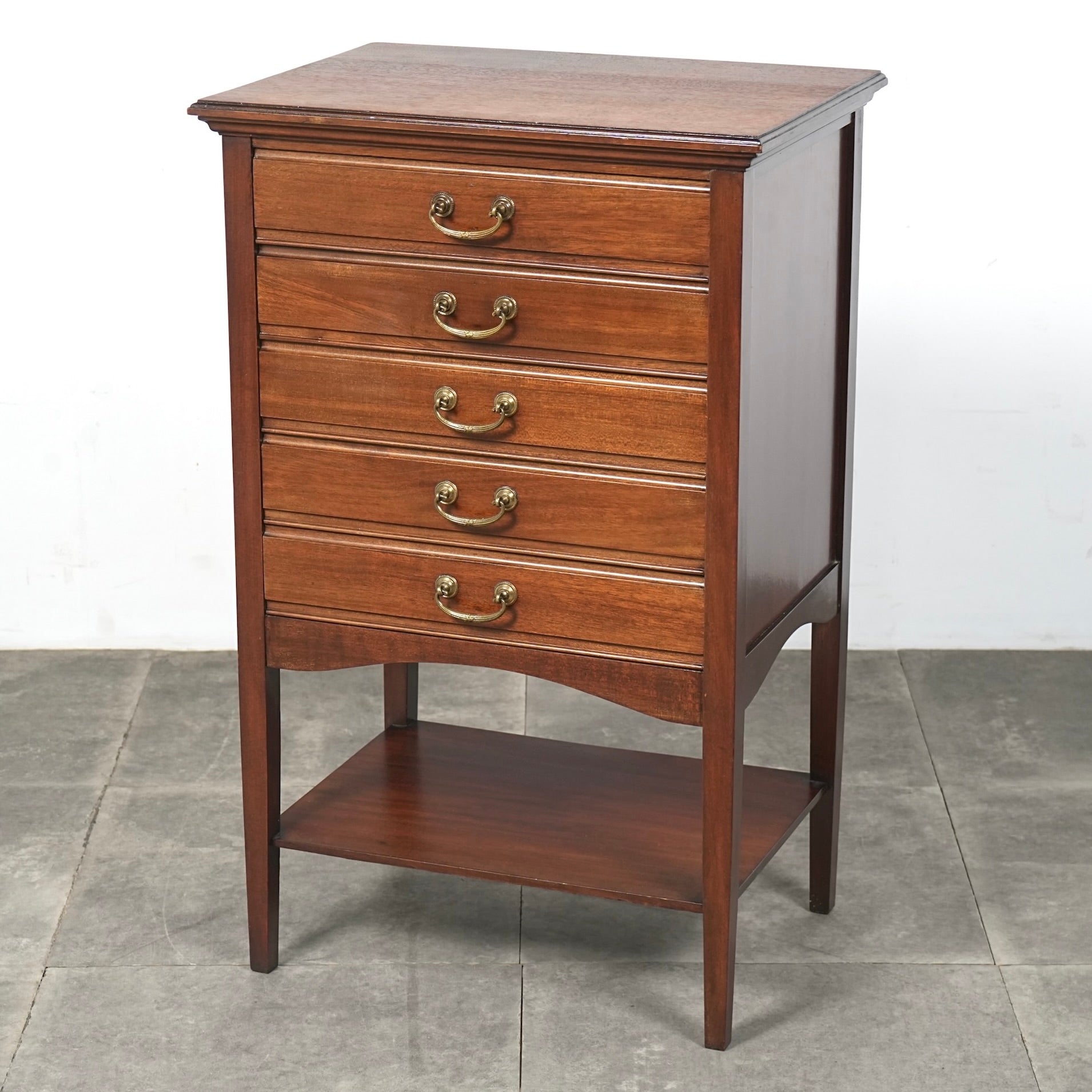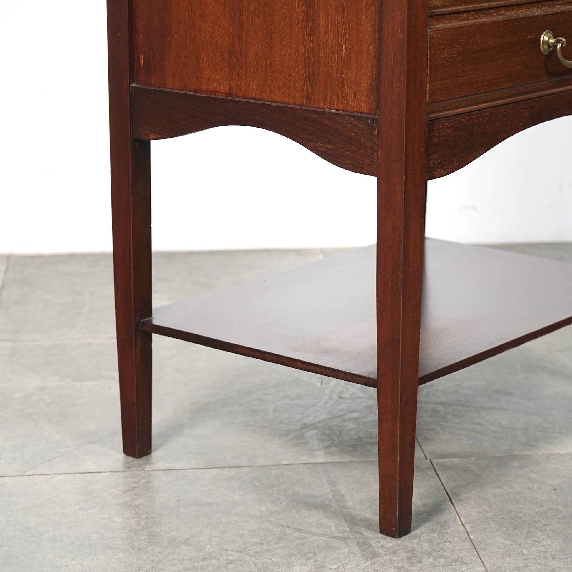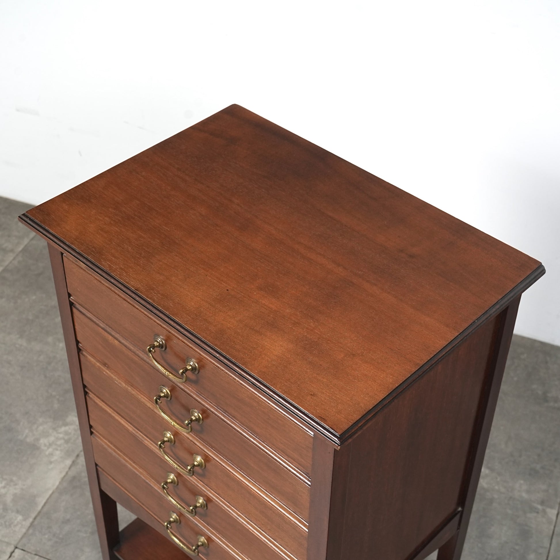 高品質なマホガニーならではの美しい質感が印象的で、シンプルながらも引き出し部分のユニークなギミックや可愛らしい取手が良いアクセントとなった、英国クラシック家具らしい上品な佇まい。