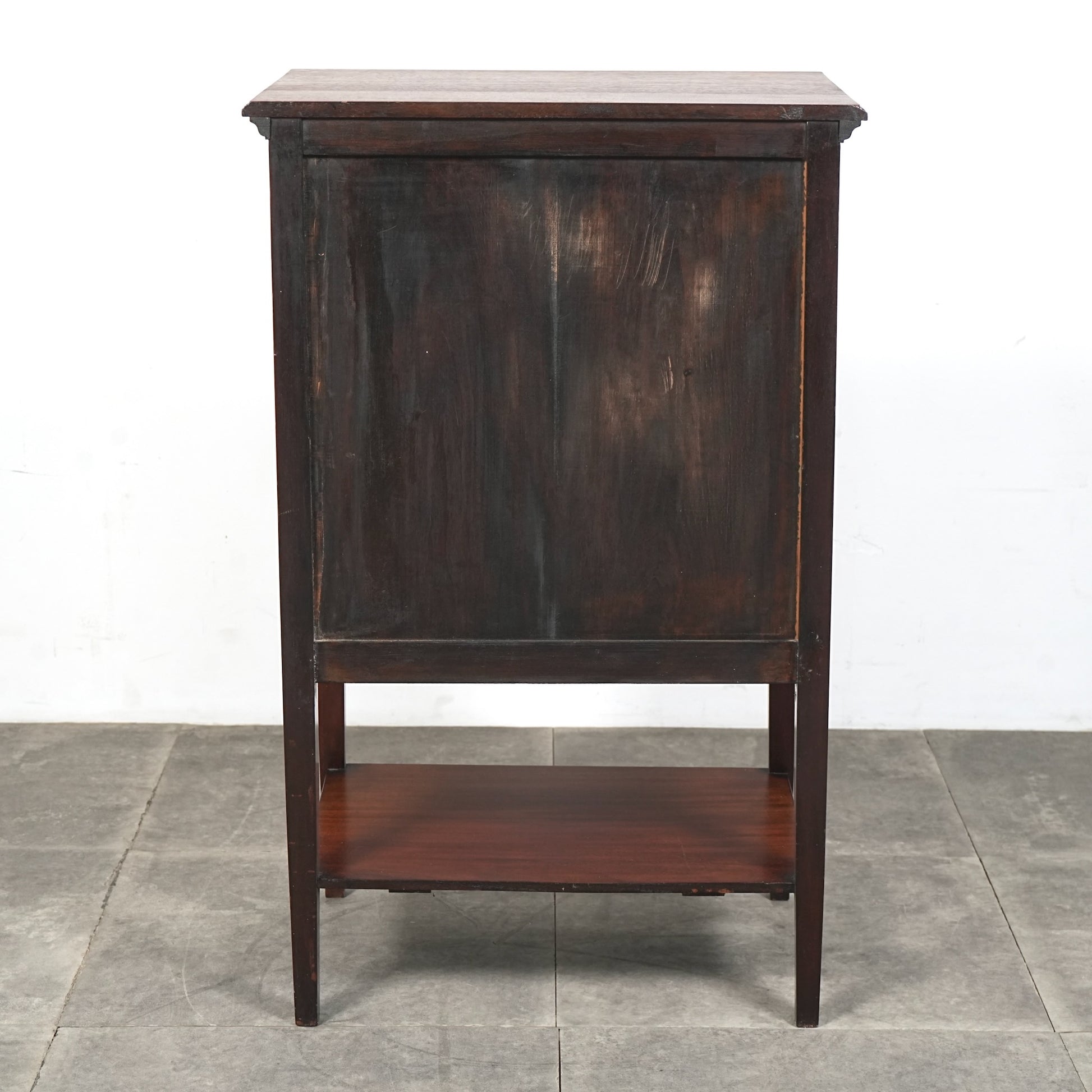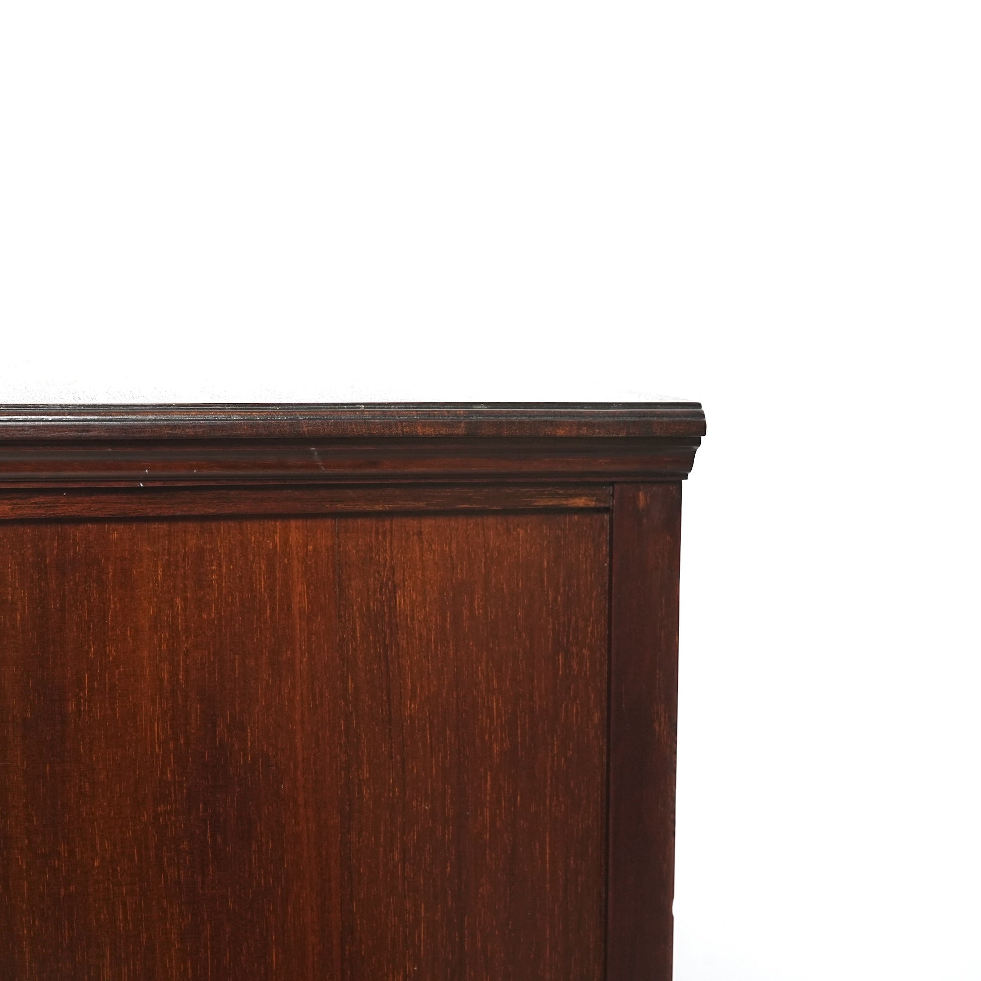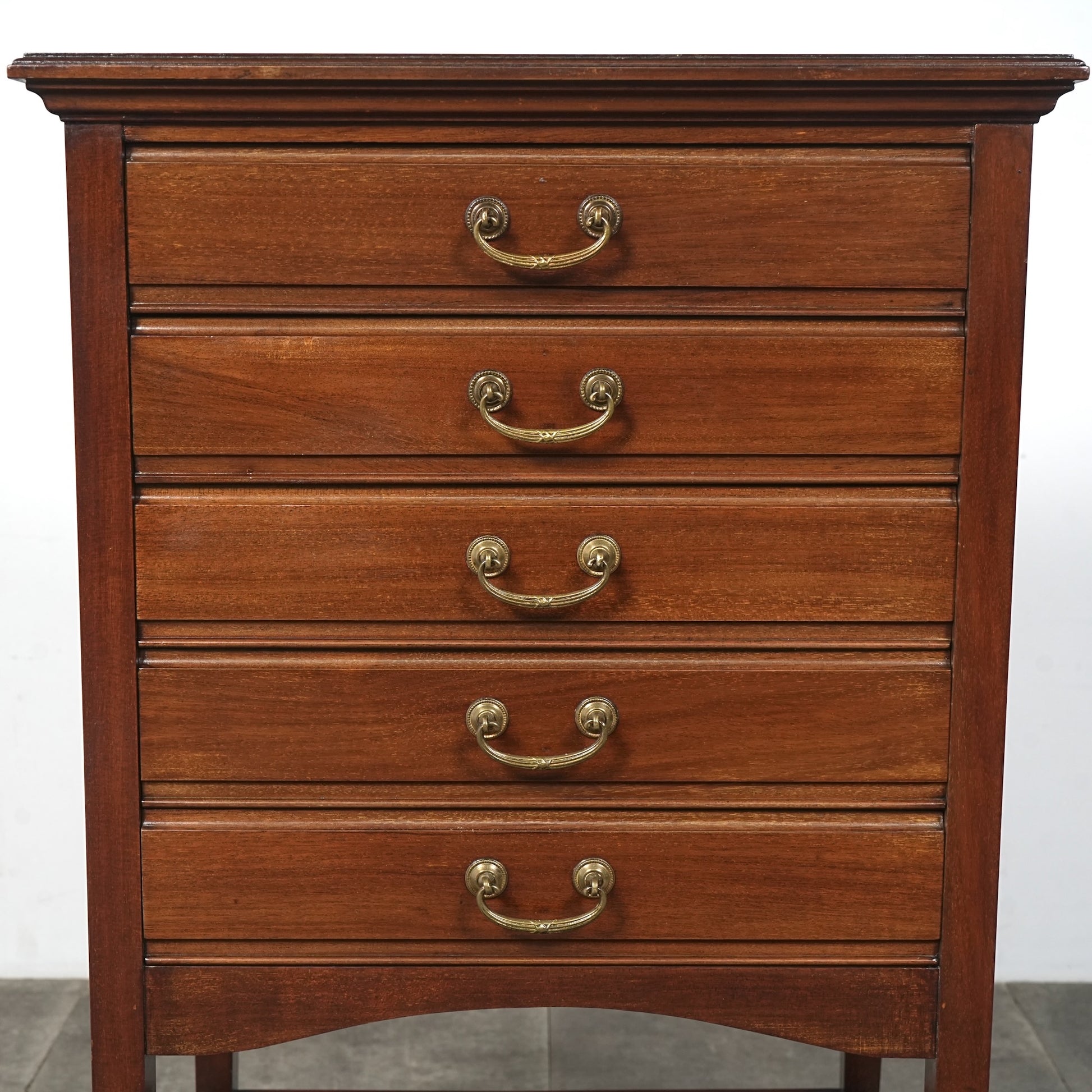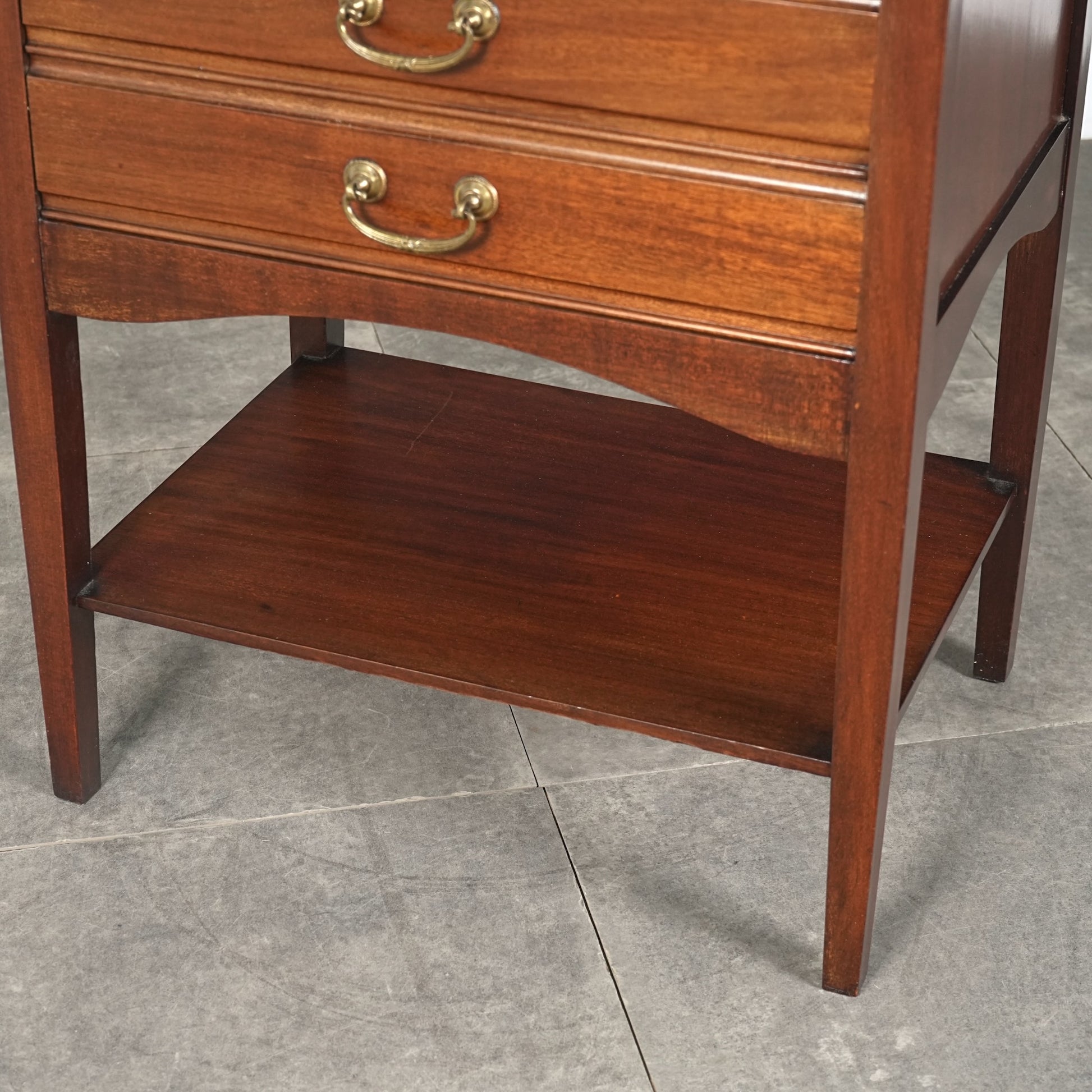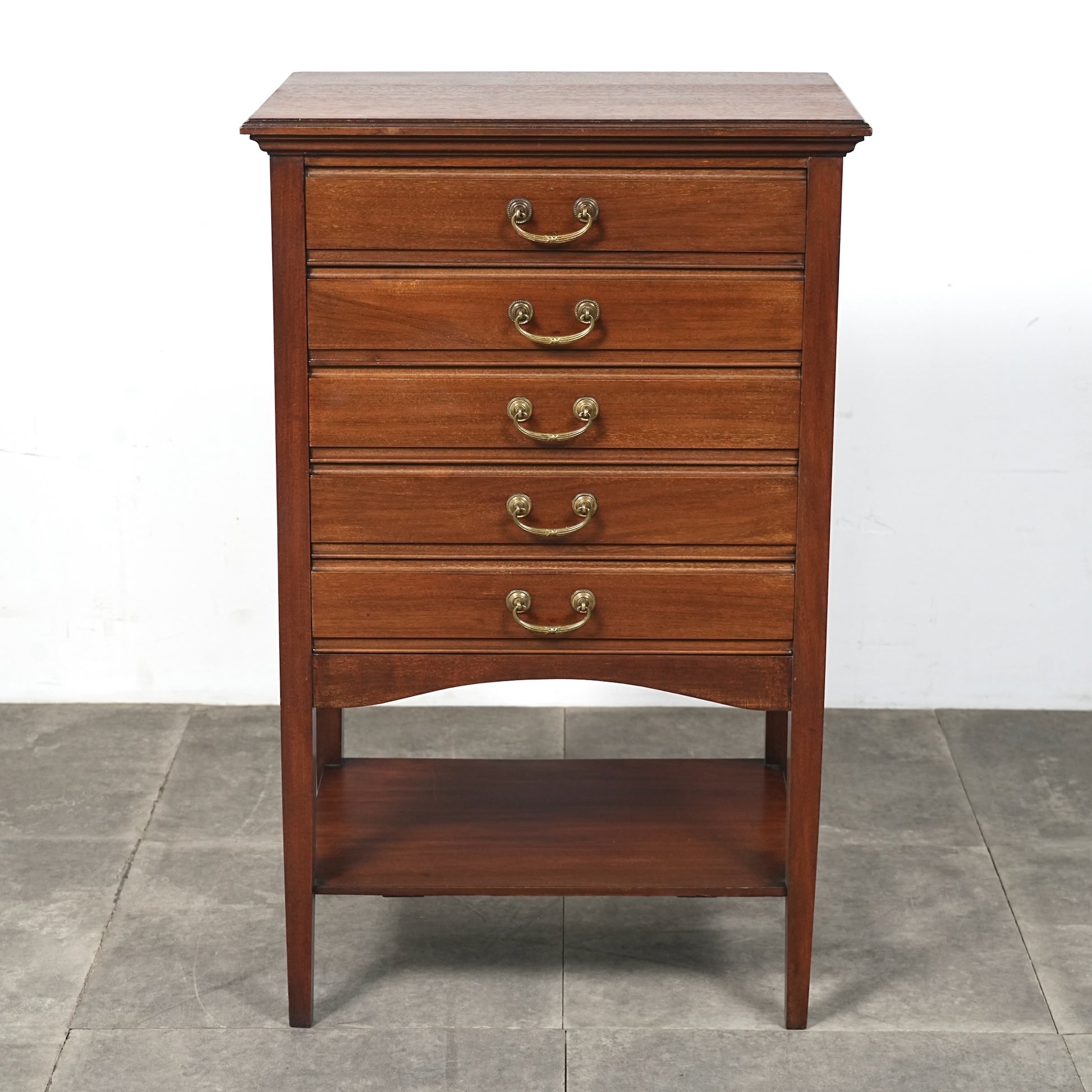 高品質なマホガニーならではの美しい質感が印象的で、シンプルながらも引き出し部分のユニークなギミックや可愛らしい取手が良いアクセントとなった、英国クラシック家具らしい上品な佇まい。