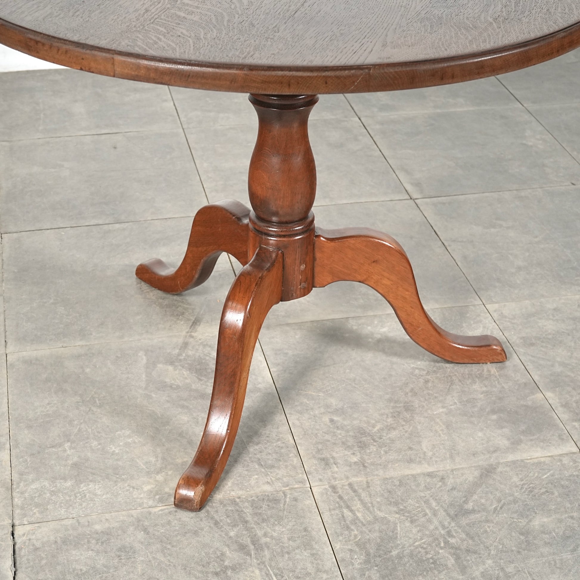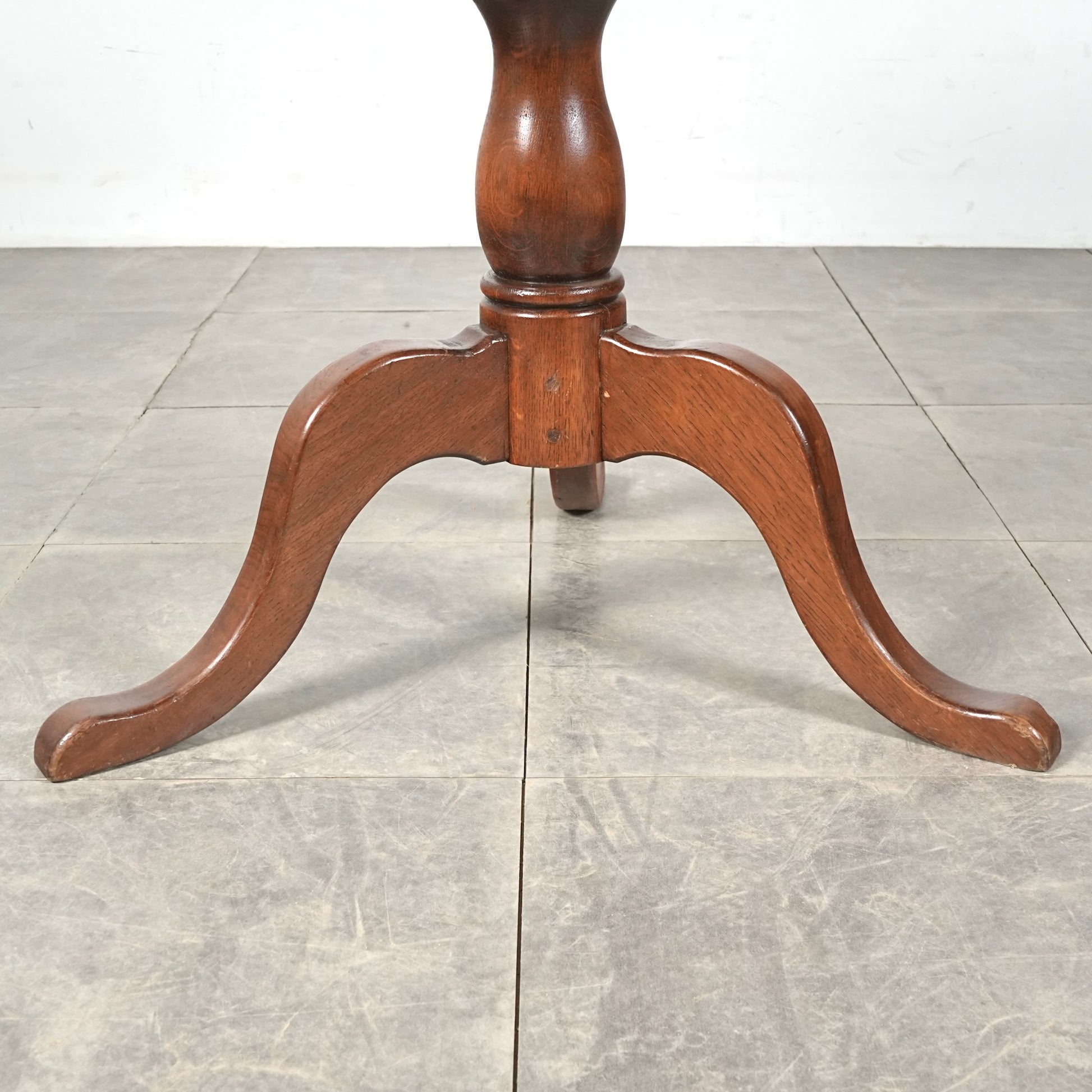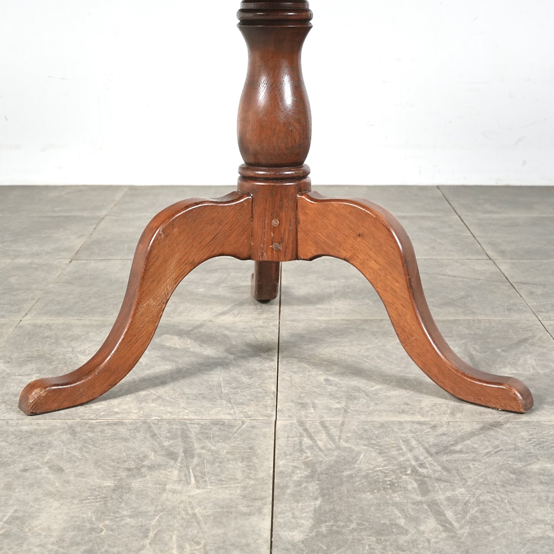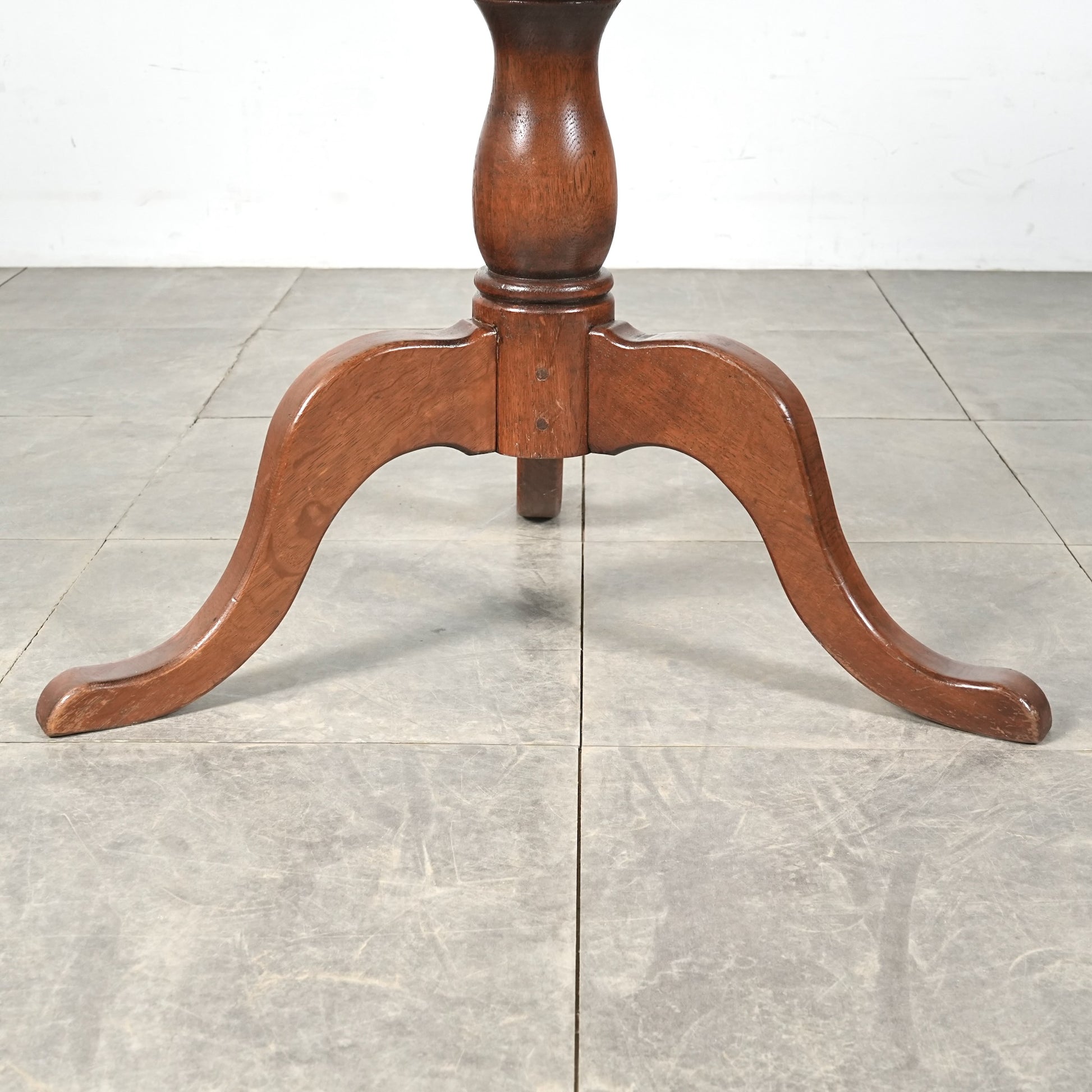 中央から伸びる挽物加工の脚部と、曲線を描く脚先がクラシカルな表情を生み、英国家具らしい品の良さを感じさせます。