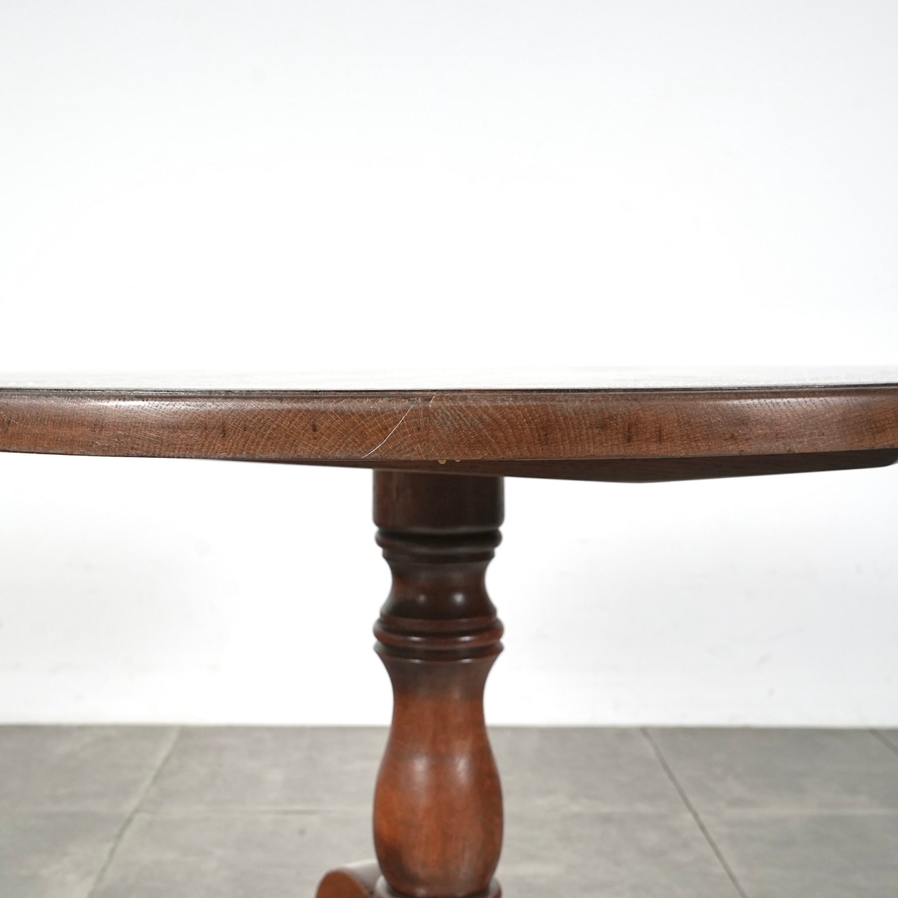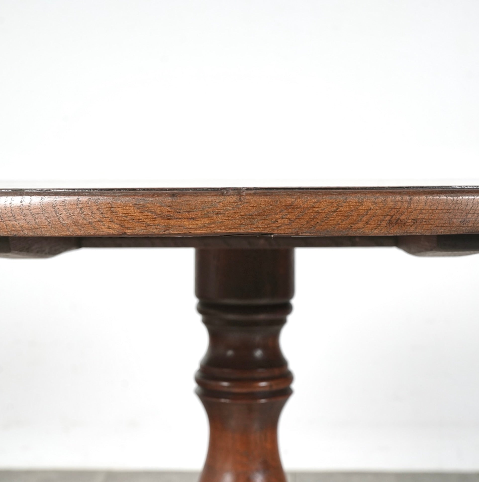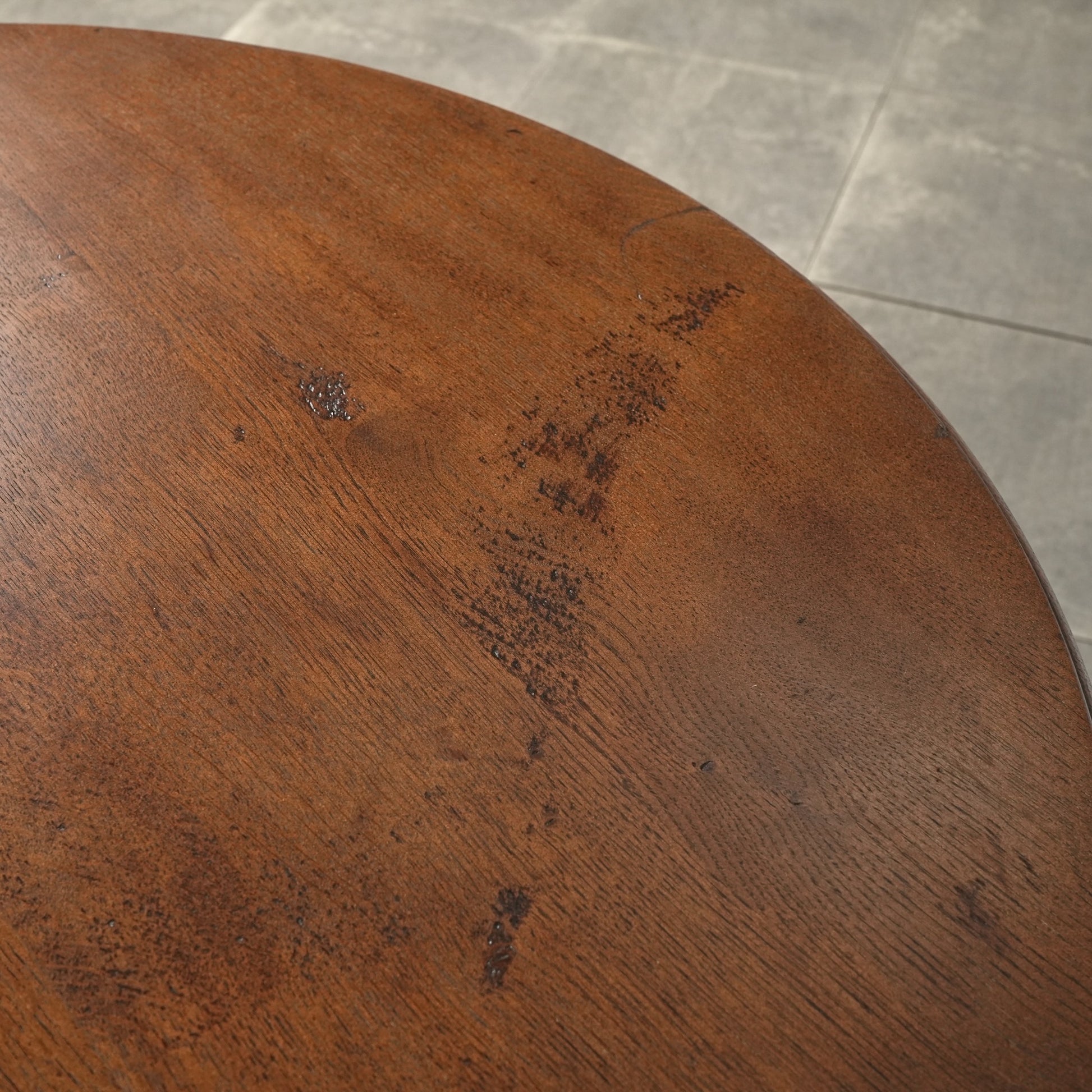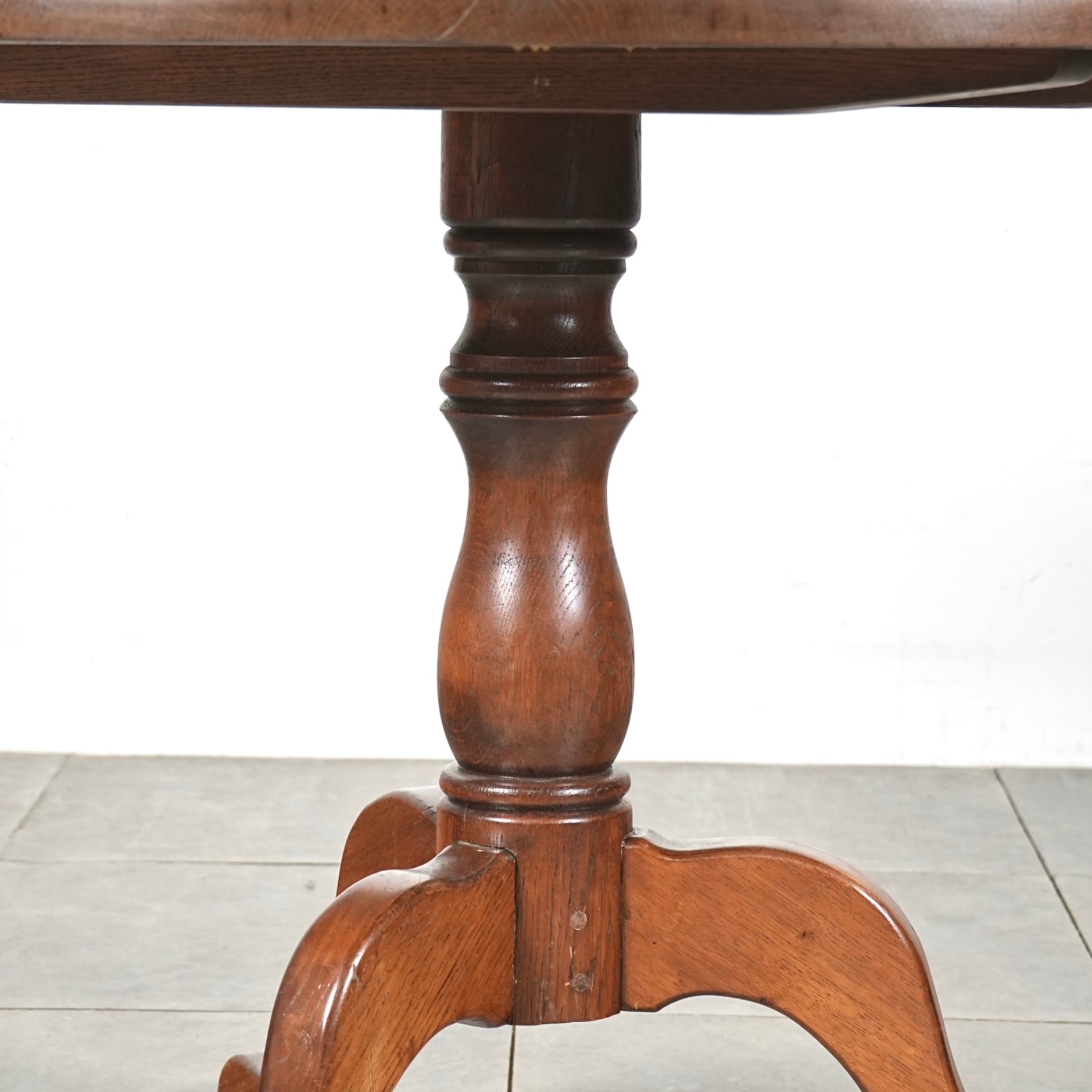 中央から伸びる挽物加工の脚部と、曲線を描く脚先がクラシカルな表情を生み、英国家具らしい品の良さを感じさせます。