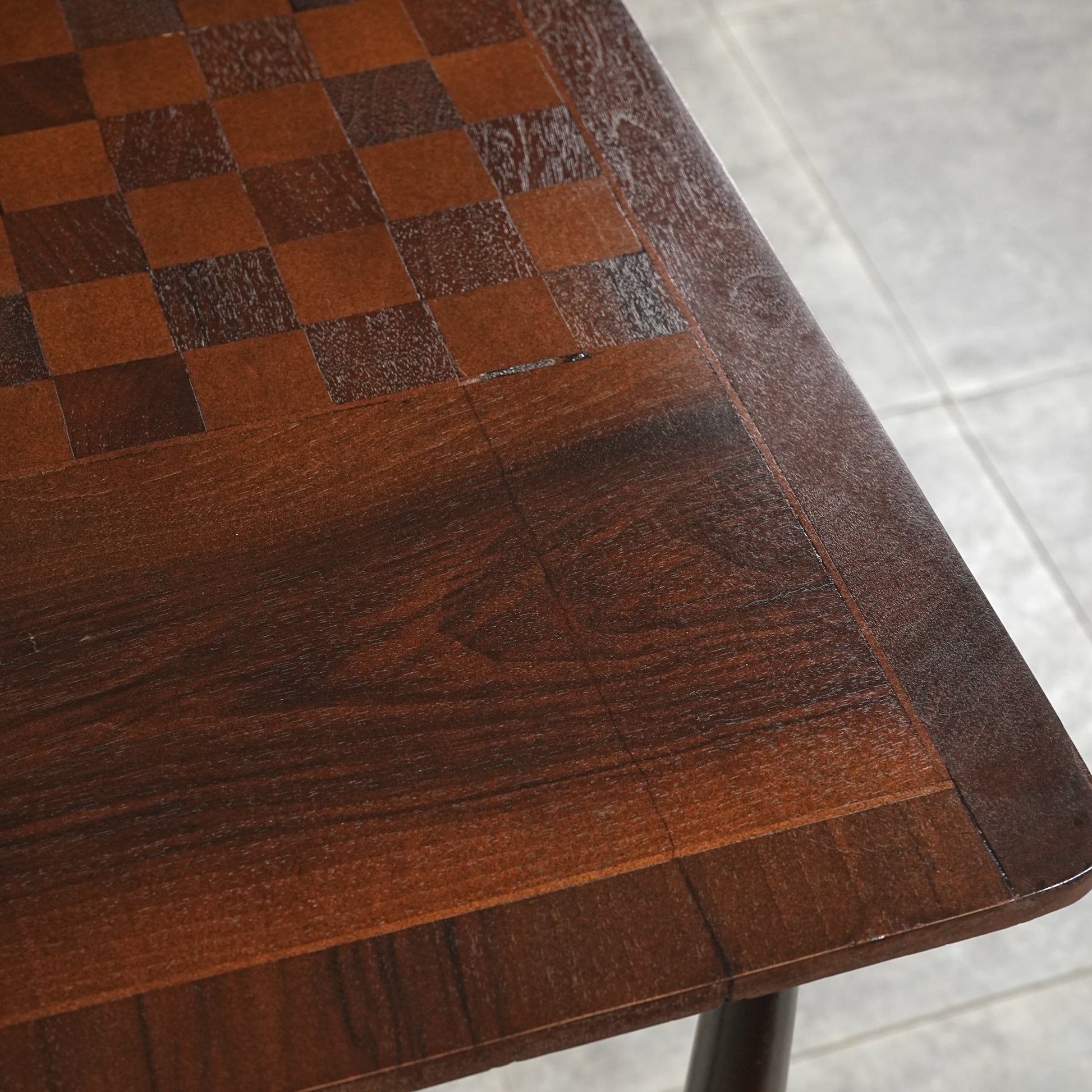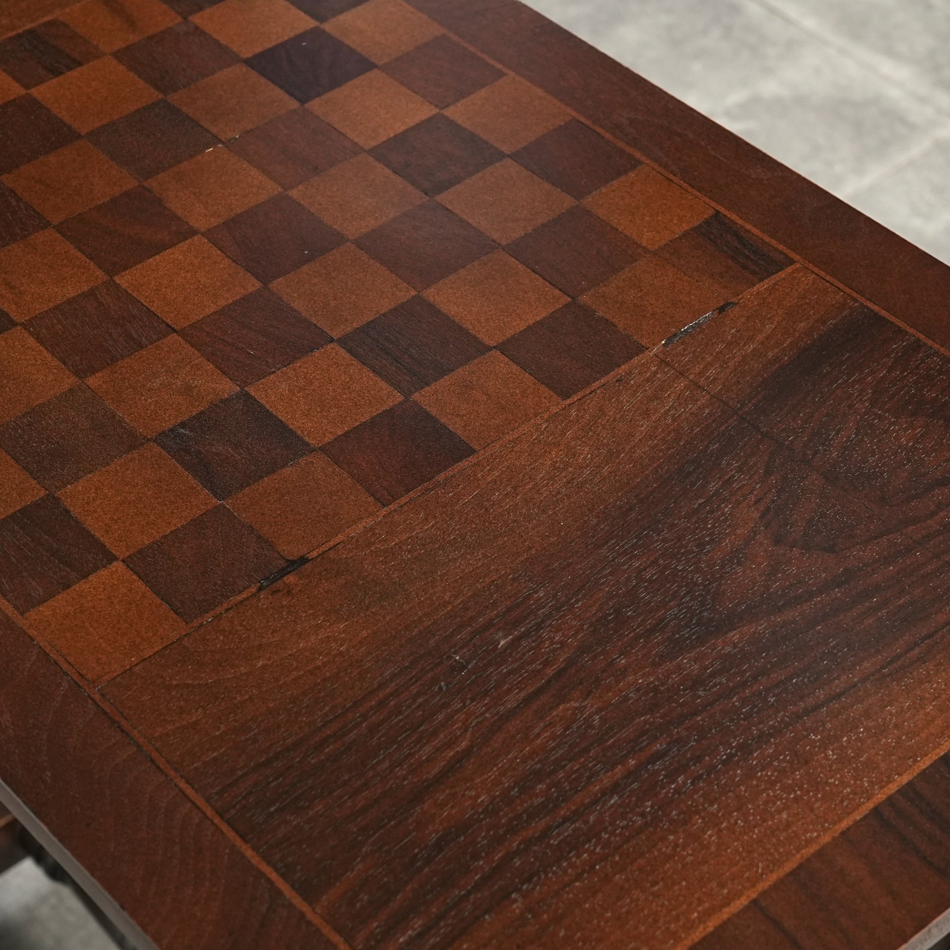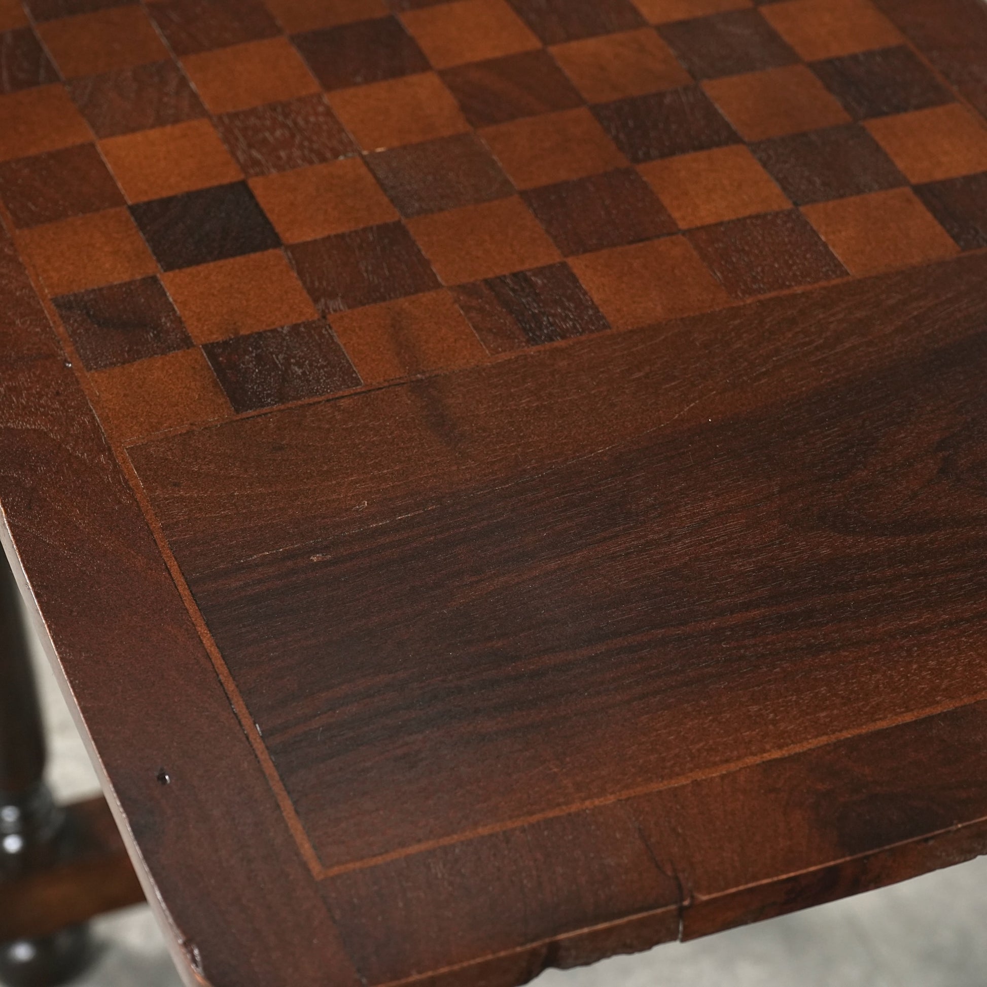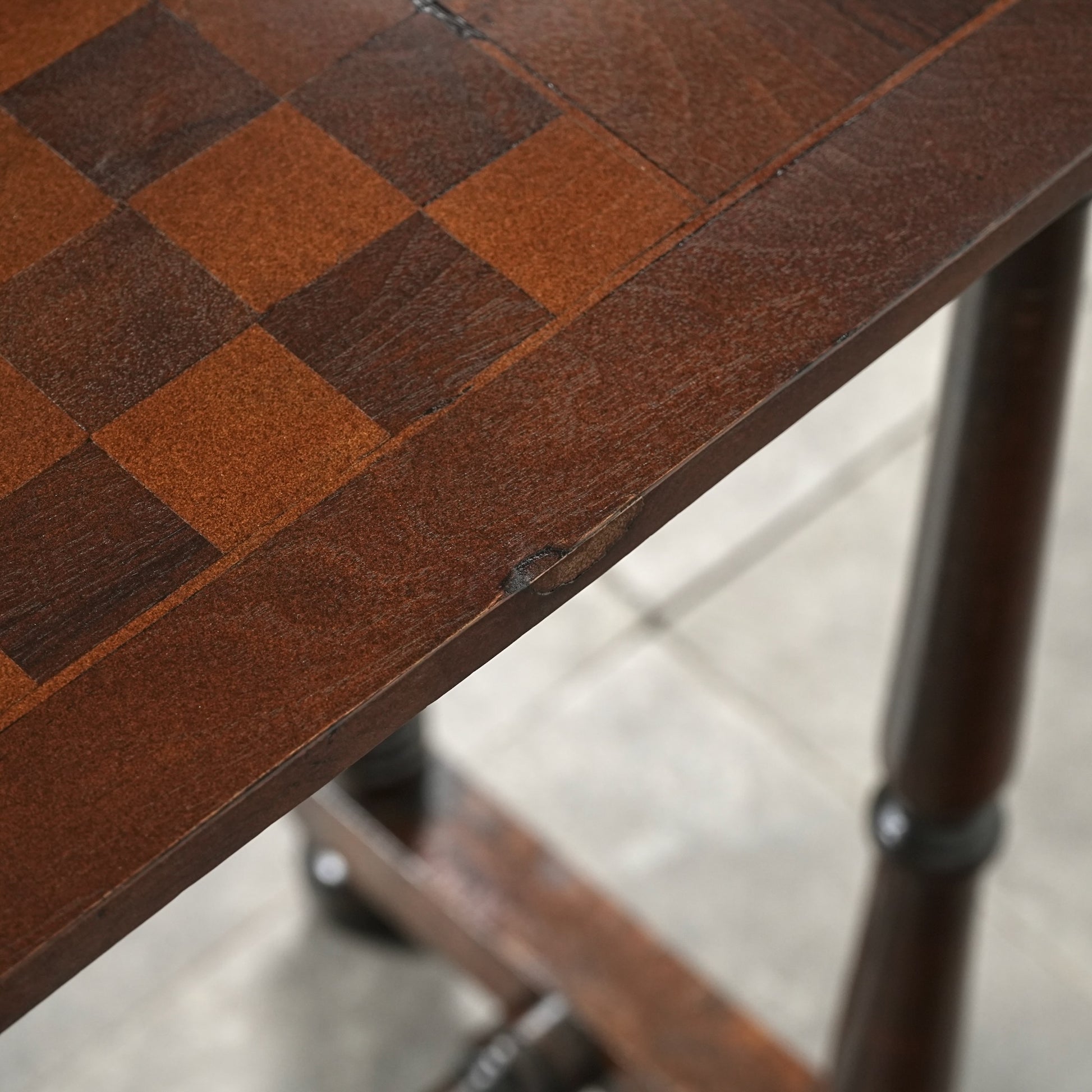 寄木細工で施された天板のチェスボード模様が印象的で、当時の職人の丁寧な作業が光ります。