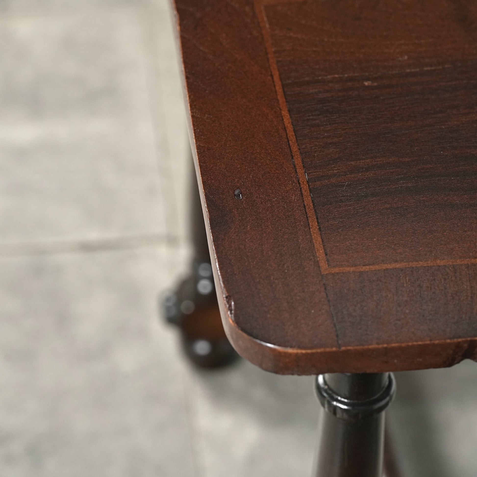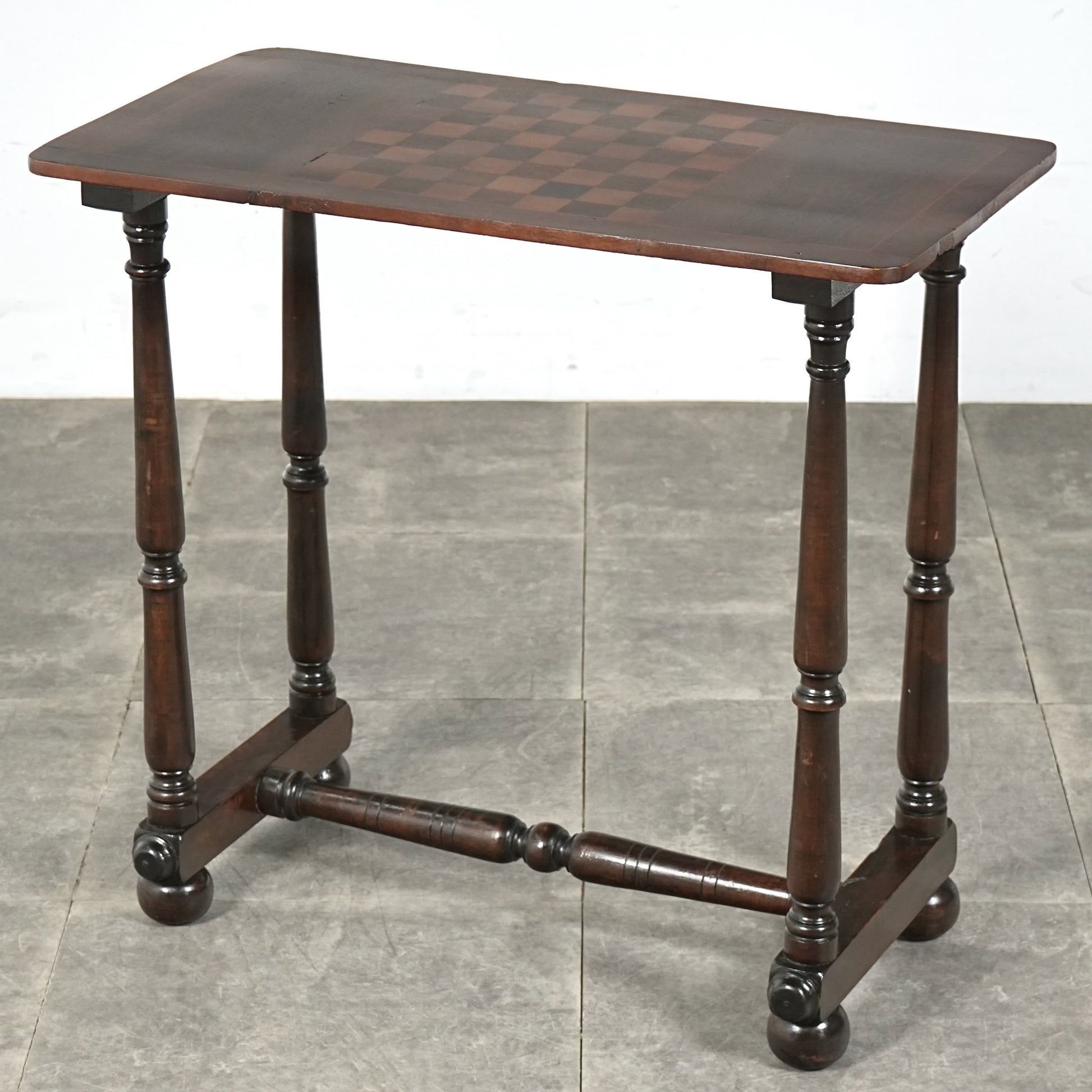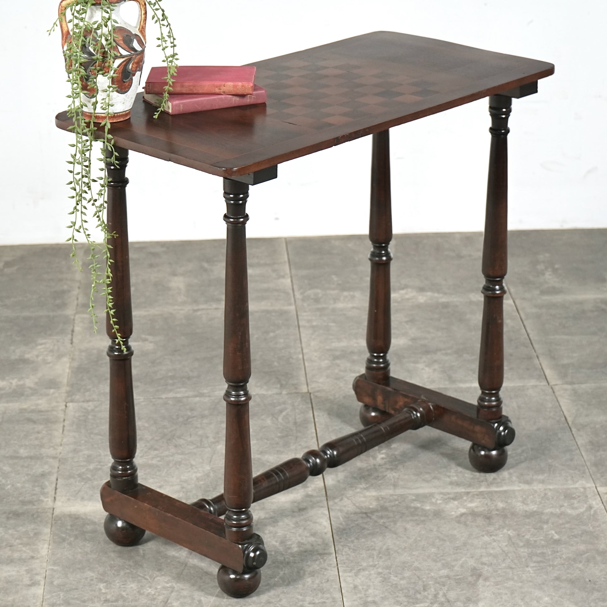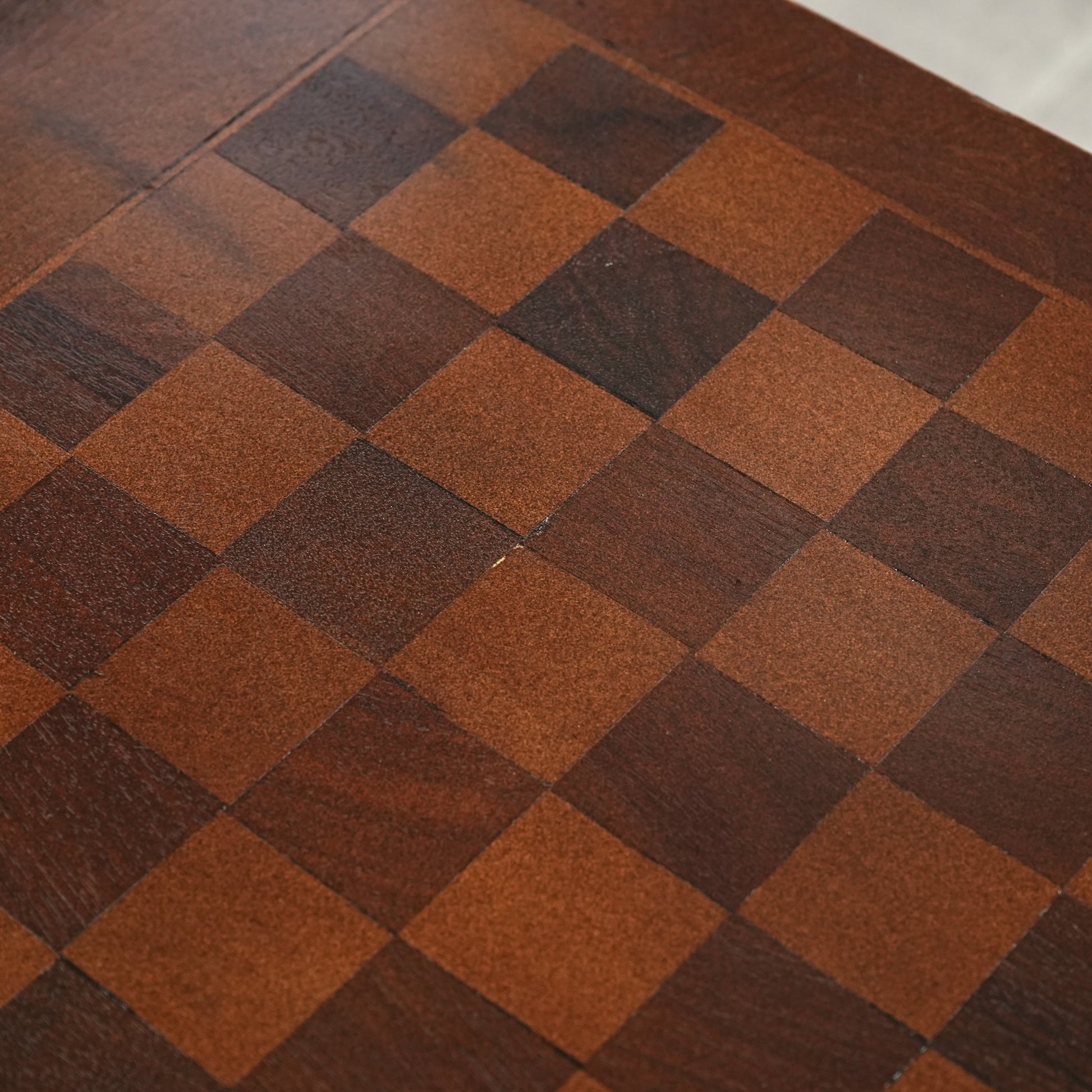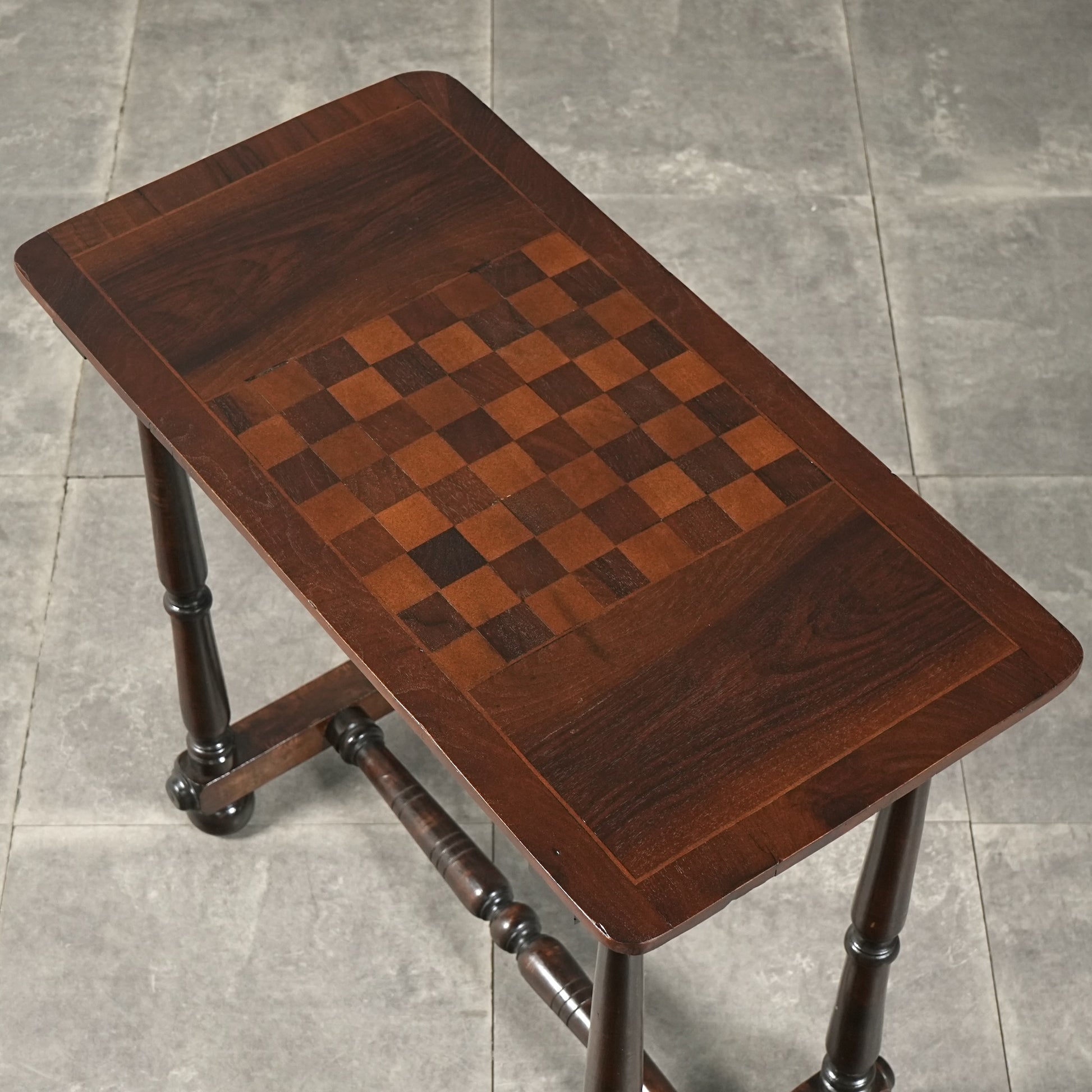 寄木細工で施された天板のチェスボード模様が印象的で、当時の職人の丁寧な作業が光ります。