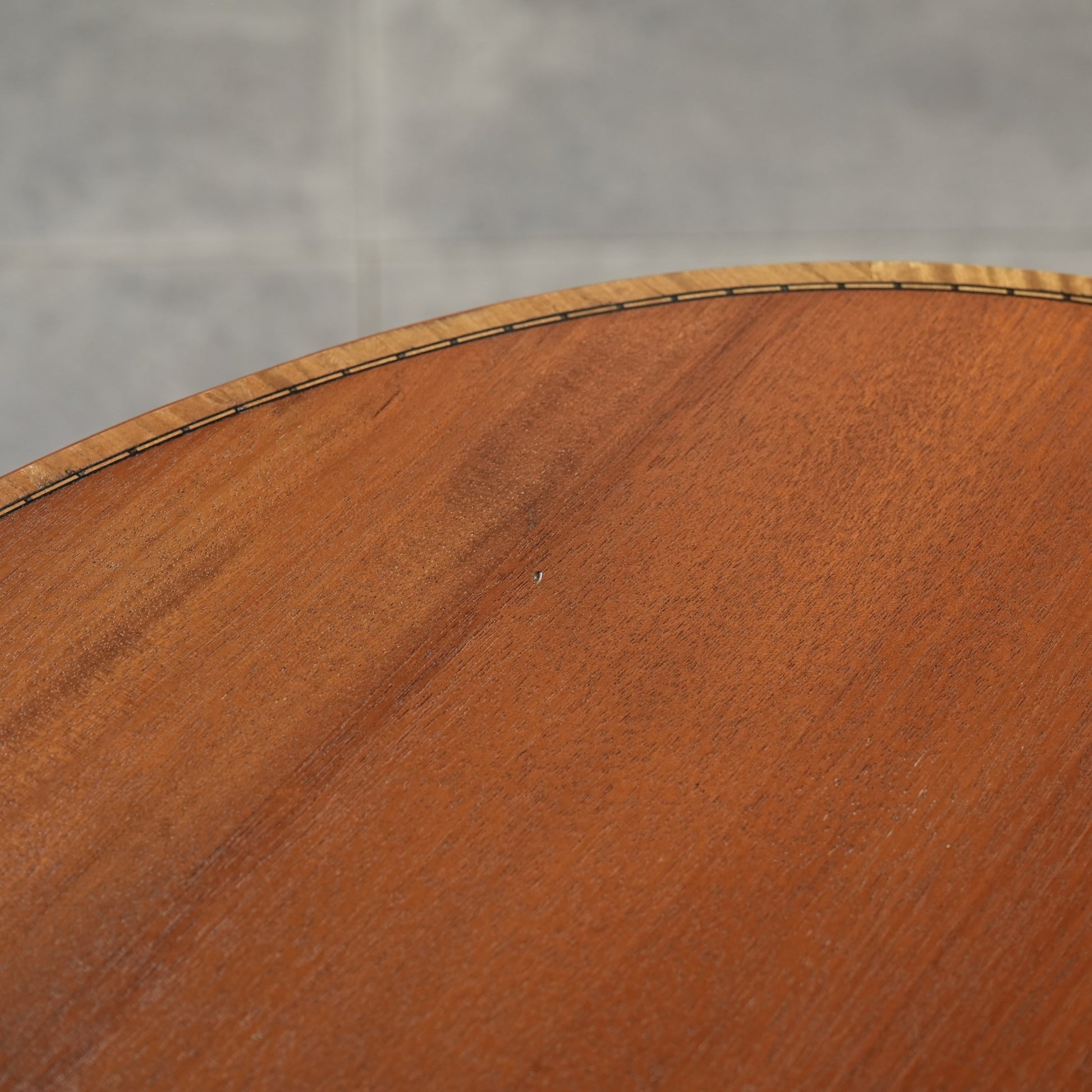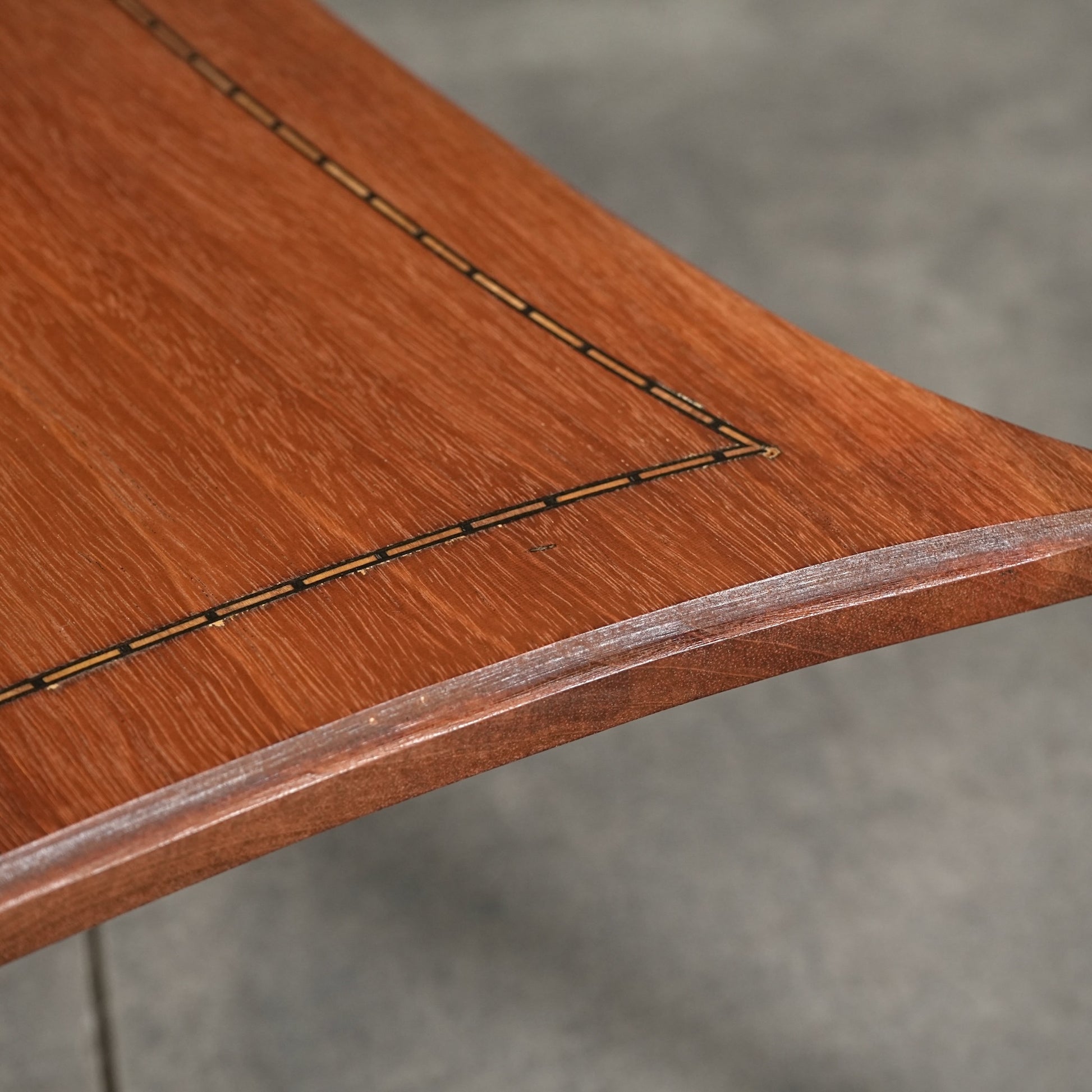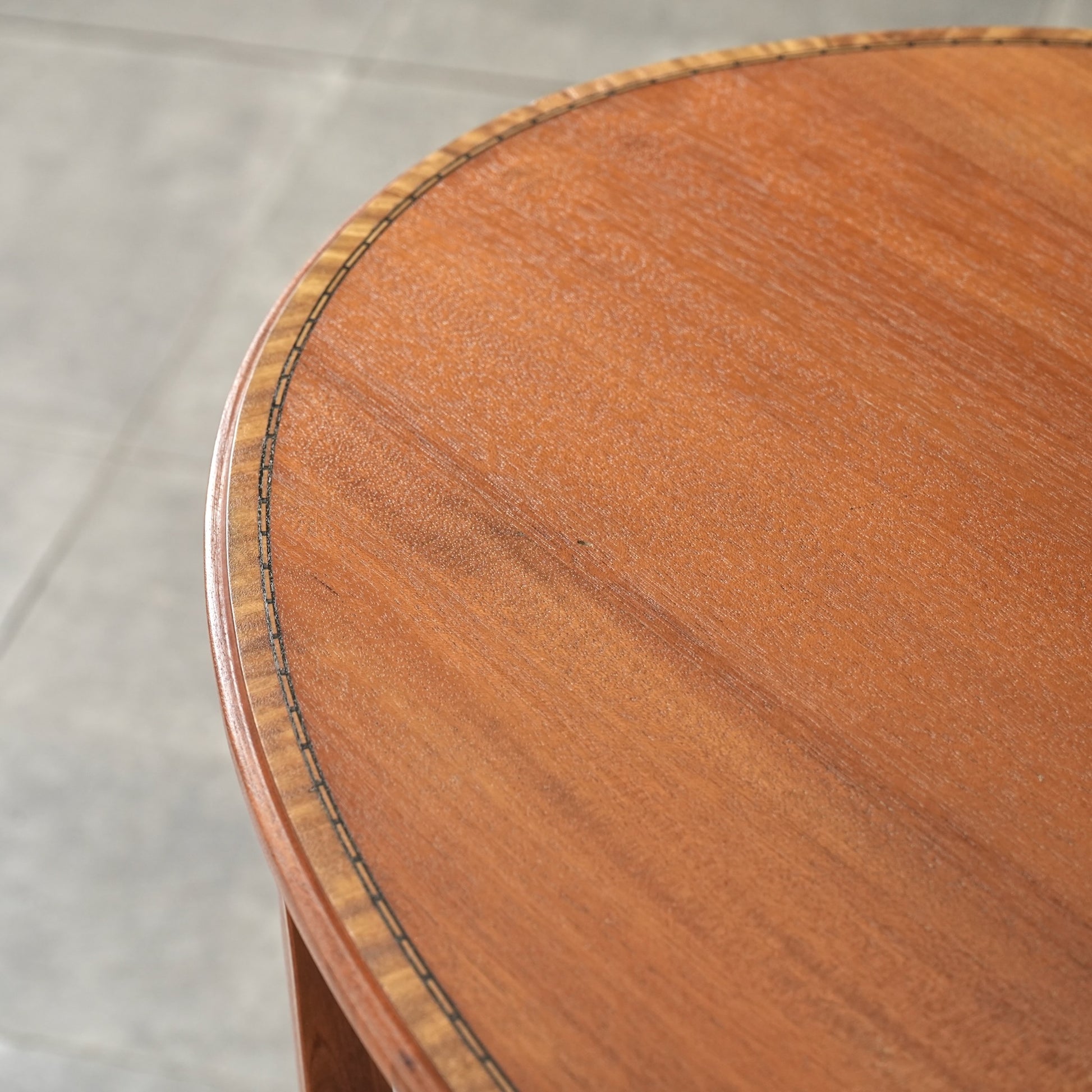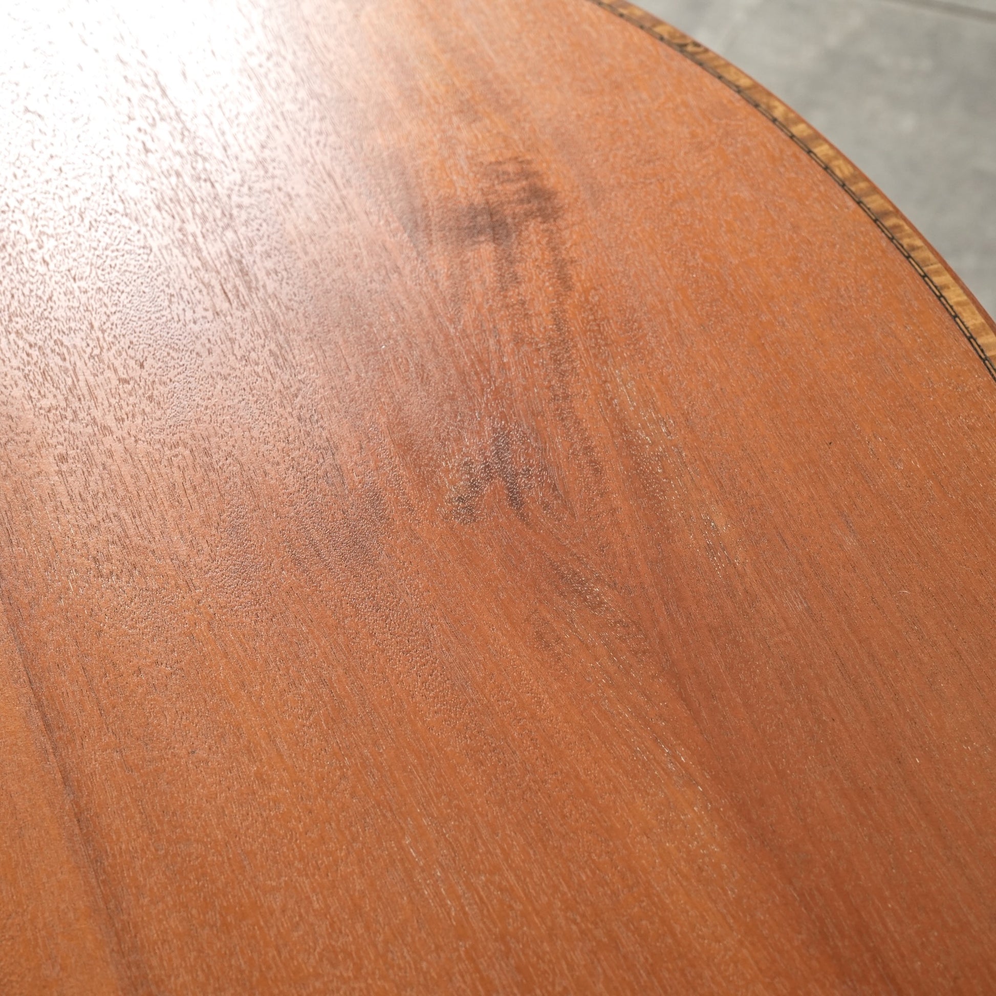 シンプルで上品な佇まいの中に、三大銘木マホガニーの美しい質感や脚部の美しいラインが程よいアクセントとなっており、天板や幕板には繊細なインレイ(象嵌細工)が施されています。