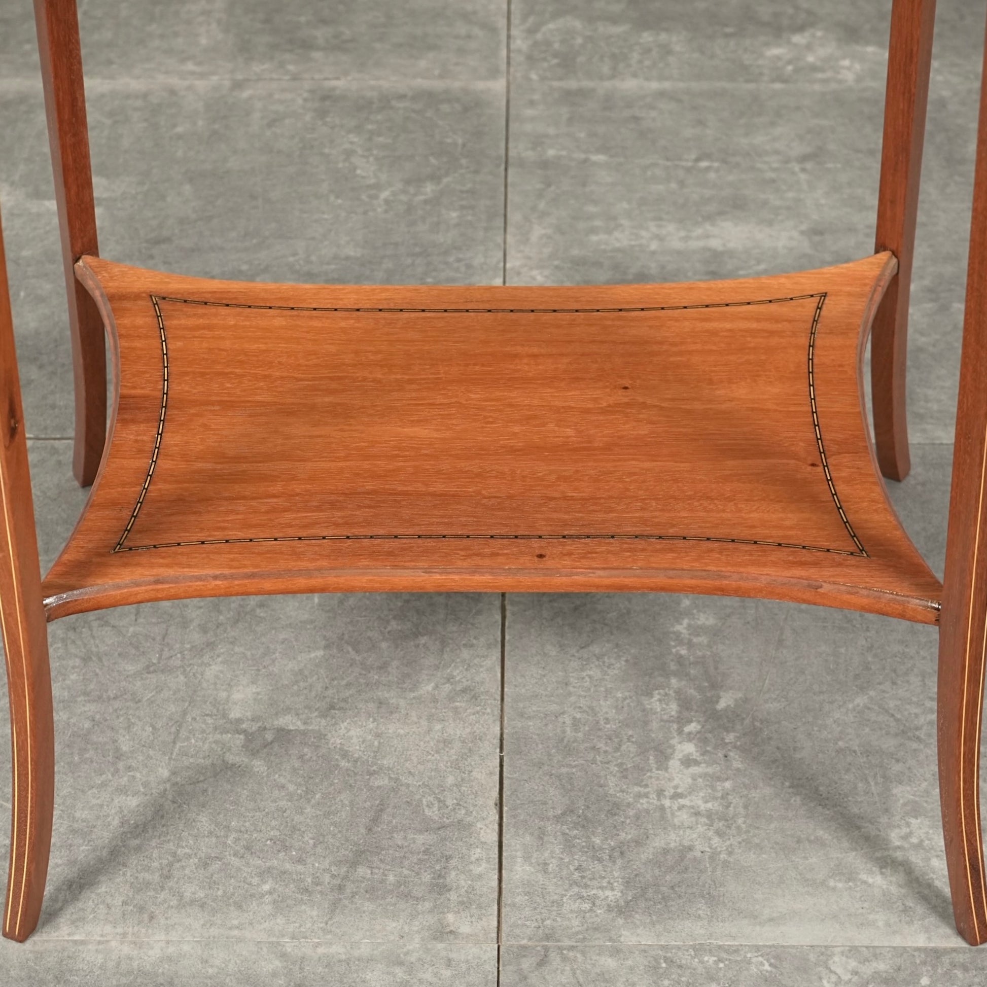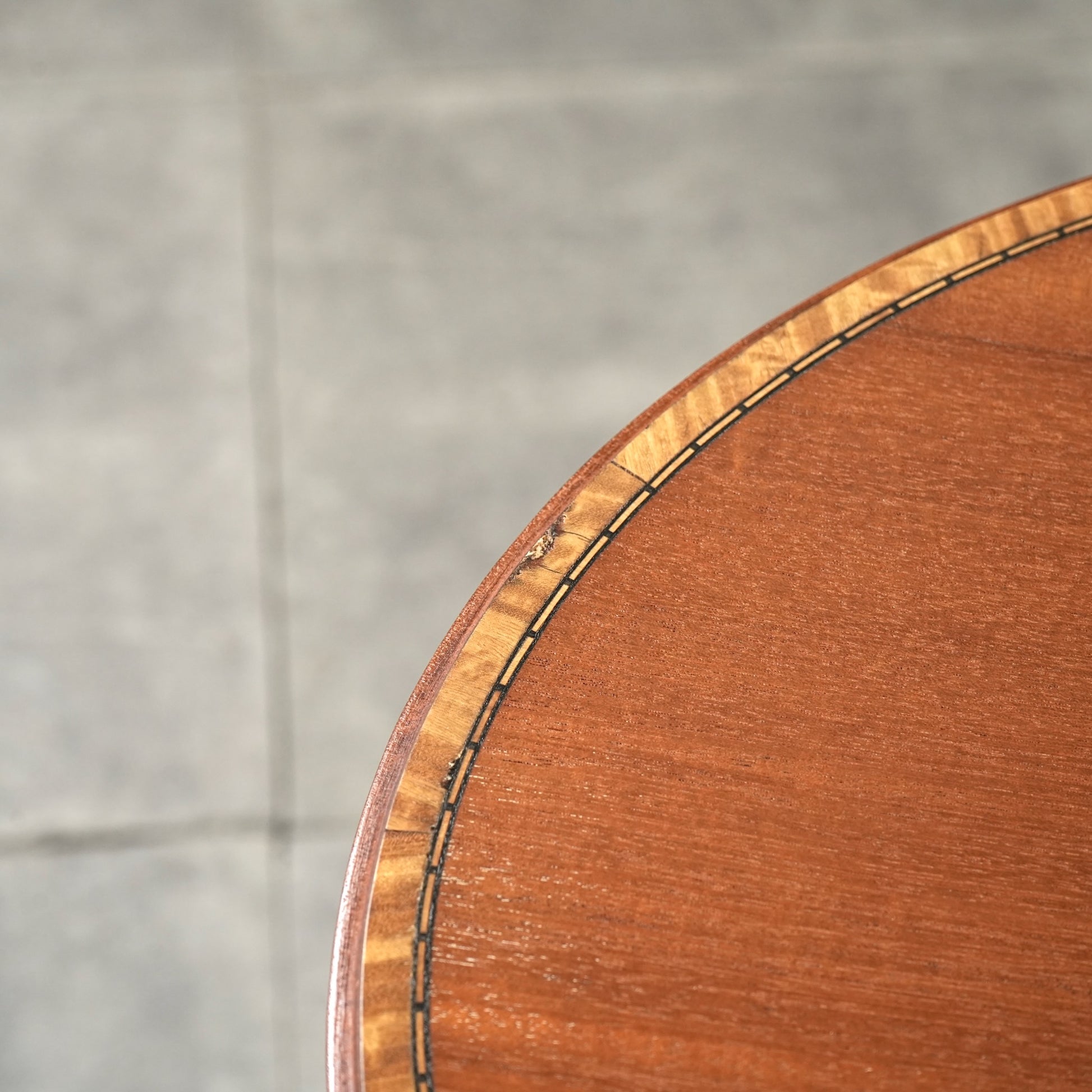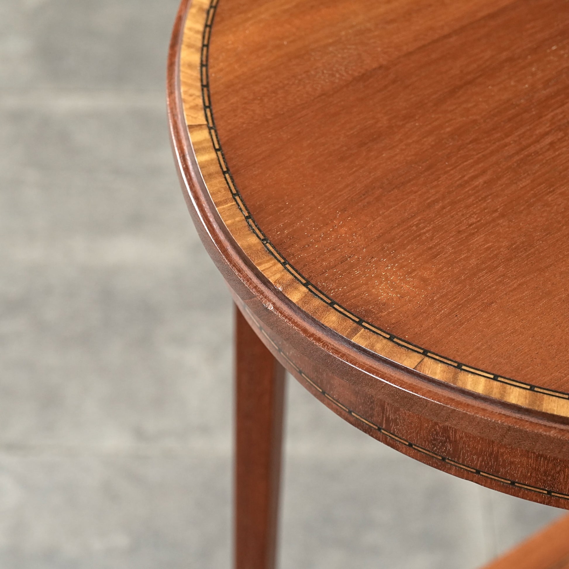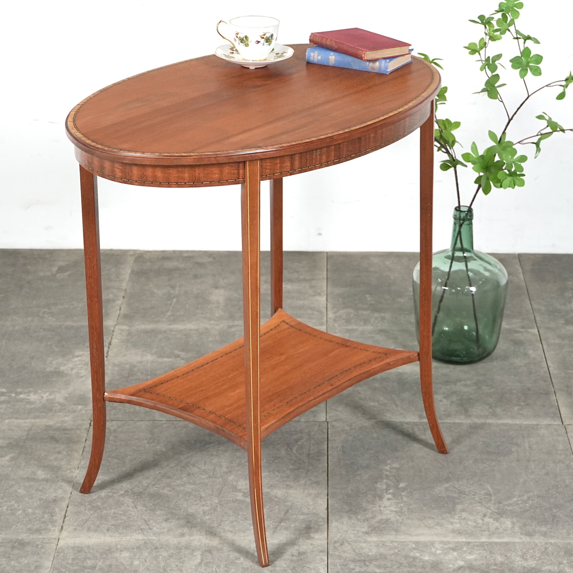 シンプルで上品な佇まいの中に、三大銘木マホガニーの美しい質感や脚部の美しいラインが程よいアクセントとなっており、天板や幕板には繊細なインレイ(象嵌細工)が施されています。