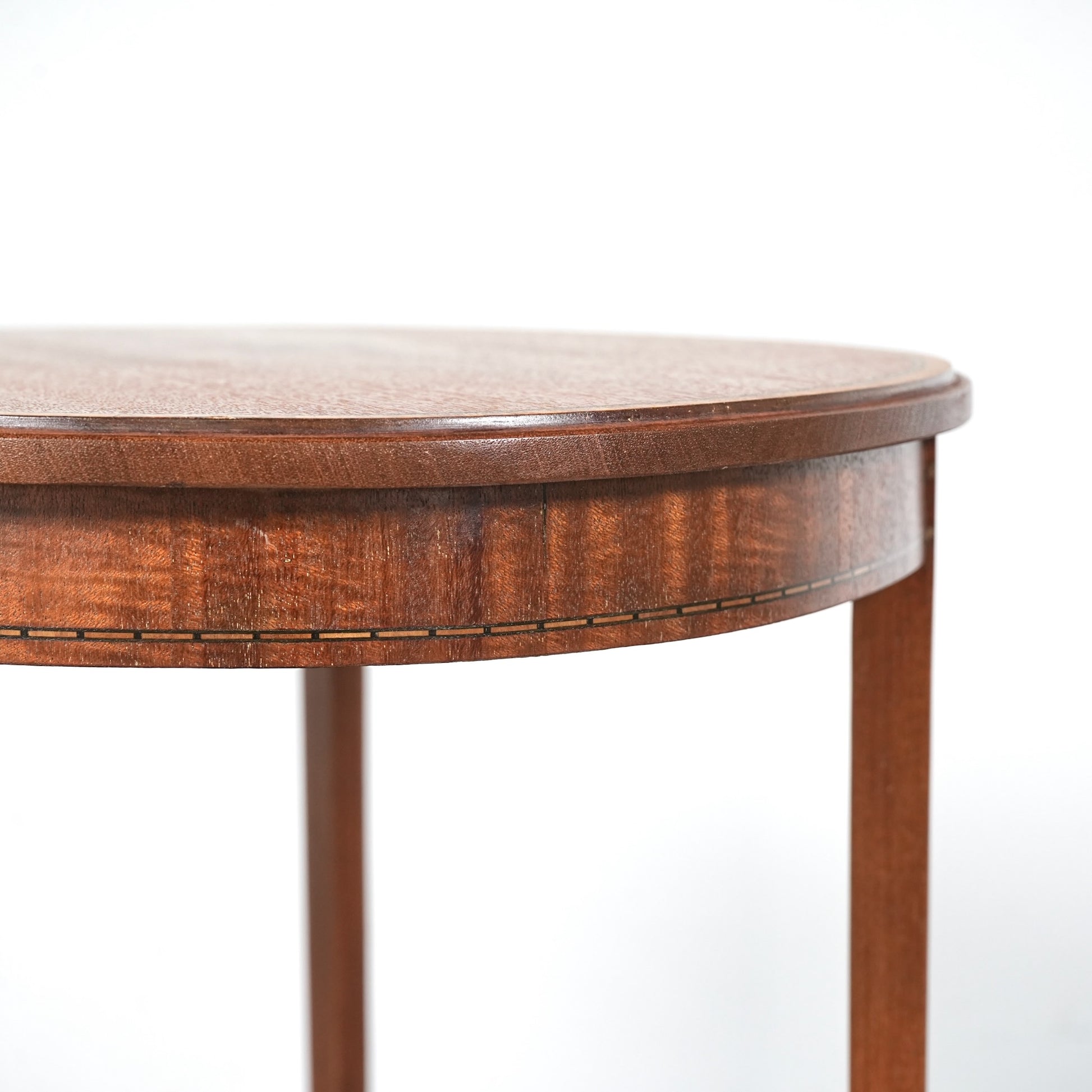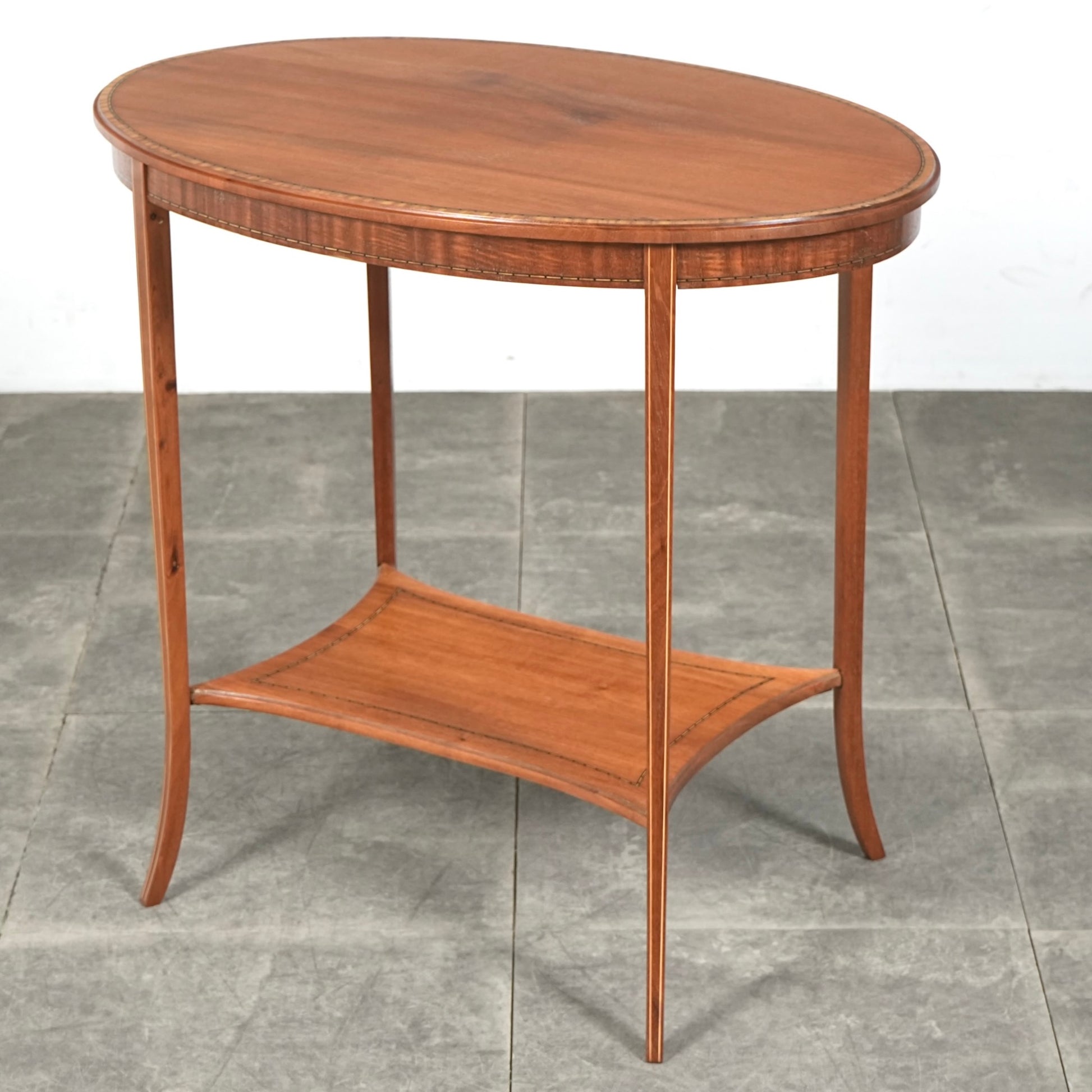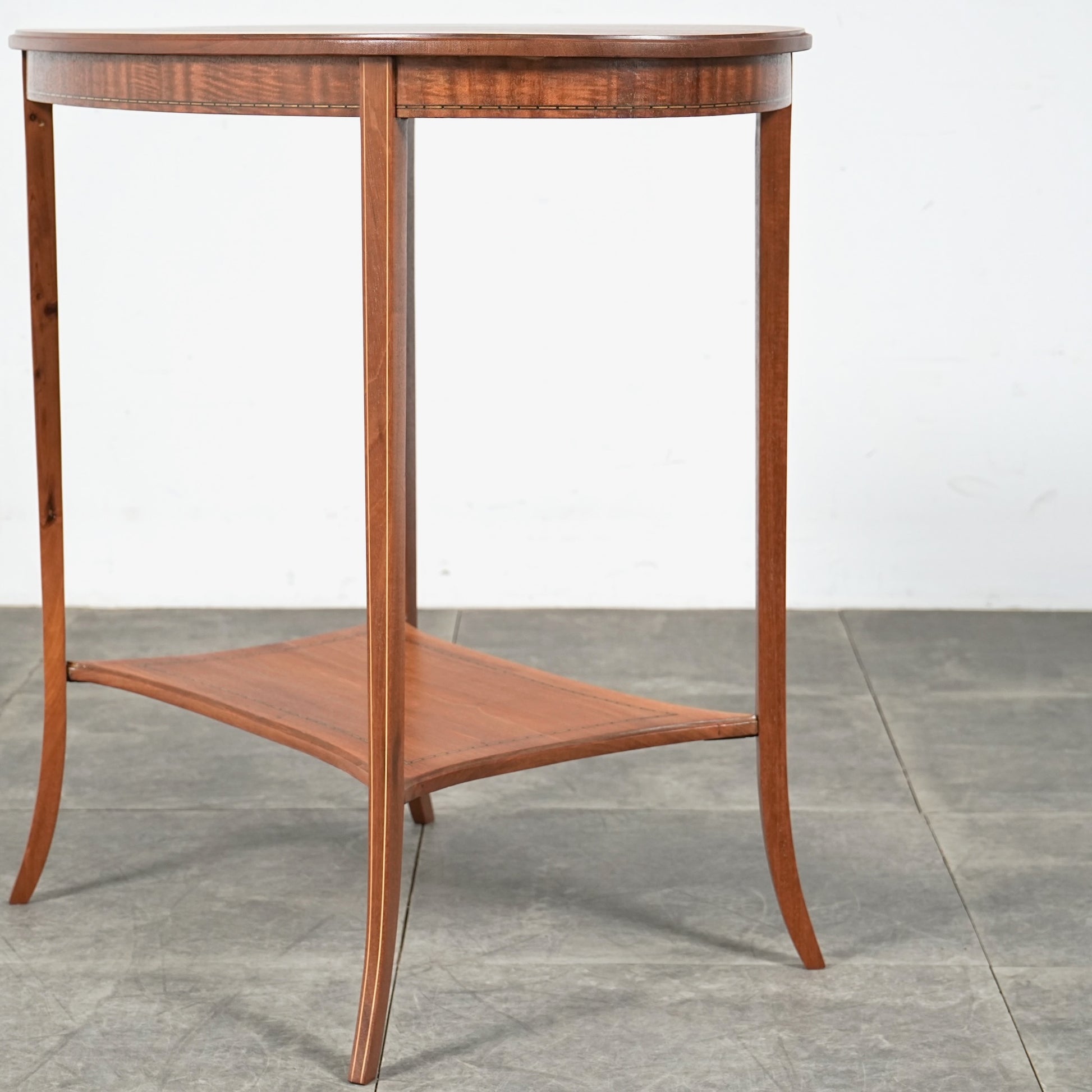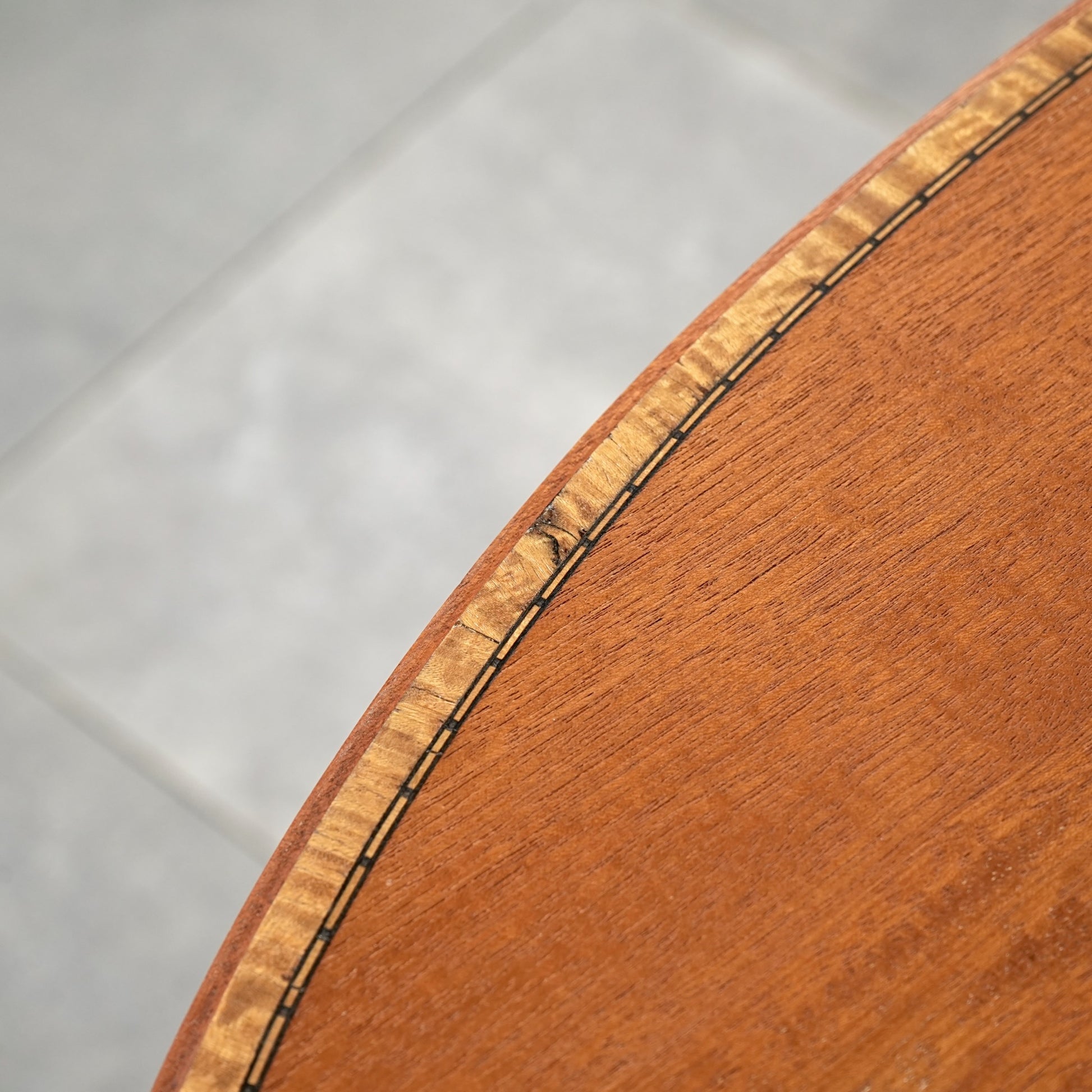 シンプルで上品な佇まいの中に、三大銘木マホガニーの美しい質感や脚部の美しいラインが程よいアクセントとなっており、天板や幕板には繊細なインレイ(象嵌細工)が施されています。