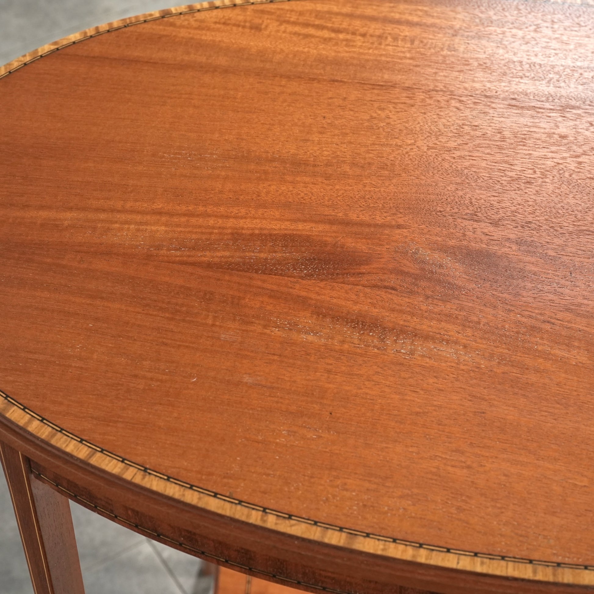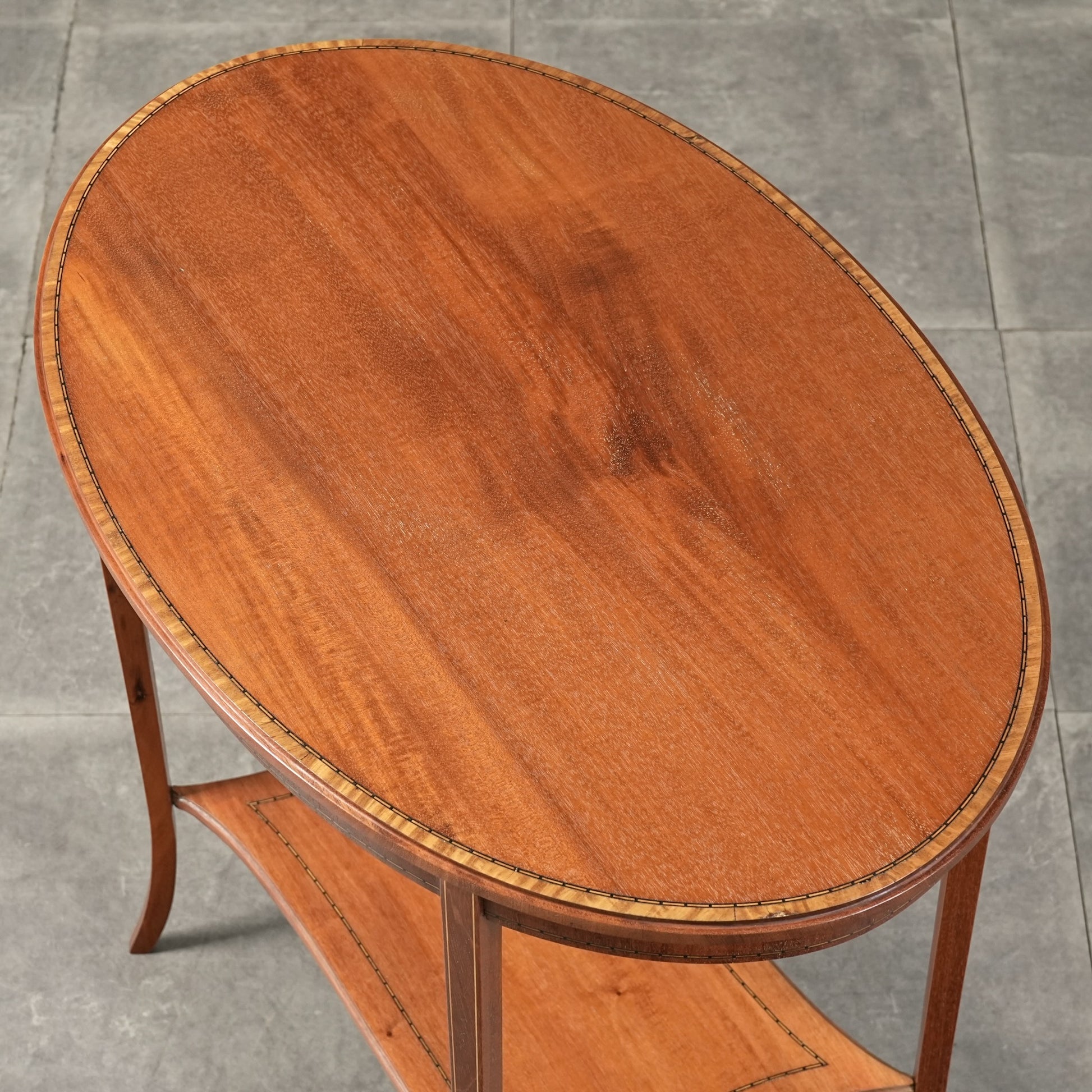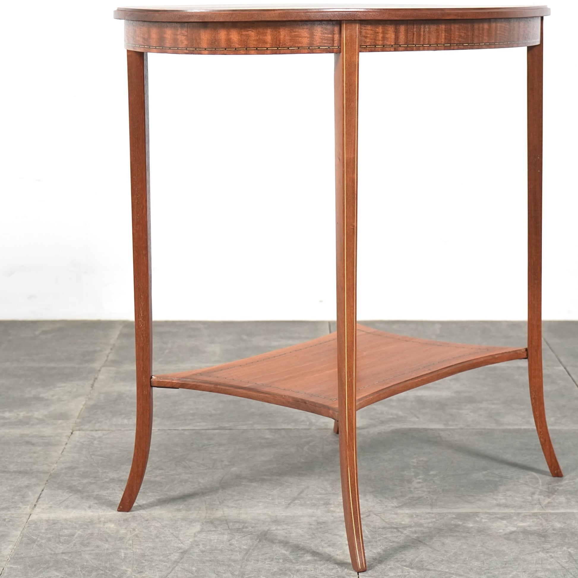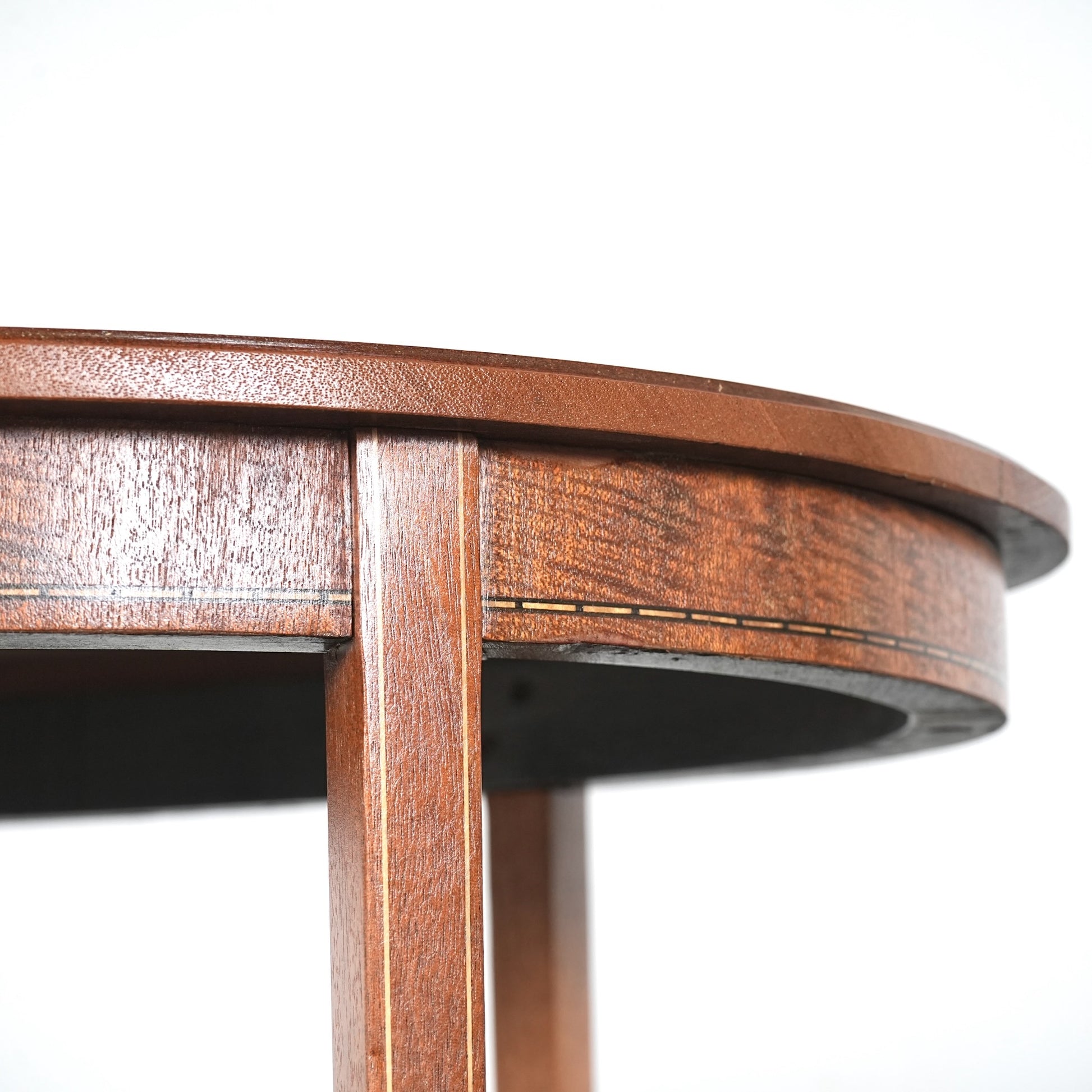シンプルで上品な佇まいの中に、三大銘木マホガニーの美しい質感や脚部の美しいラインが程よいアクセントとなっており、天板や幕板には繊細なインレイ(象嵌細工)が施されています。