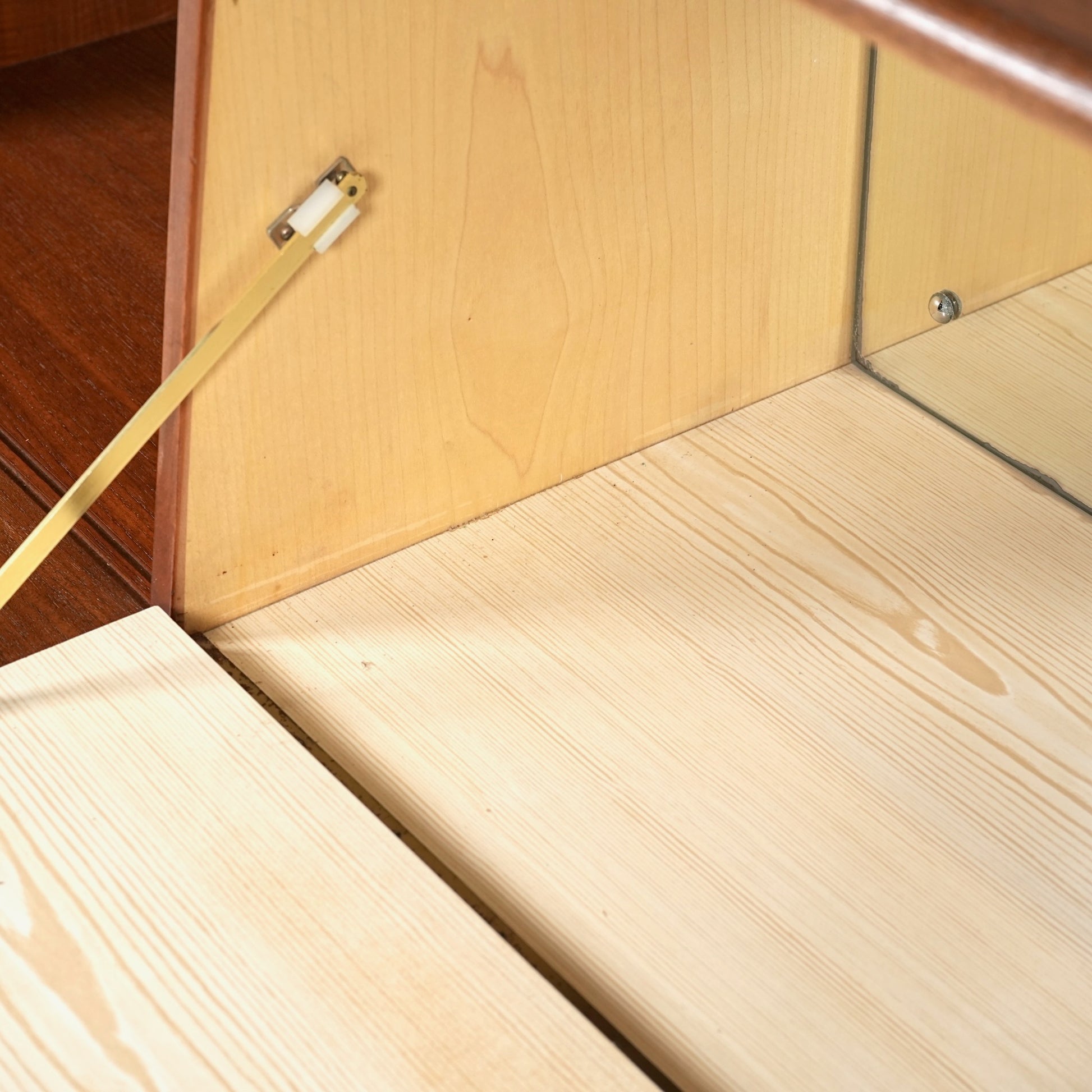 上質なチーク材を使用しており、左右対称でバランスの取れたデザインの中に、削り出しで作られた可愛らしい取手がアクセントとして良い仕事をしています。