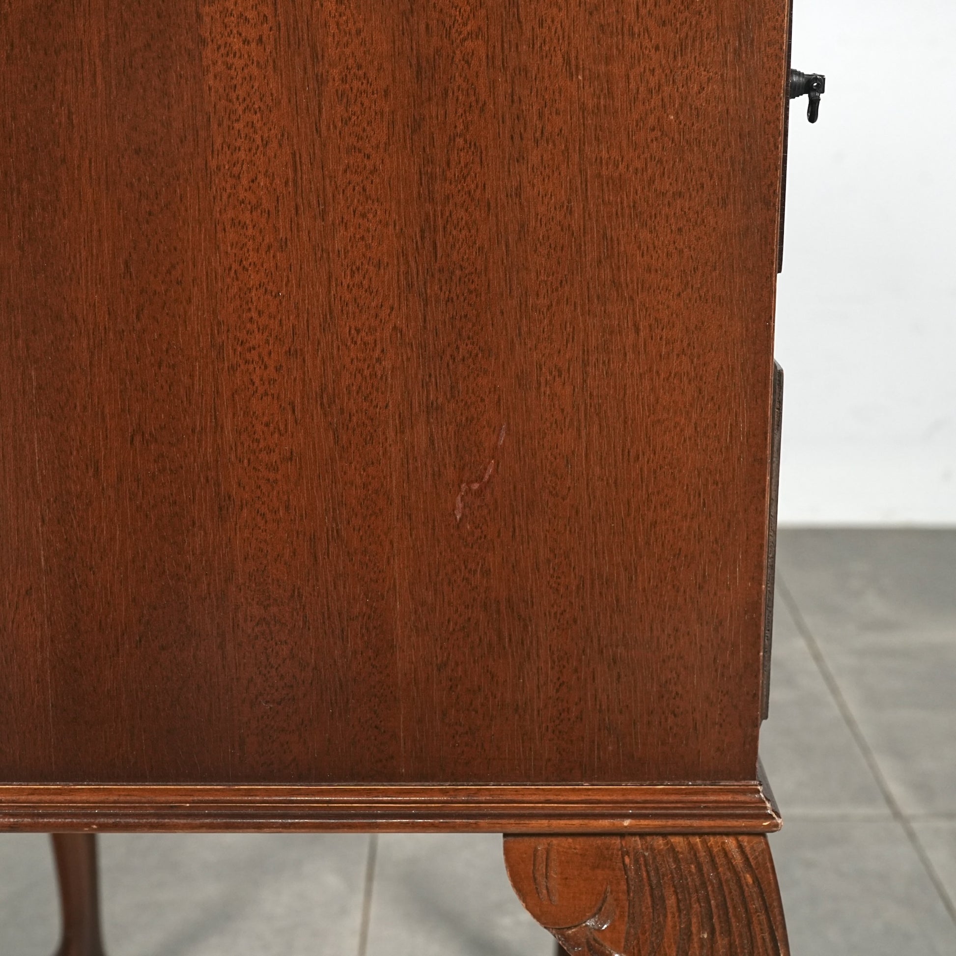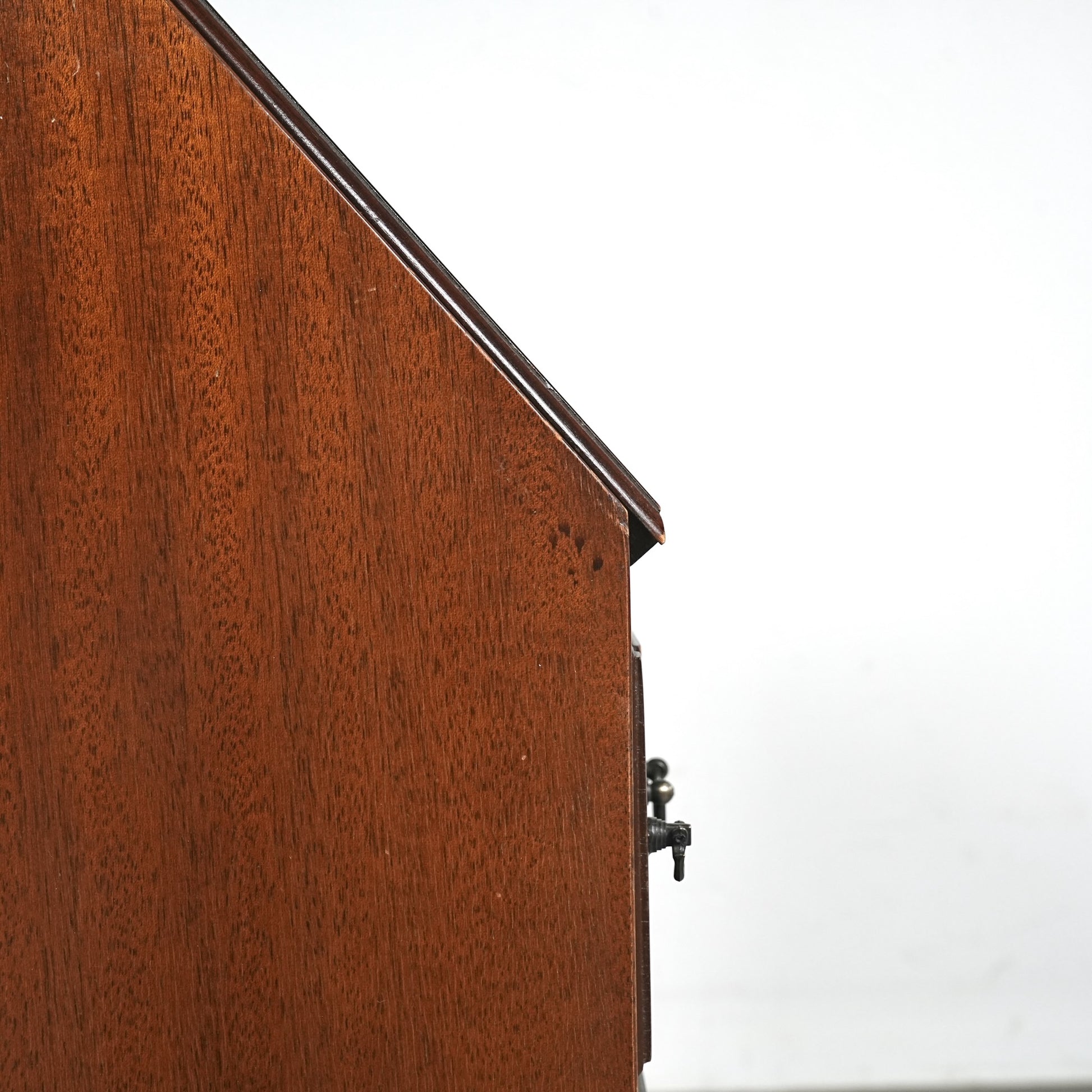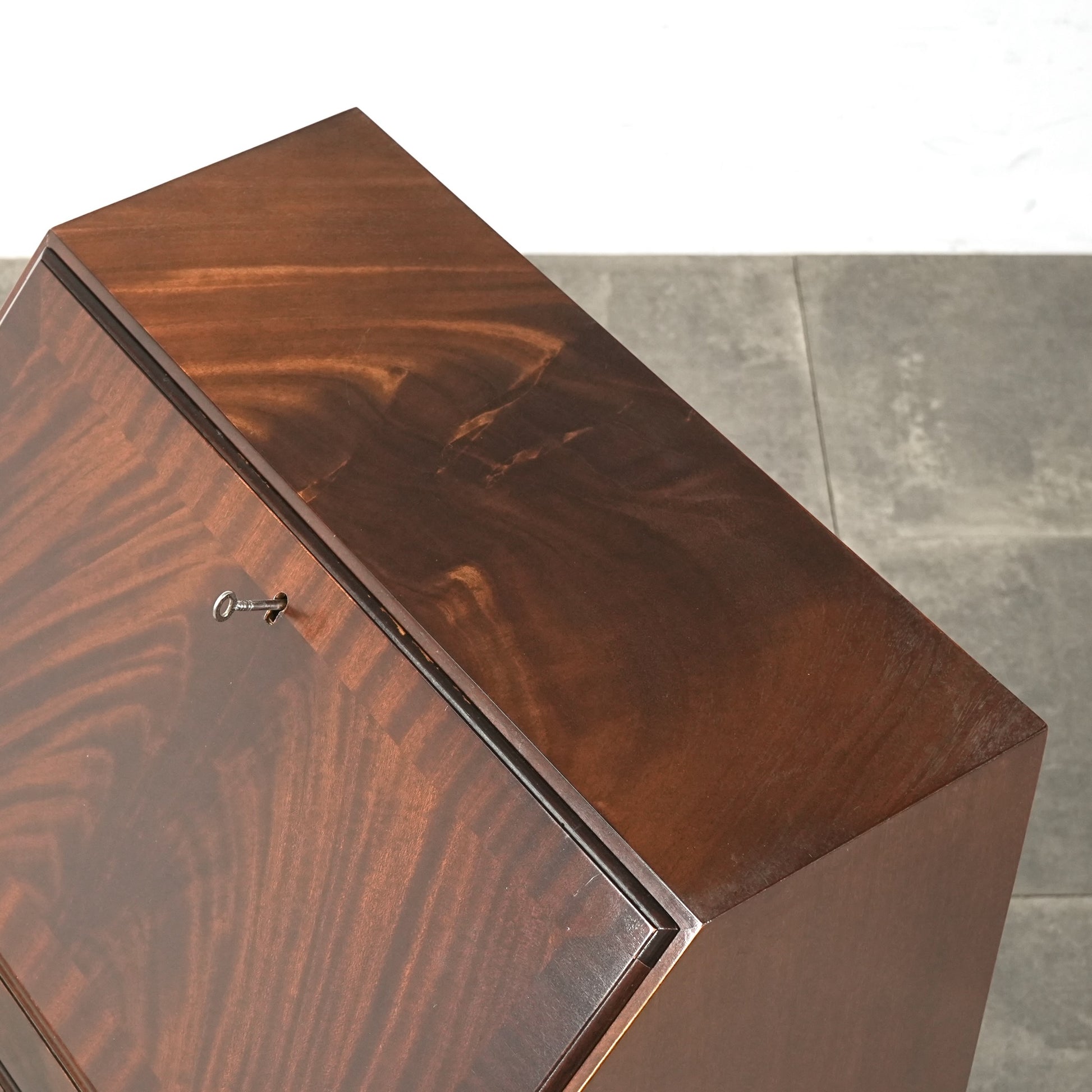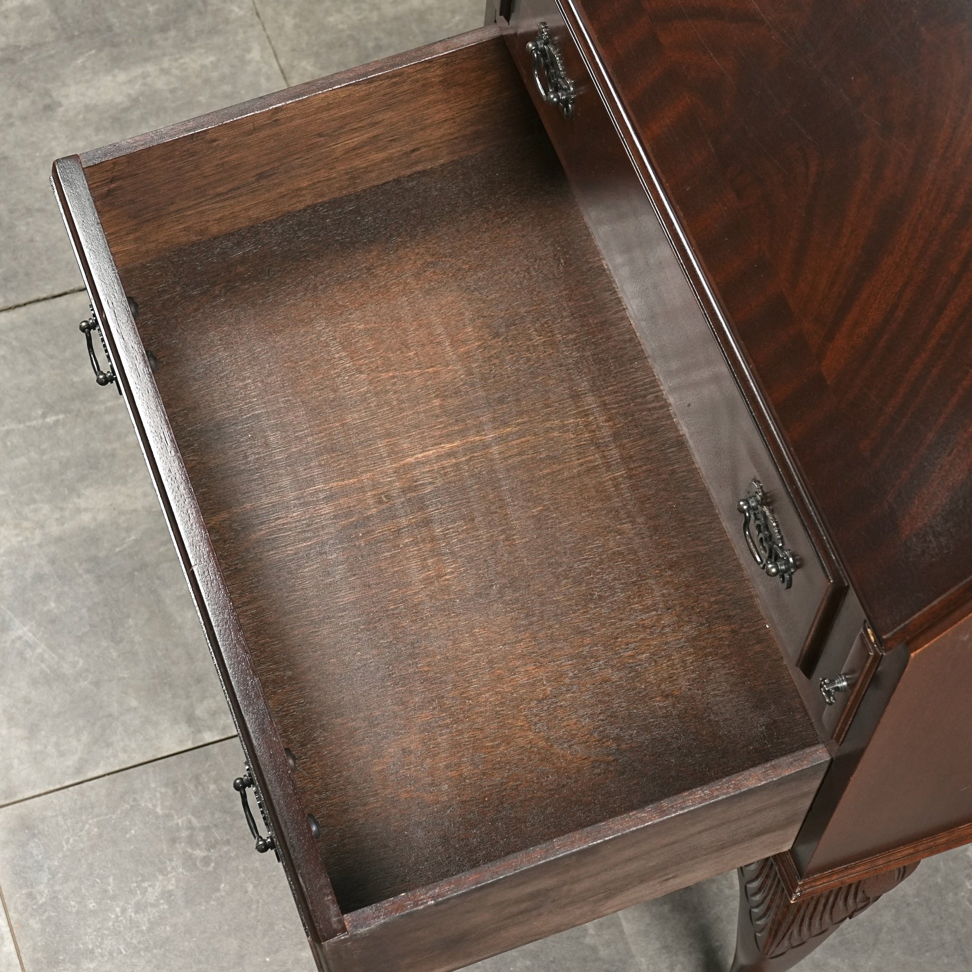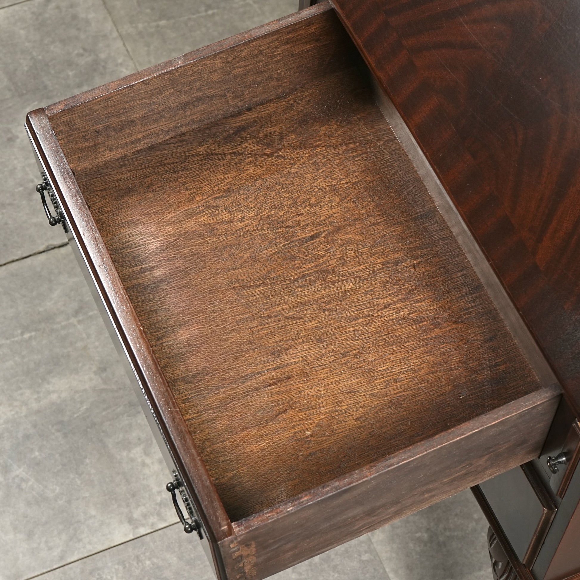 三大銘木マホガニーならではの美しい木目と質感だけでなく、レザートップやピジョンホールの作り込みなど、当時の職人たちの技術力と美意識がしっかりと伝わってくるヴィンテージ家具です。
