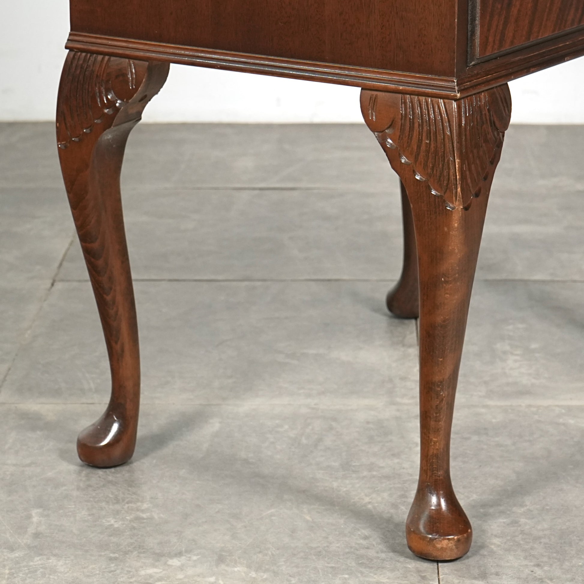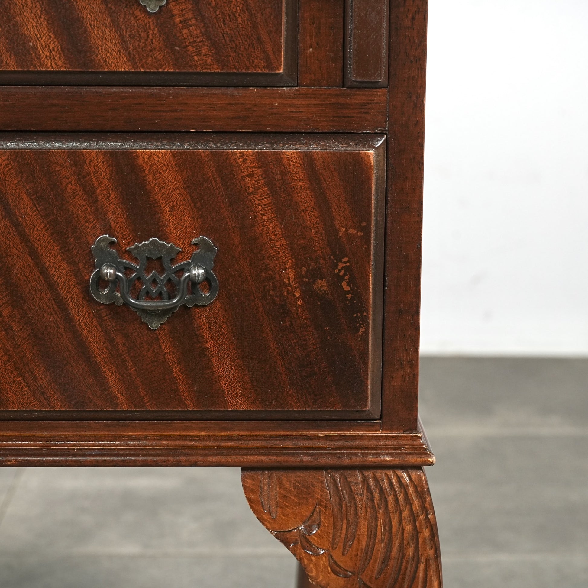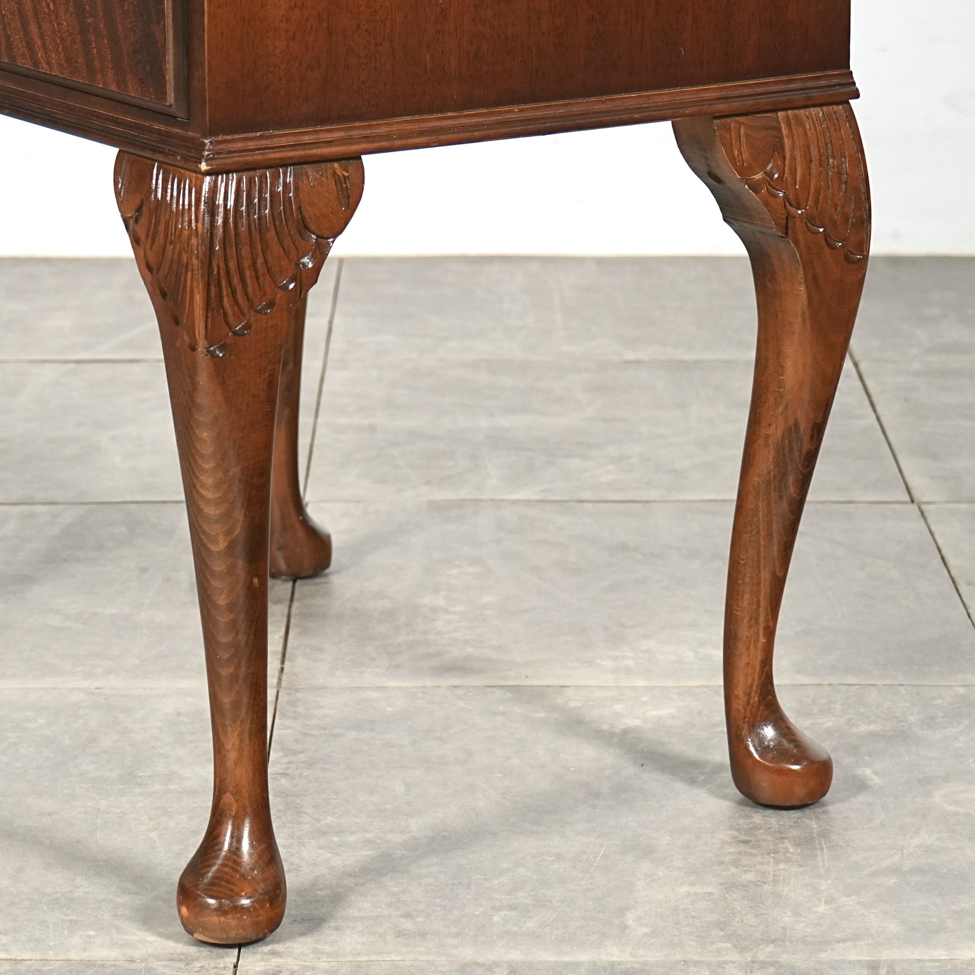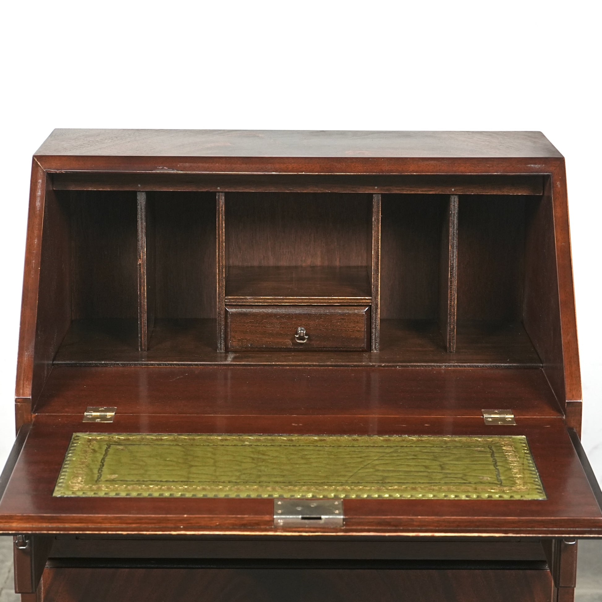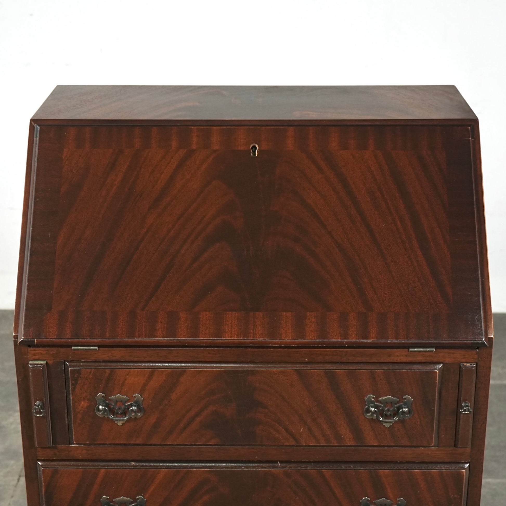 三大銘木マホガニーならではの美しい木目と質感だけでなく、レザートップやピジョンホールの作り込みなど、当時の職人たちの技術力と美意識がしっかりと伝わってくるヴィンテージ家具です。
