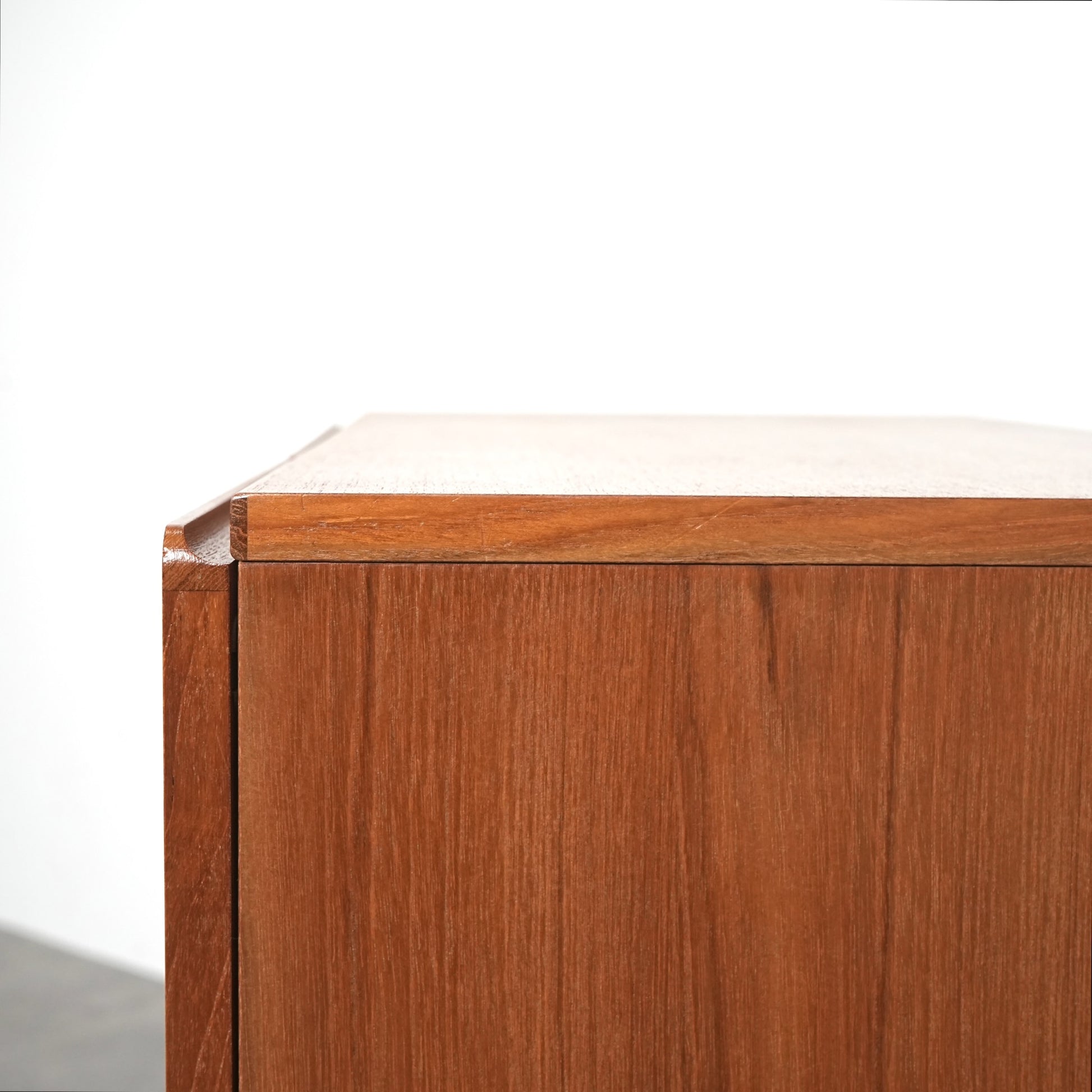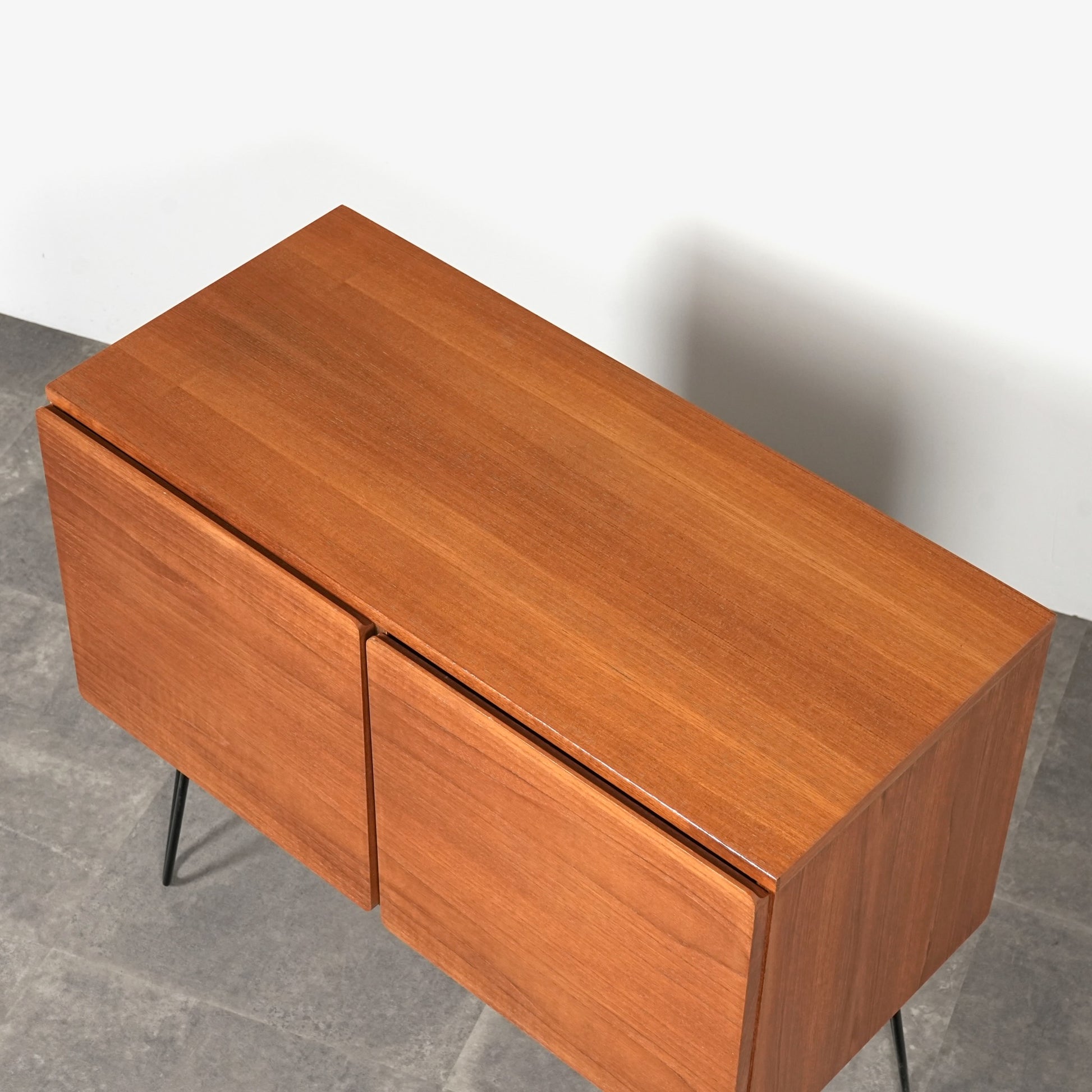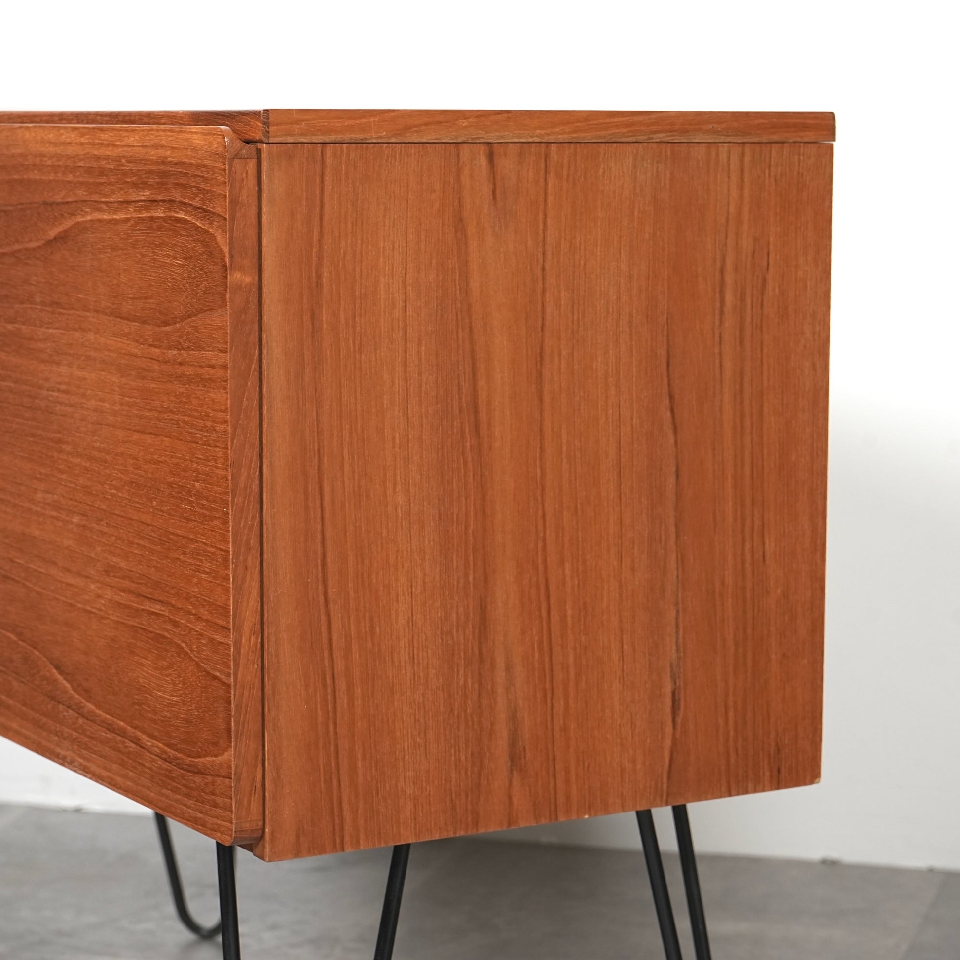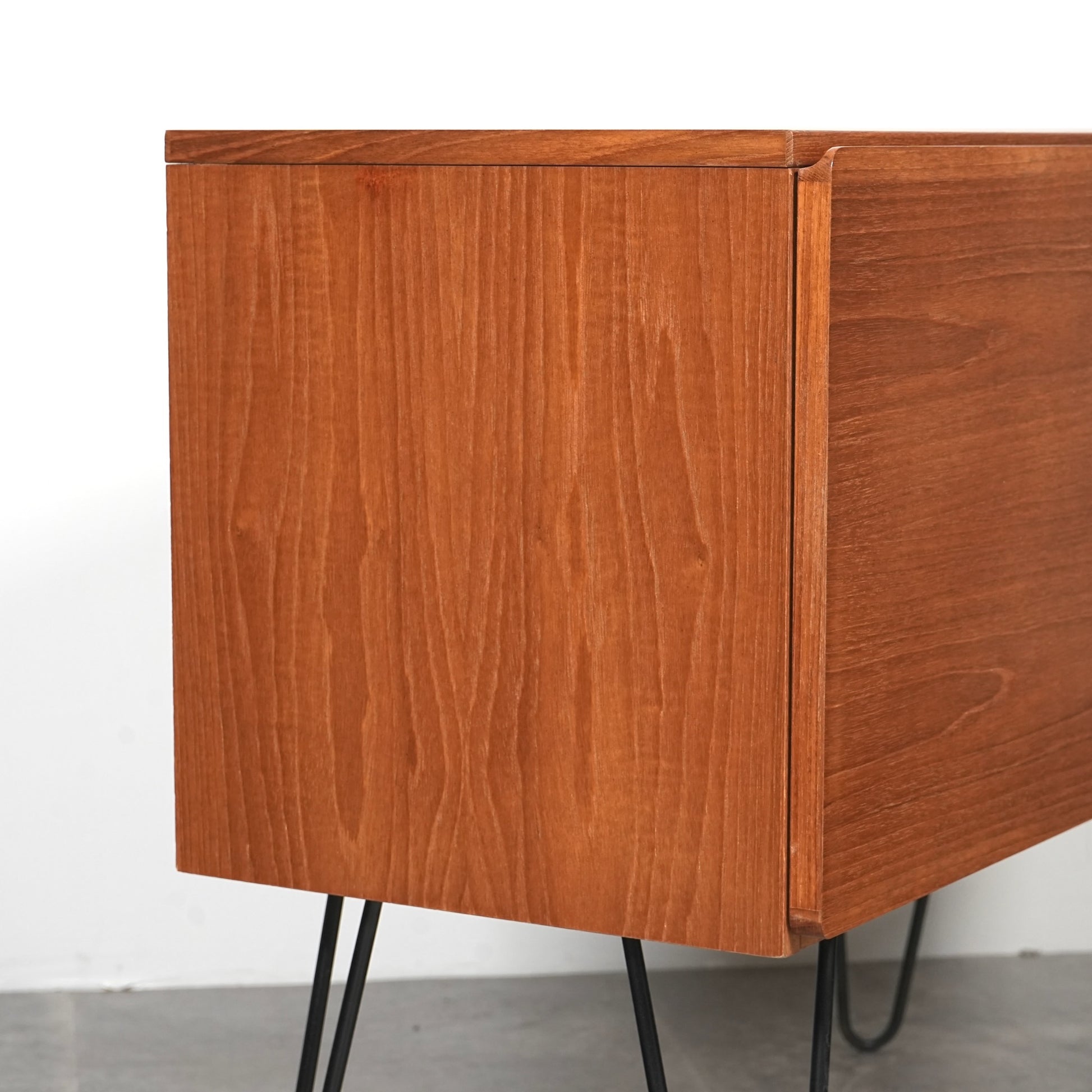 箱型の本体は無駄な装飾を省いたミニマルな構成で、チーク材ならではの落ち着いた色味と木目の美しさがしっかりと感じられます。