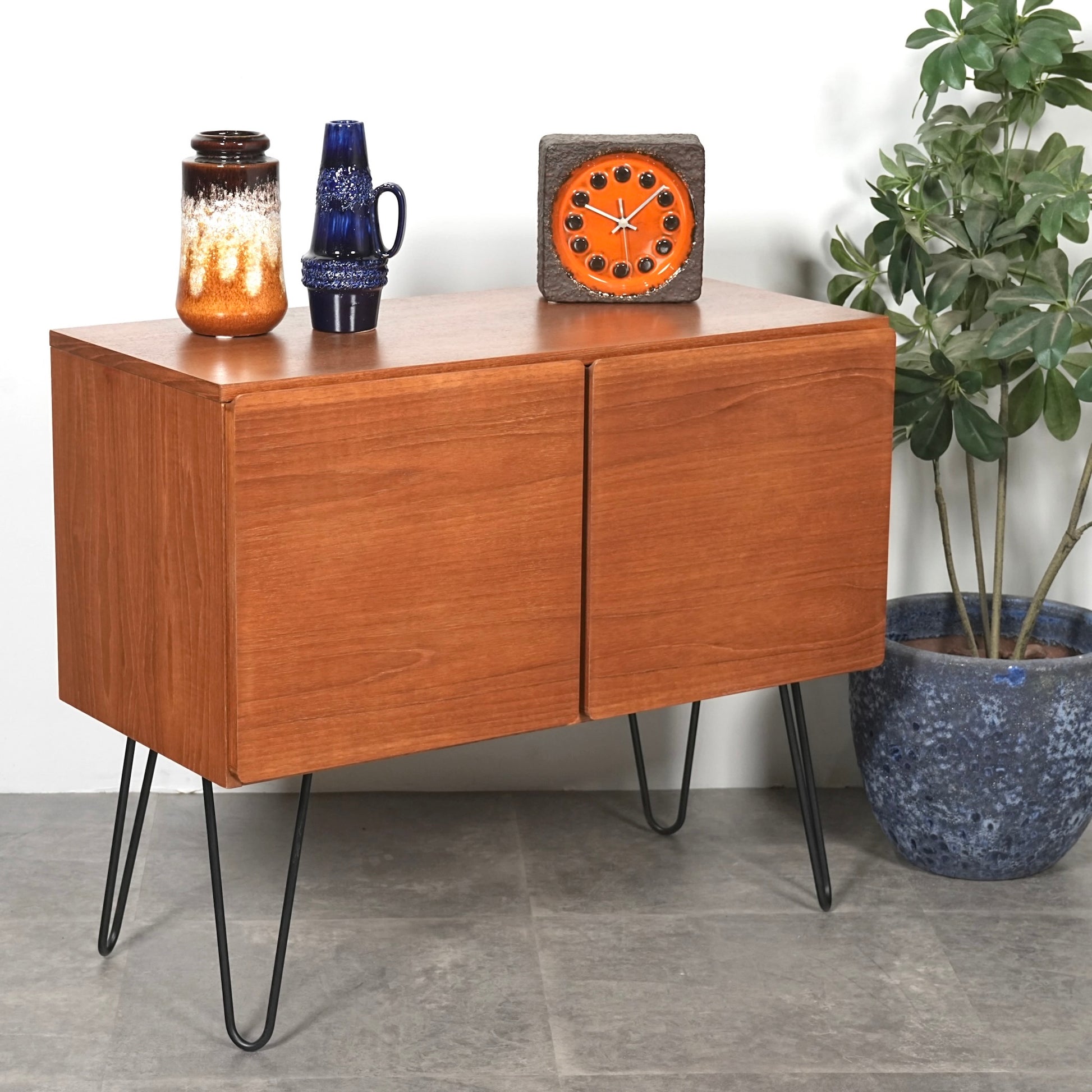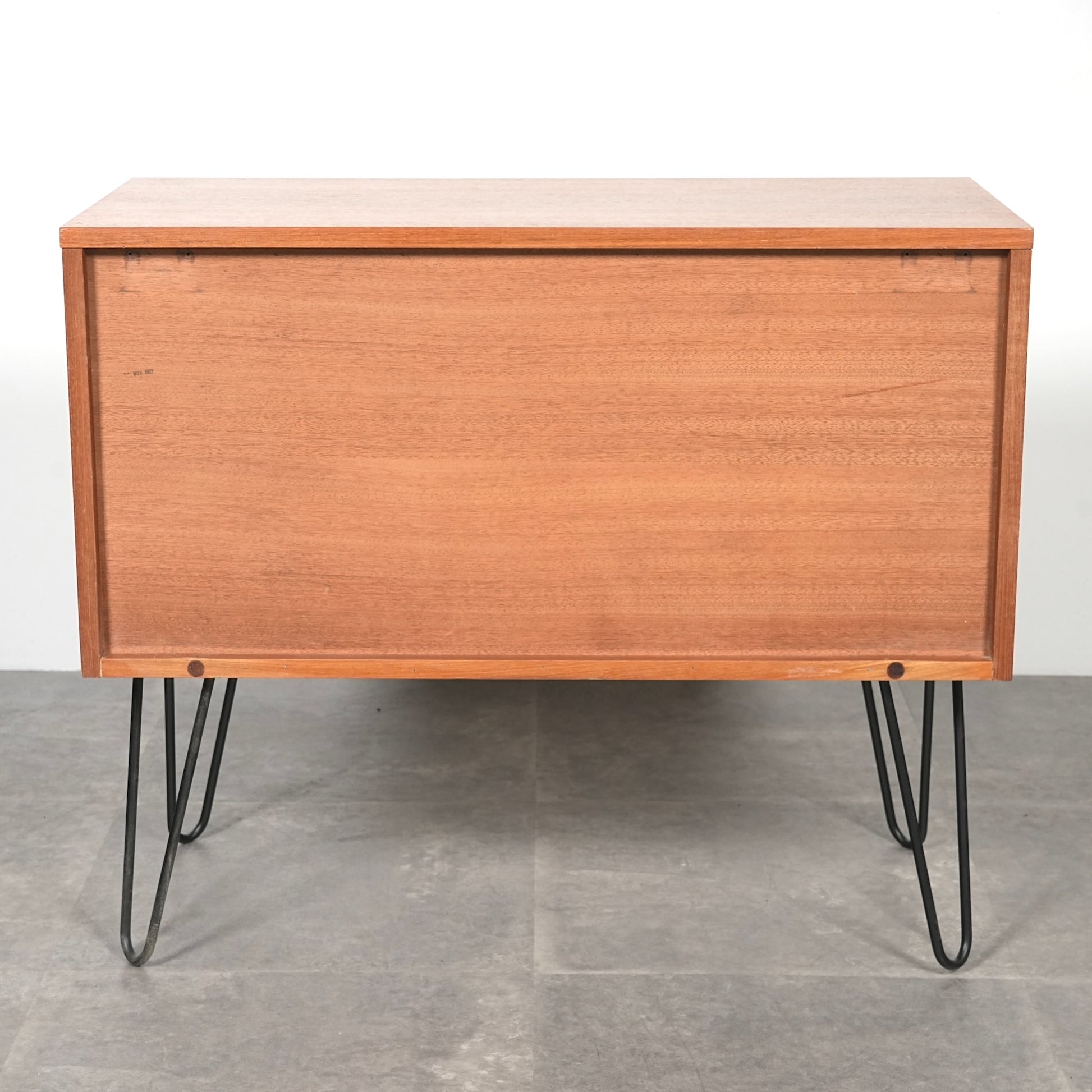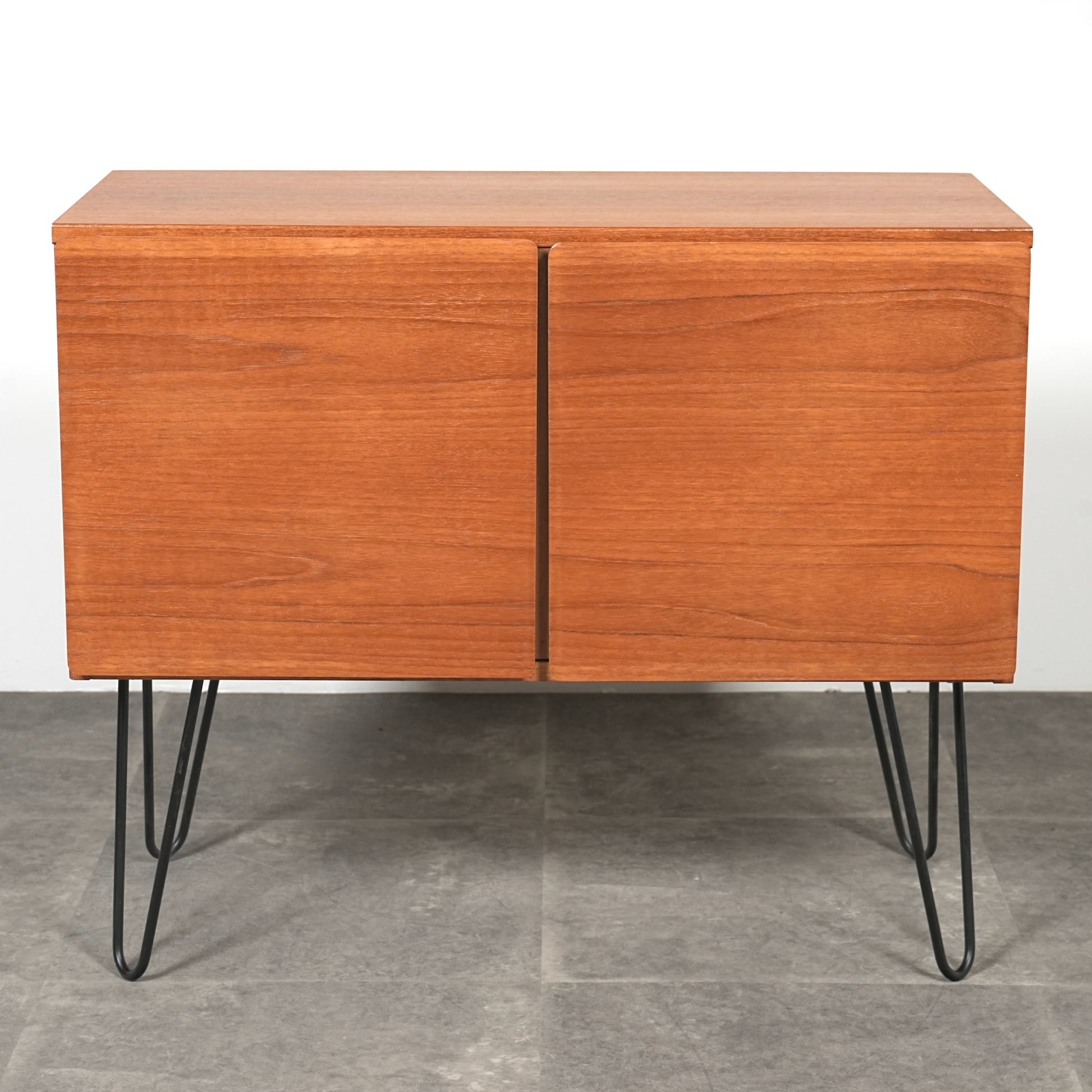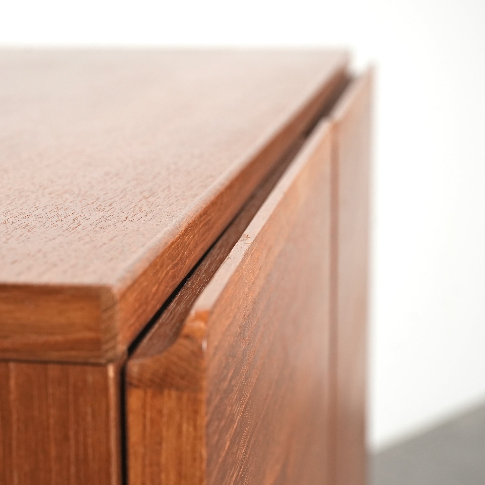 箱型の本体は無駄な装飾を省いたミニマルな構成で、チーク材ならではの落ち着いた色味と木目の美しさがしっかりと感じられます。
