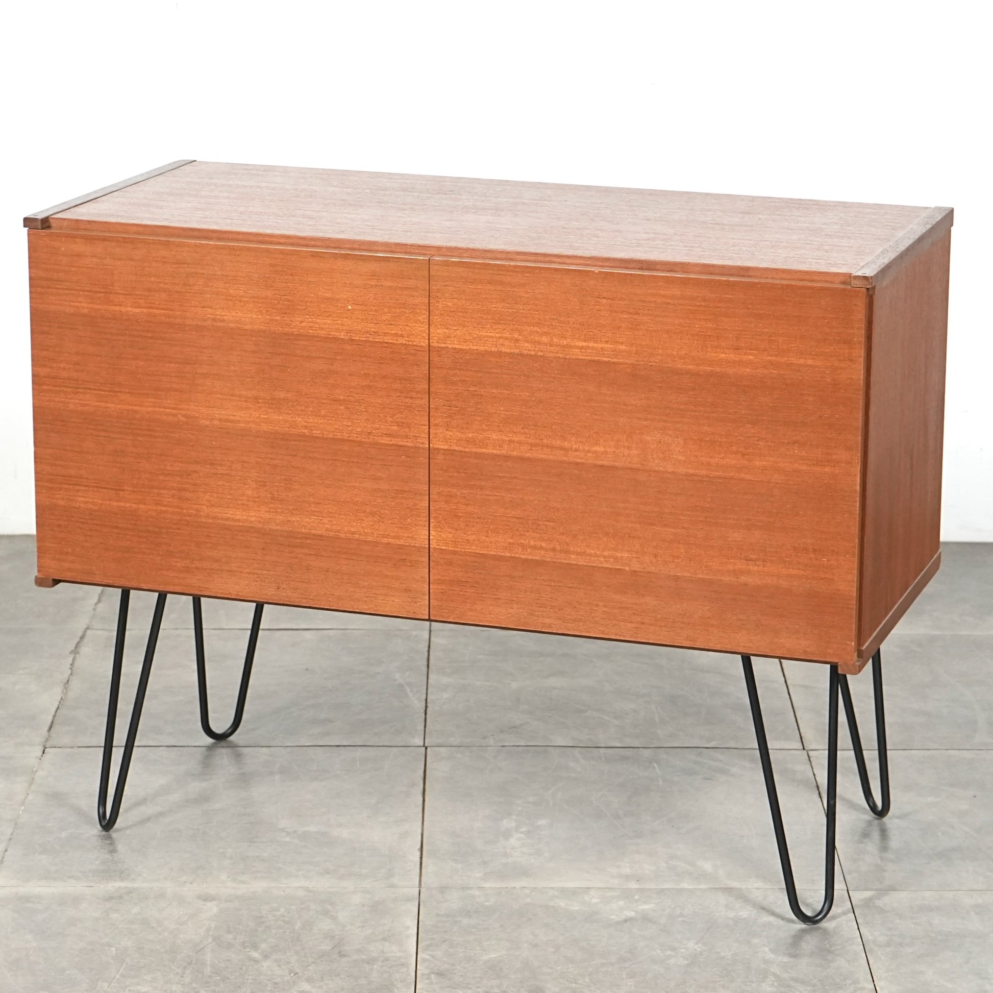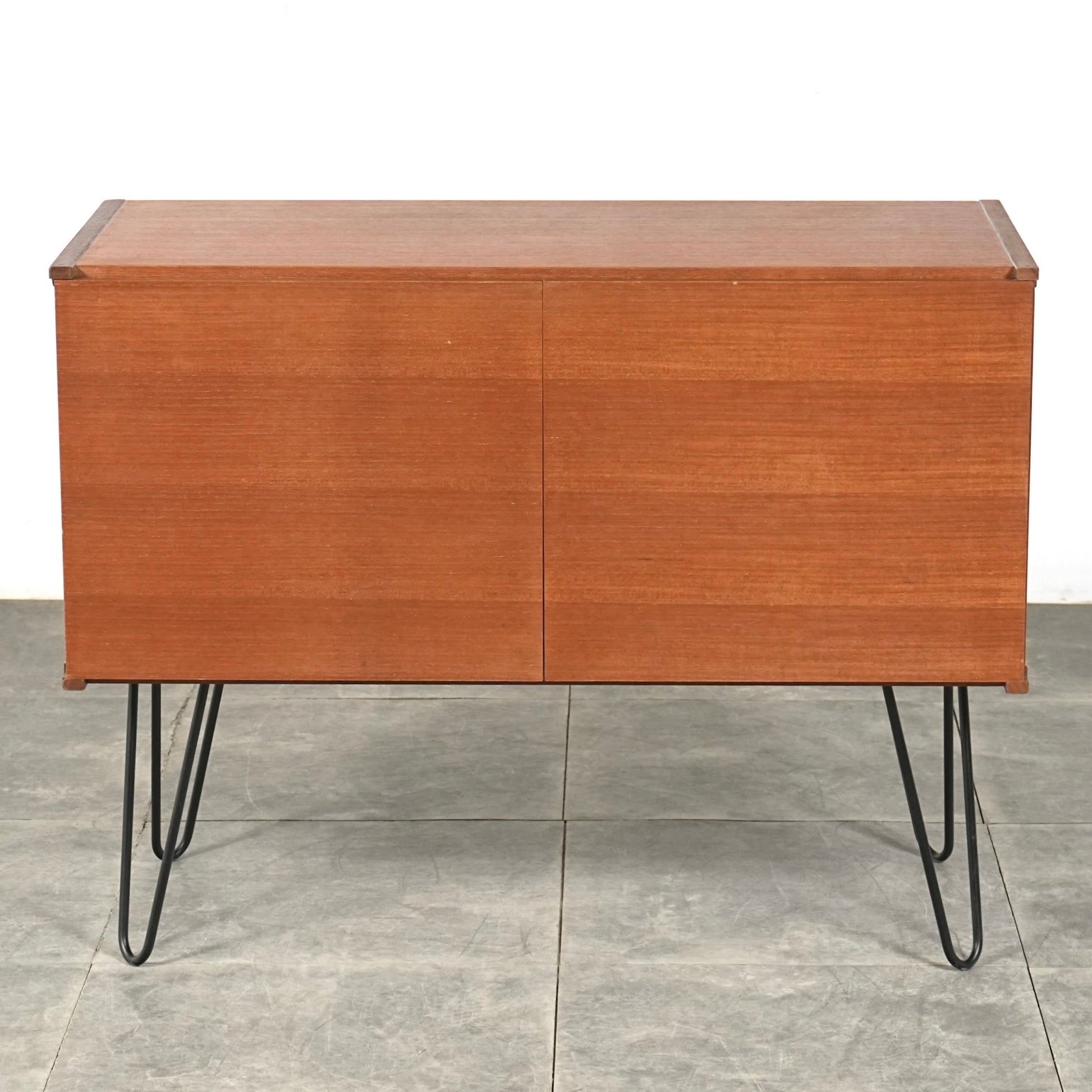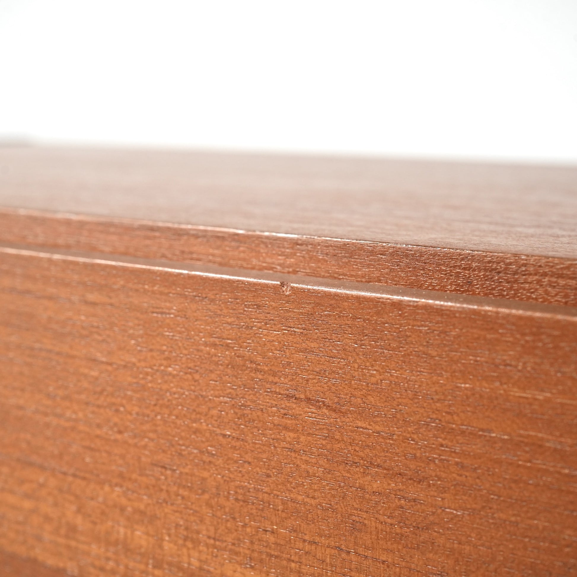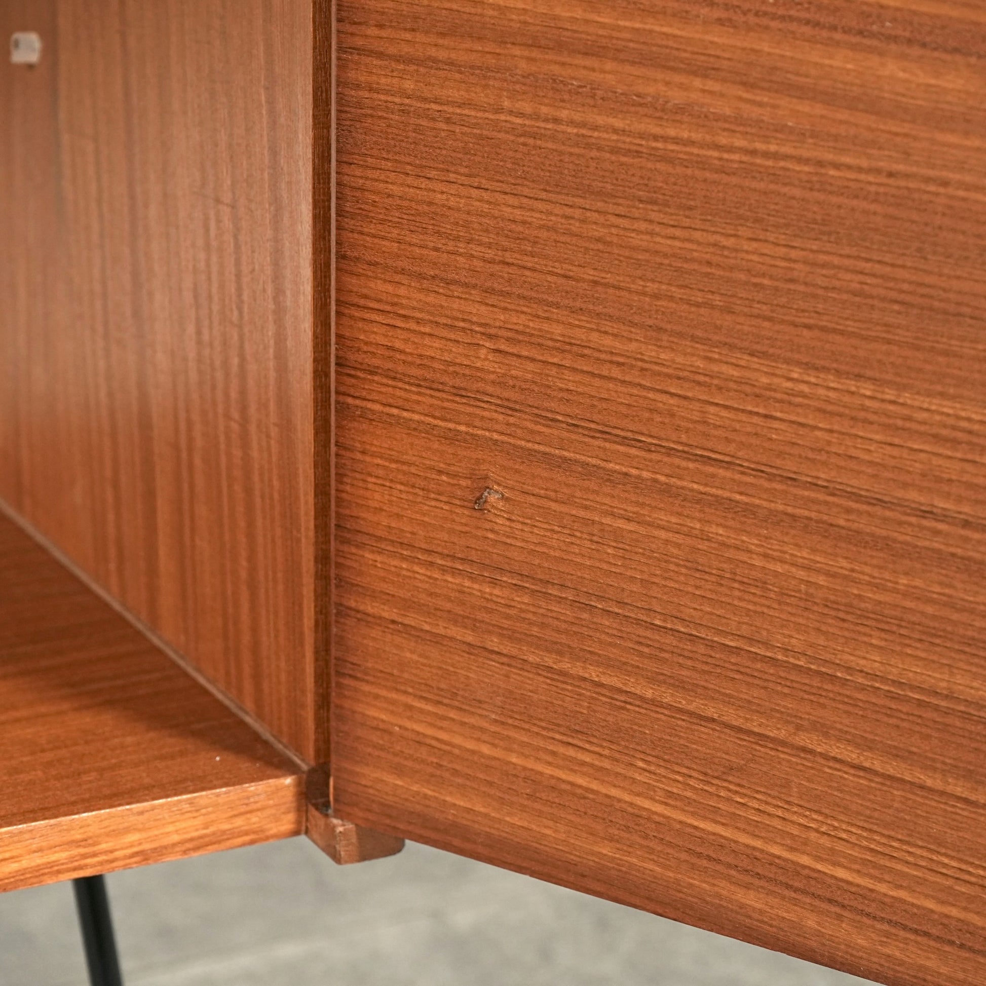 箱型の本体は無駄な装飾を省いたミニマルな構成で、チーク材ならではの落ち着いた色味と木目の美しさがしっかりと感じられます。