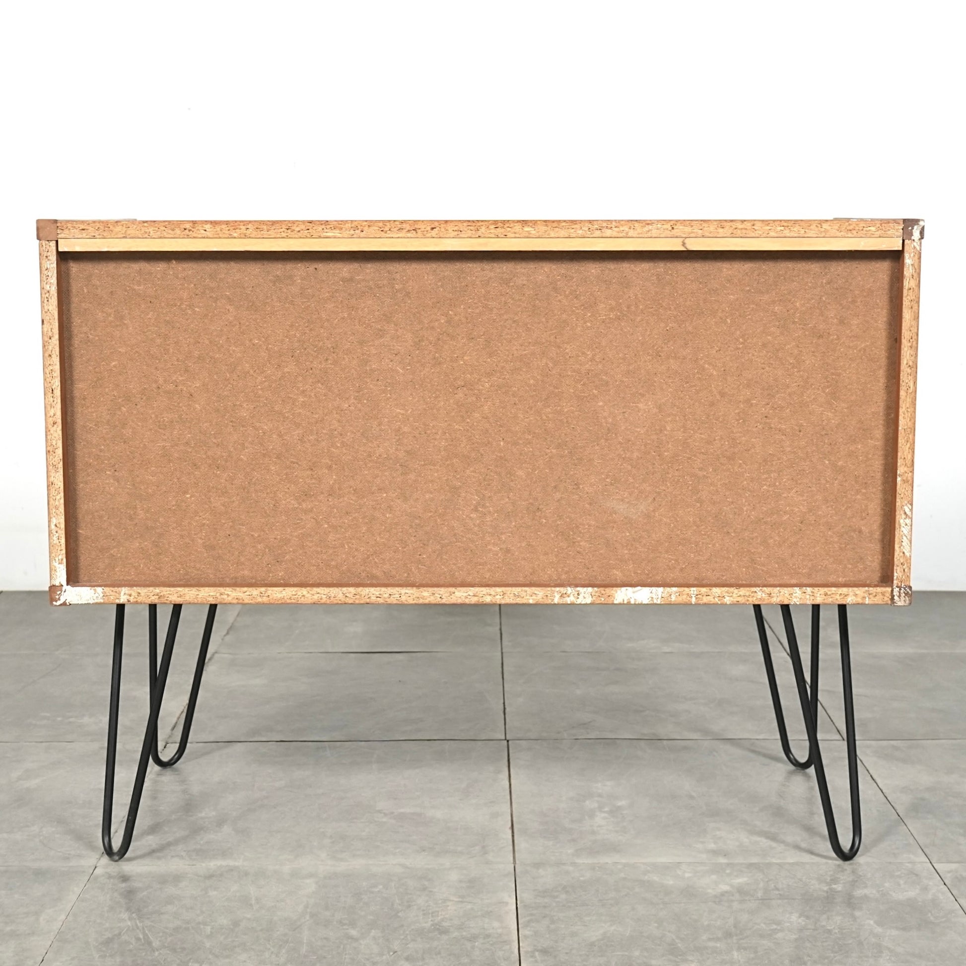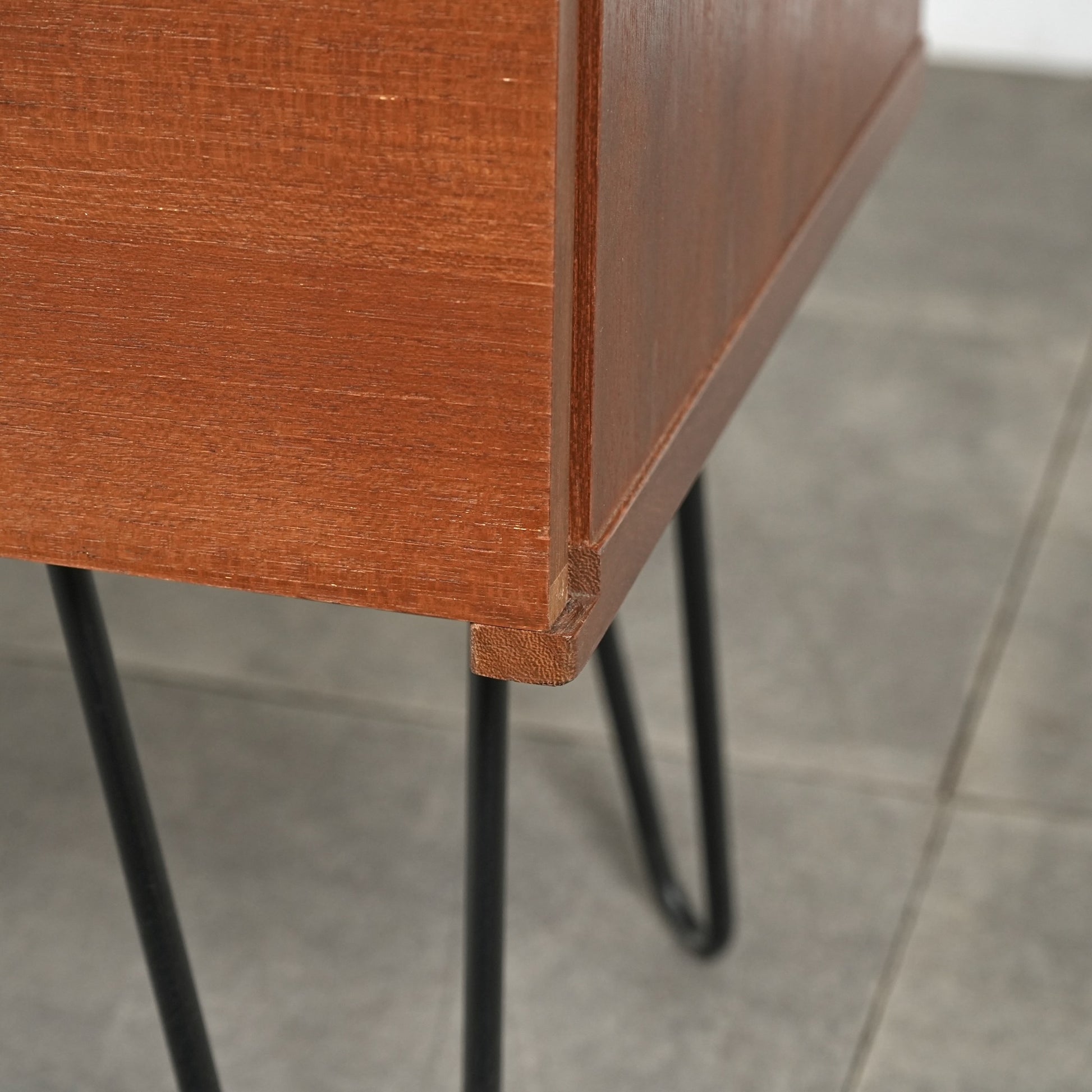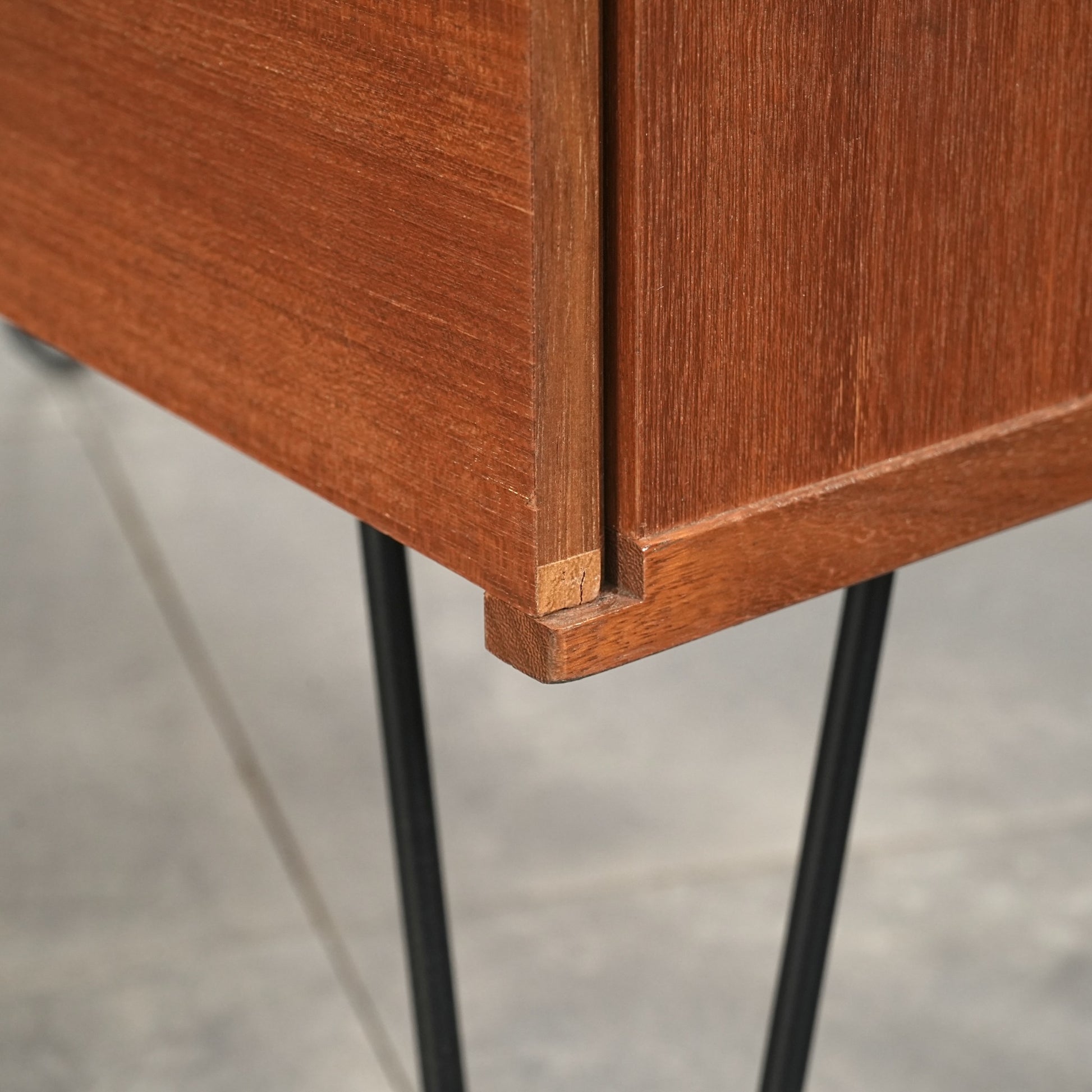 脚部のヘアピンレッグによって抜け感が生まれることで圧迫感が少なく、リビングやベッドルームなど、さまざまな空間に自然と馴染む佇まいです。