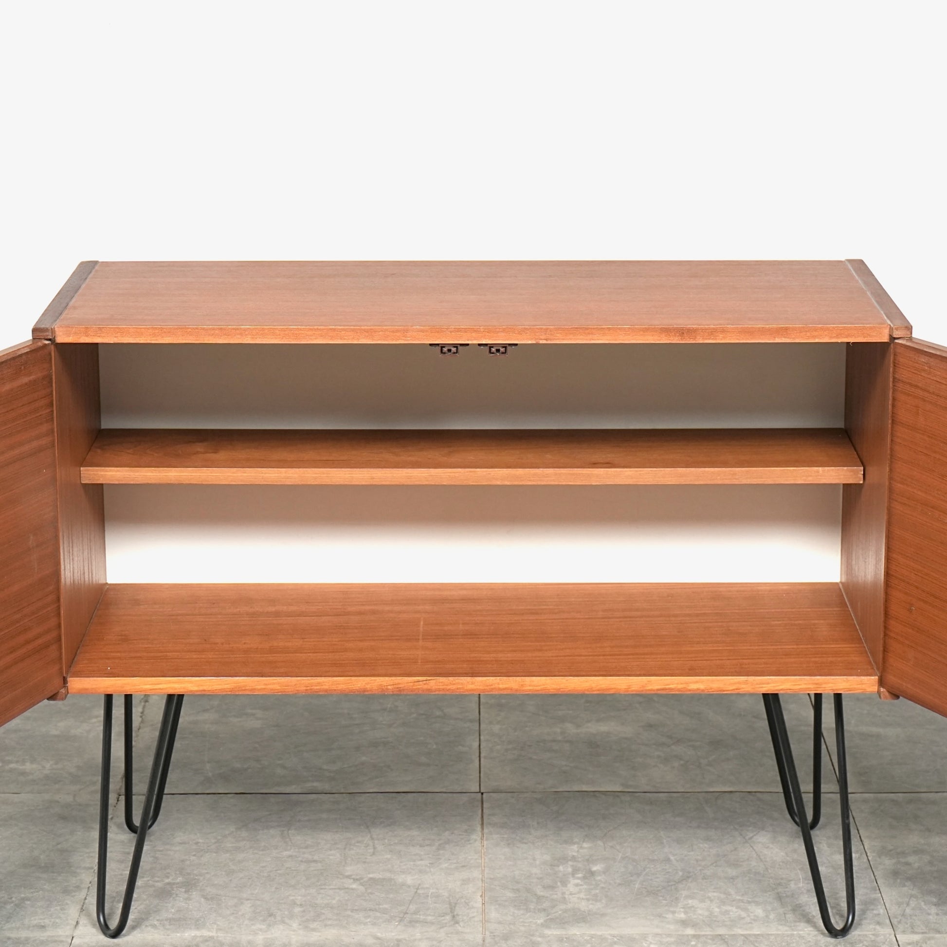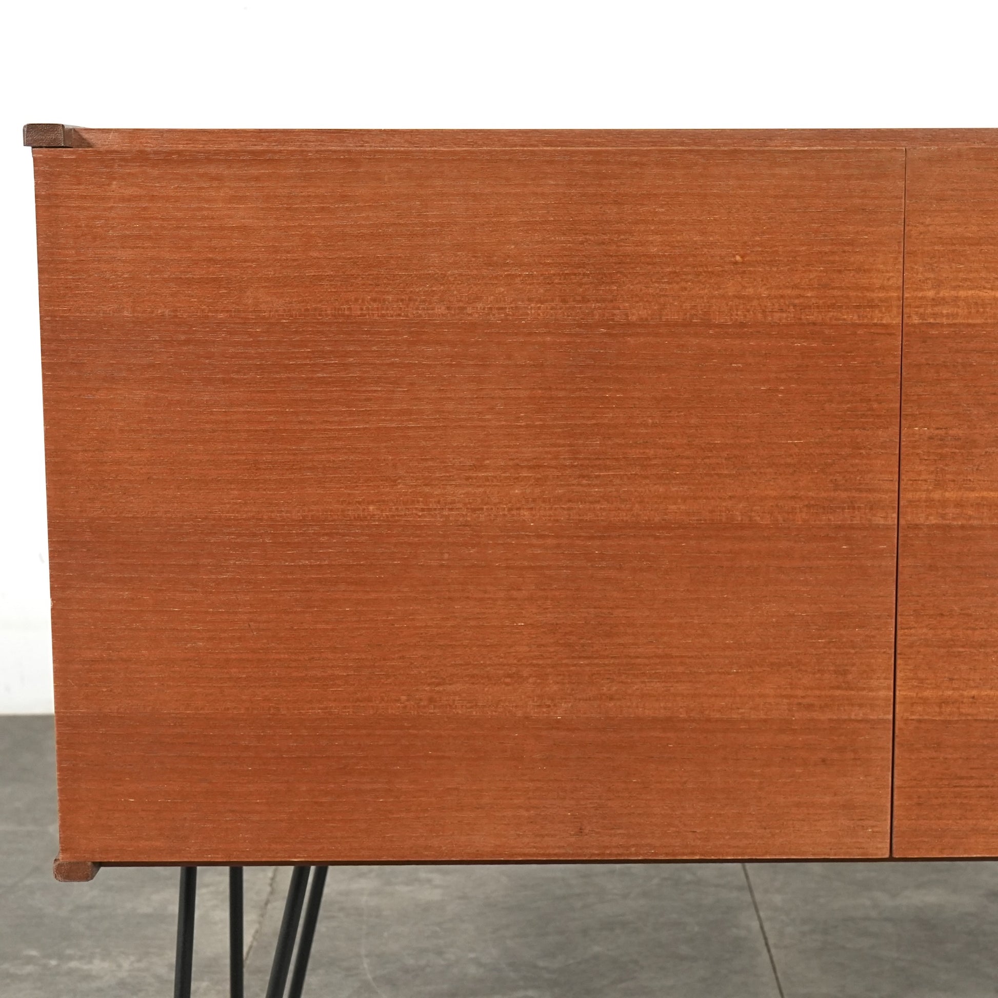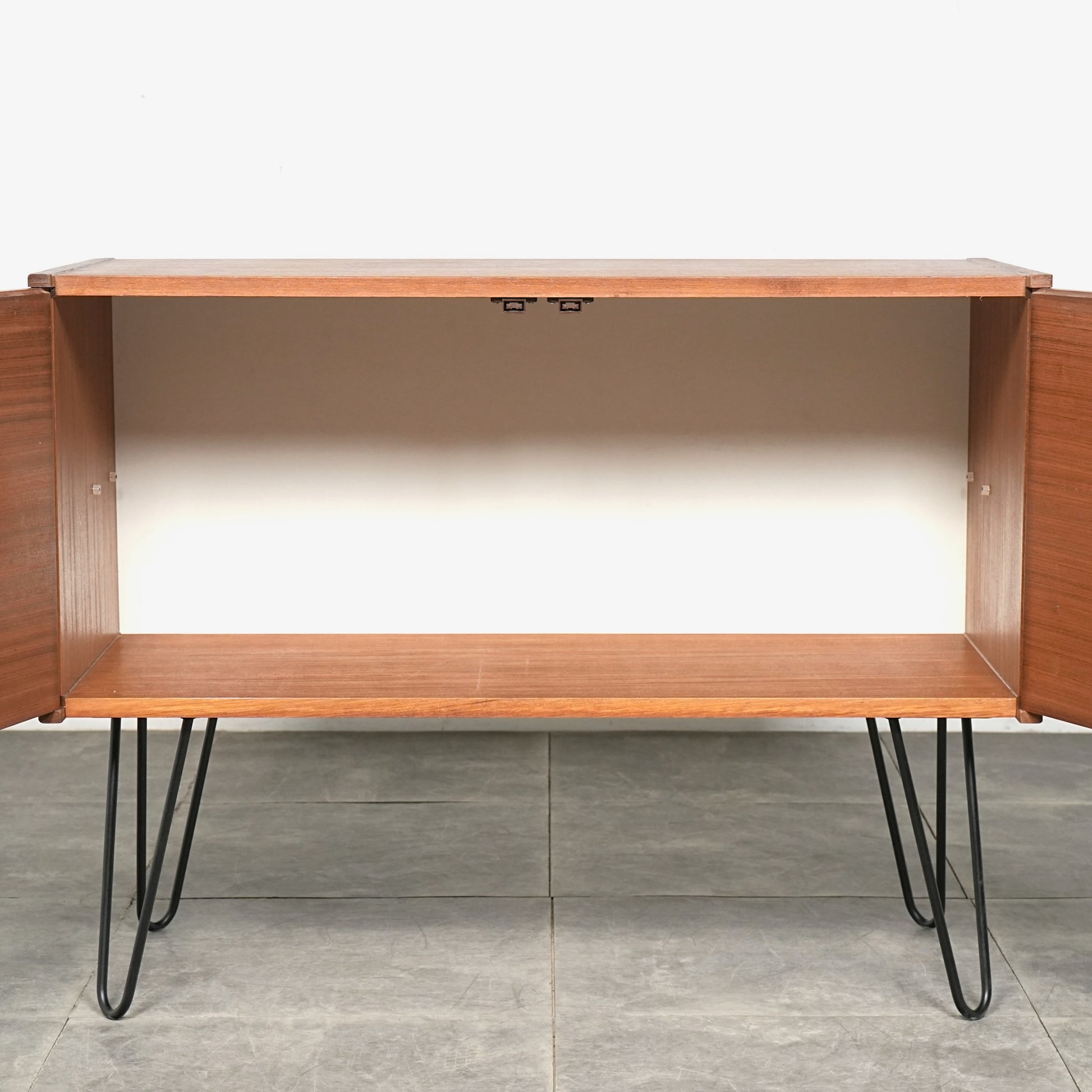脚部のヘアピンレッグによって抜け感が生まれることで圧迫感が少なく、リビングやベッドルームなど、さまざまな空間に自然と馴染む佇まいです。