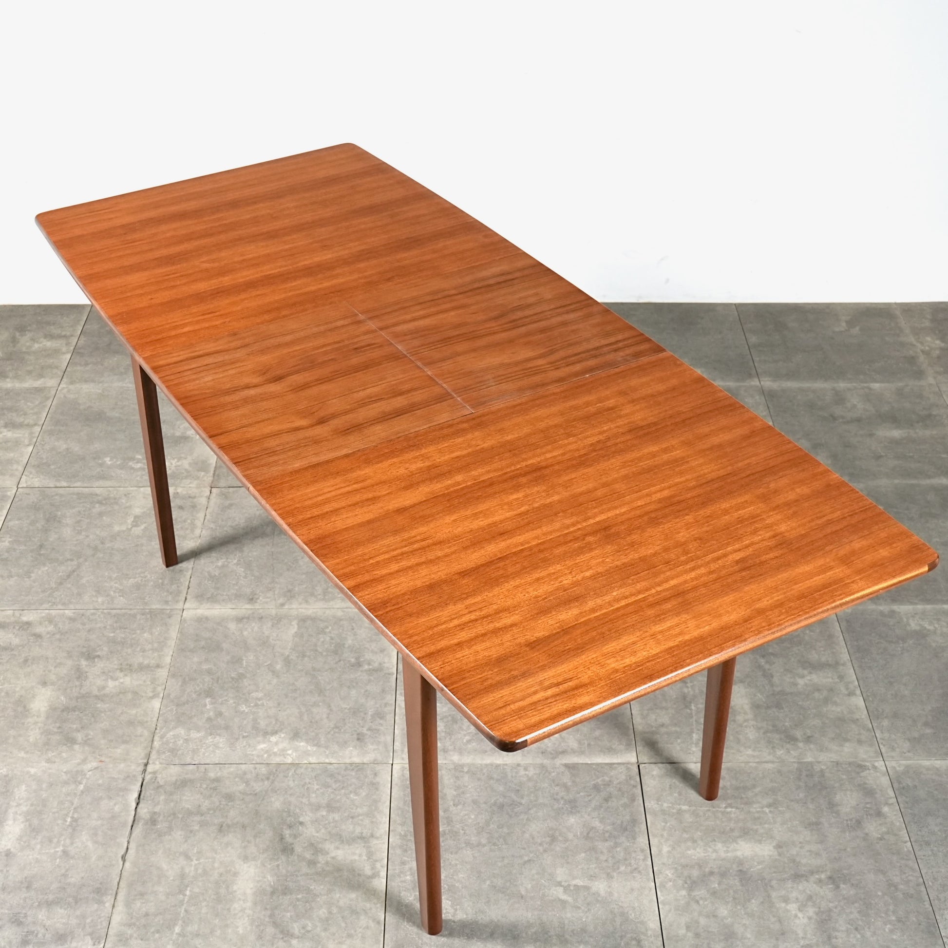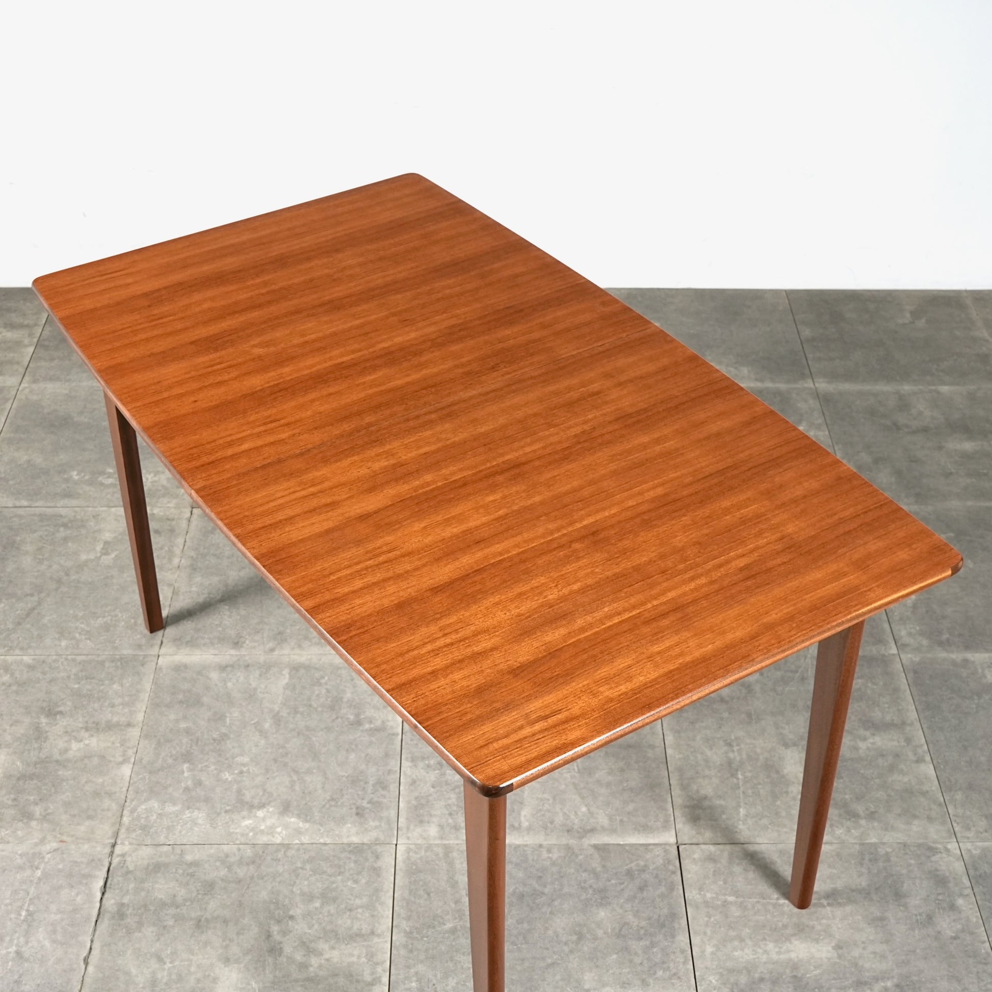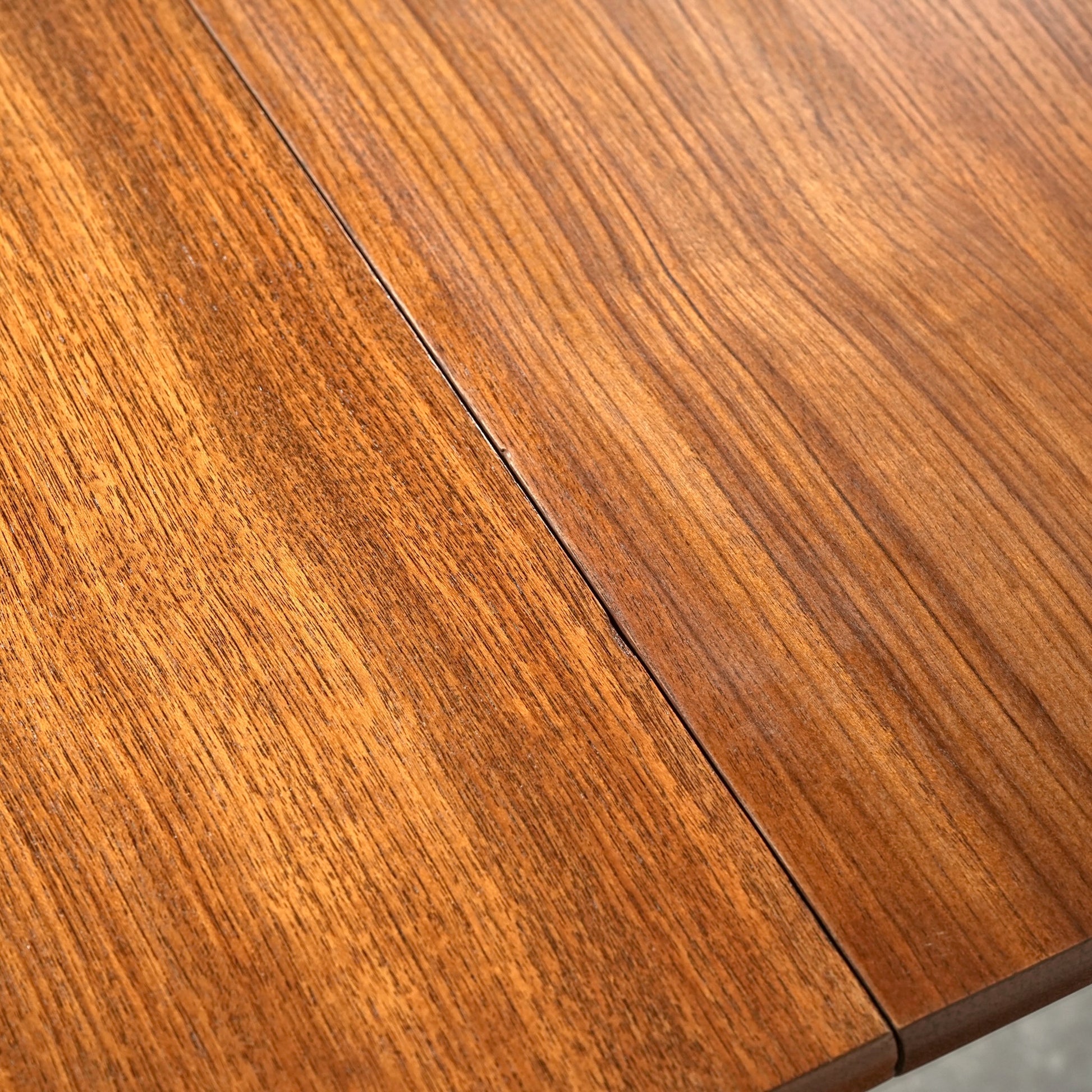 良質なチーク材の魅力が際立つミニマルな構成で、この時代のテーブルには標準装備とも言えるエクステンション(拡張)機能を備えており、4人掛けサイズ→6人掛けサイズへと簡単に拡張可能。