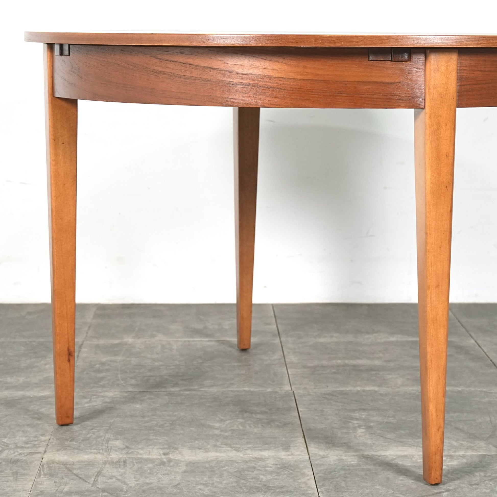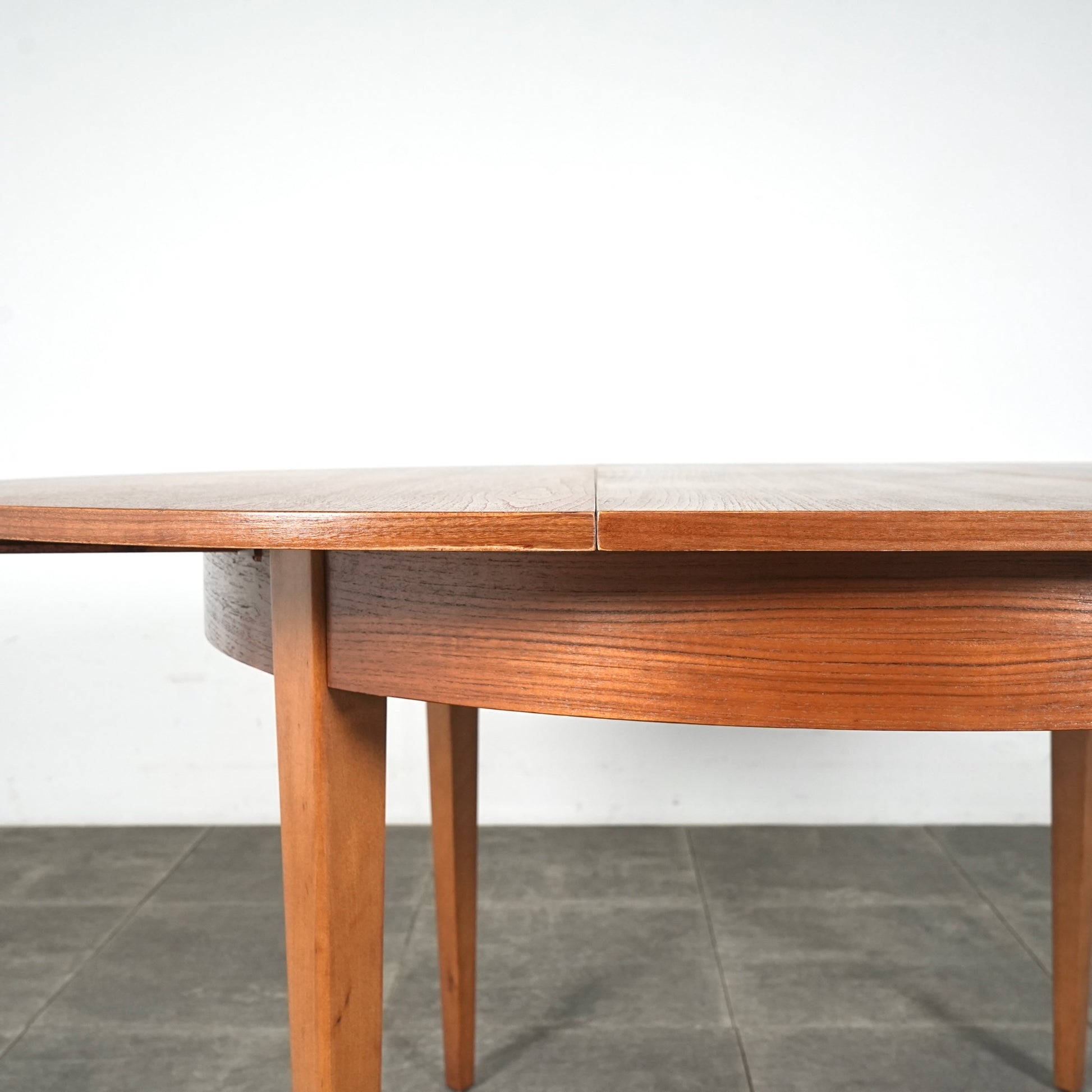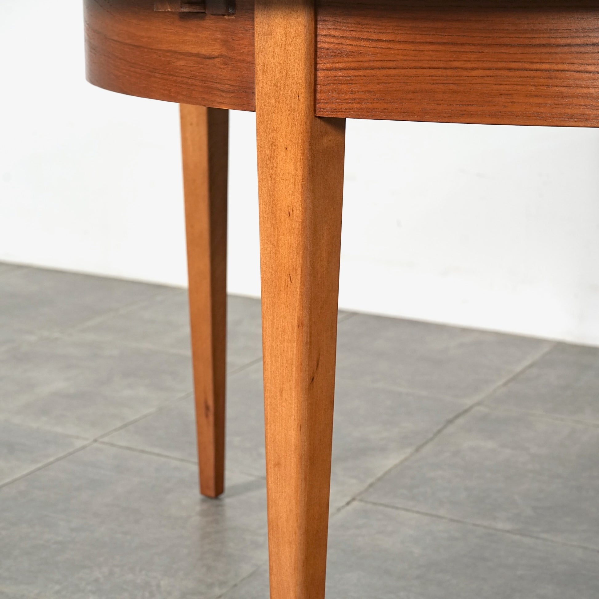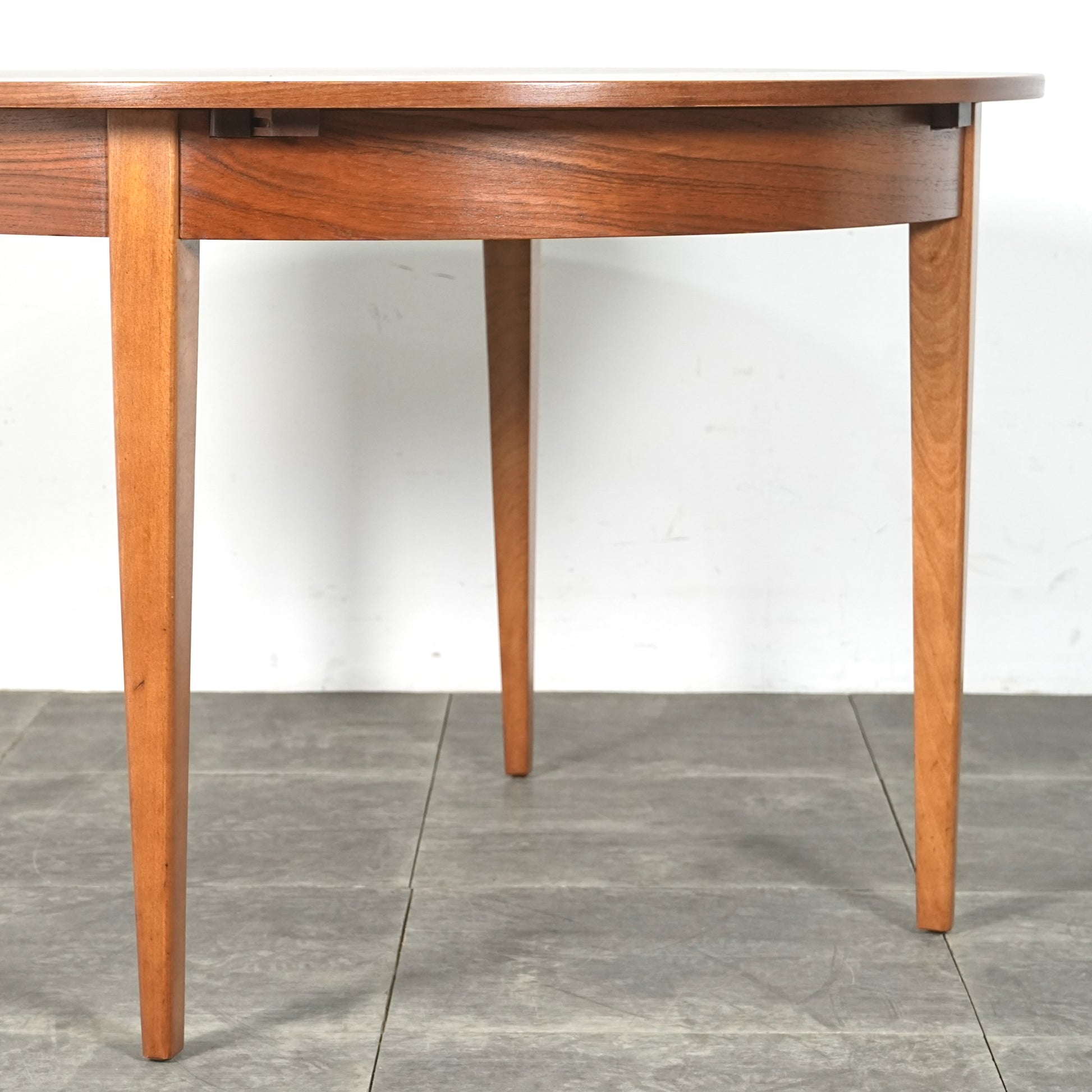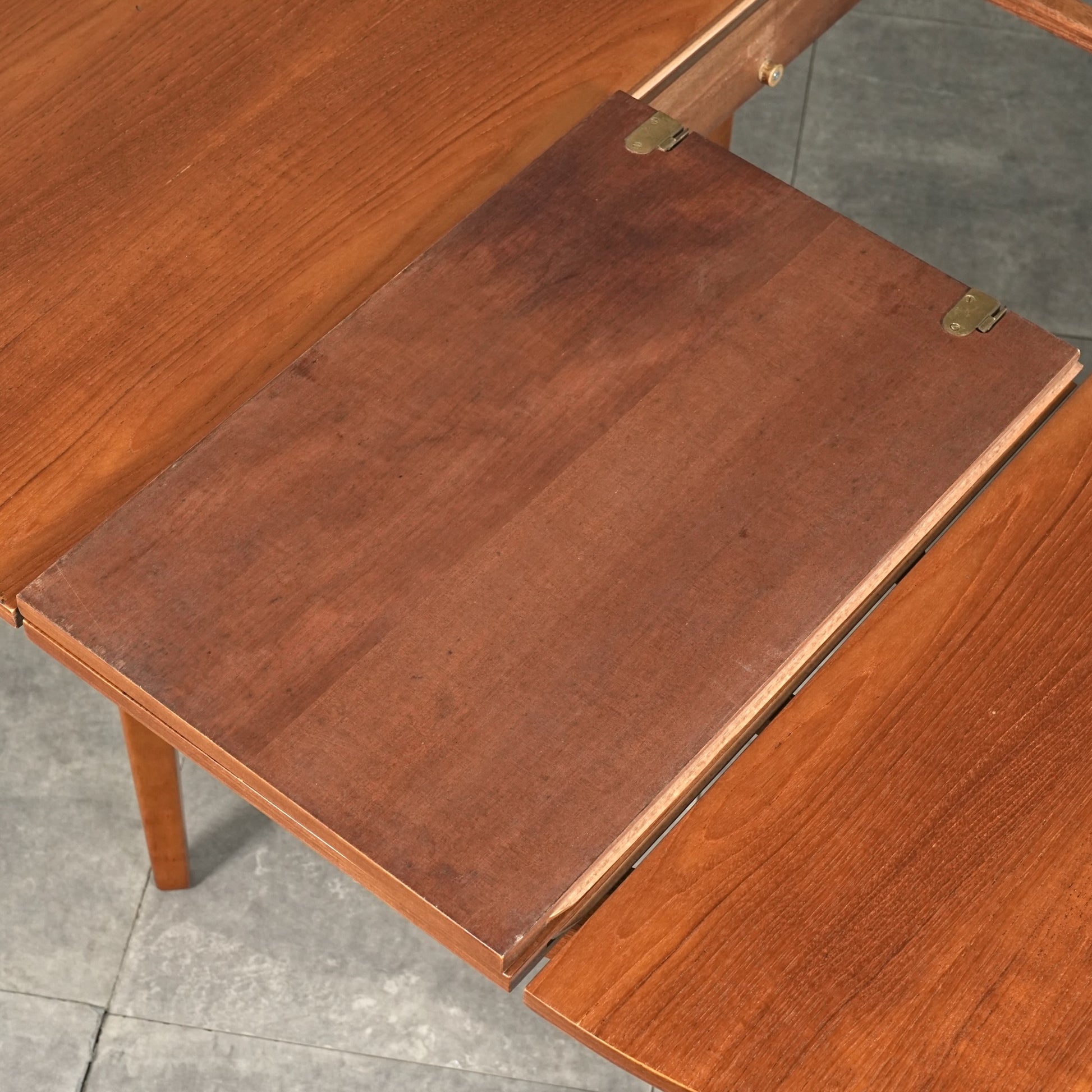 上質なチーク材を使用しており、この時代のテーブルには標準装備とも言えるエクステンション(拡張)機能を備えており、4人掛けサイズ→6人掛けサイズへと簡単に拡張できるのが最大の魅力。