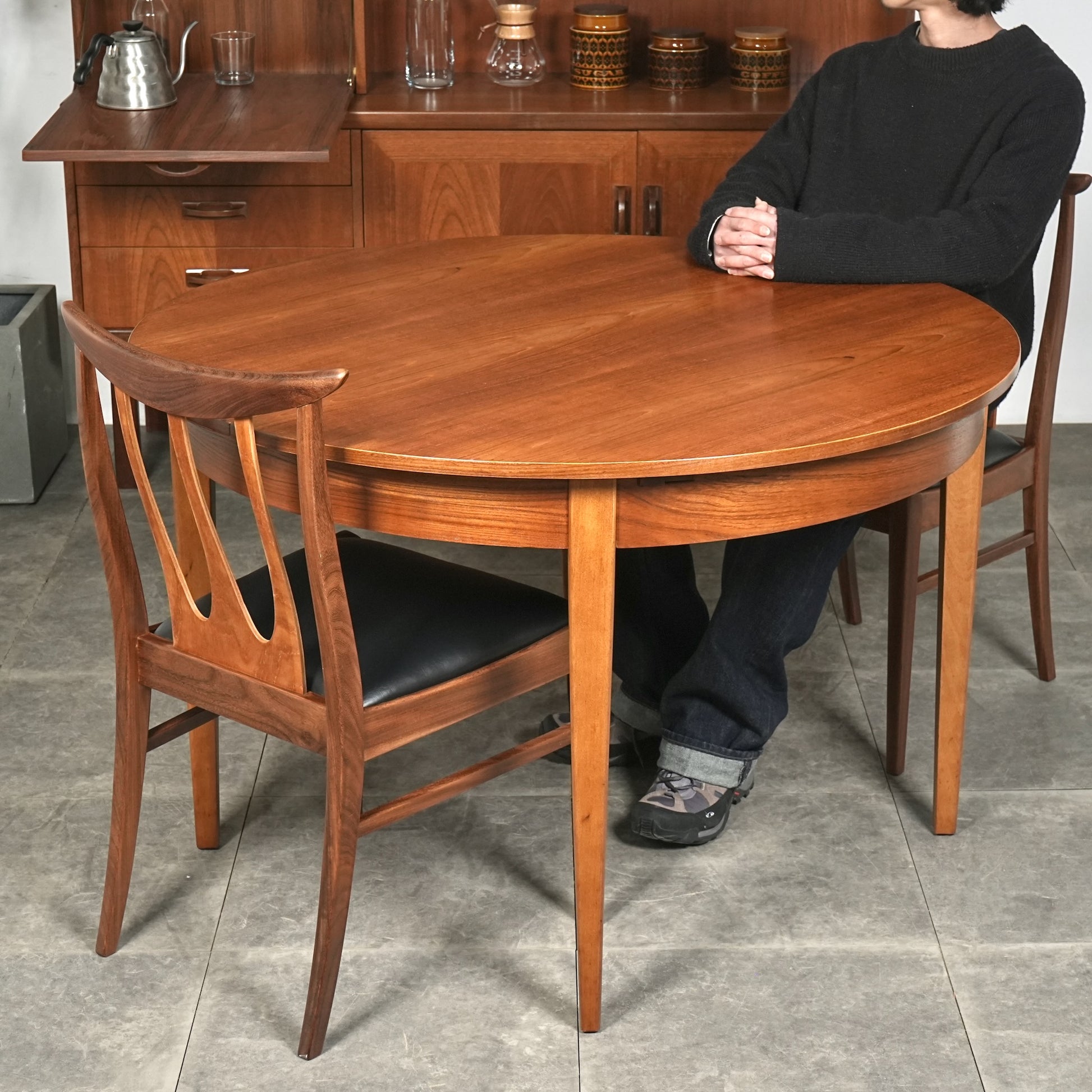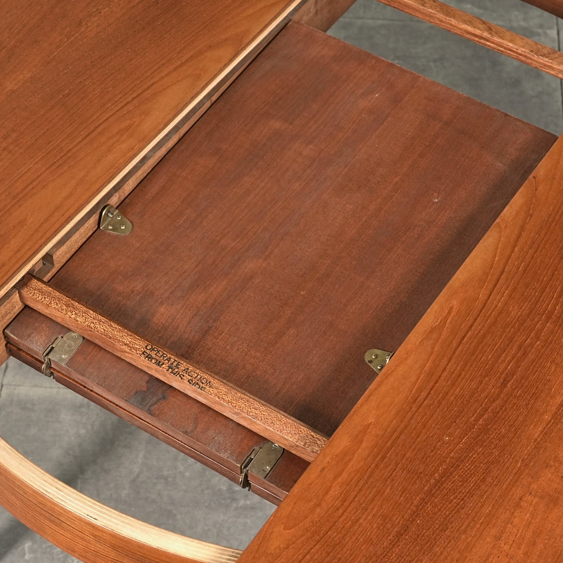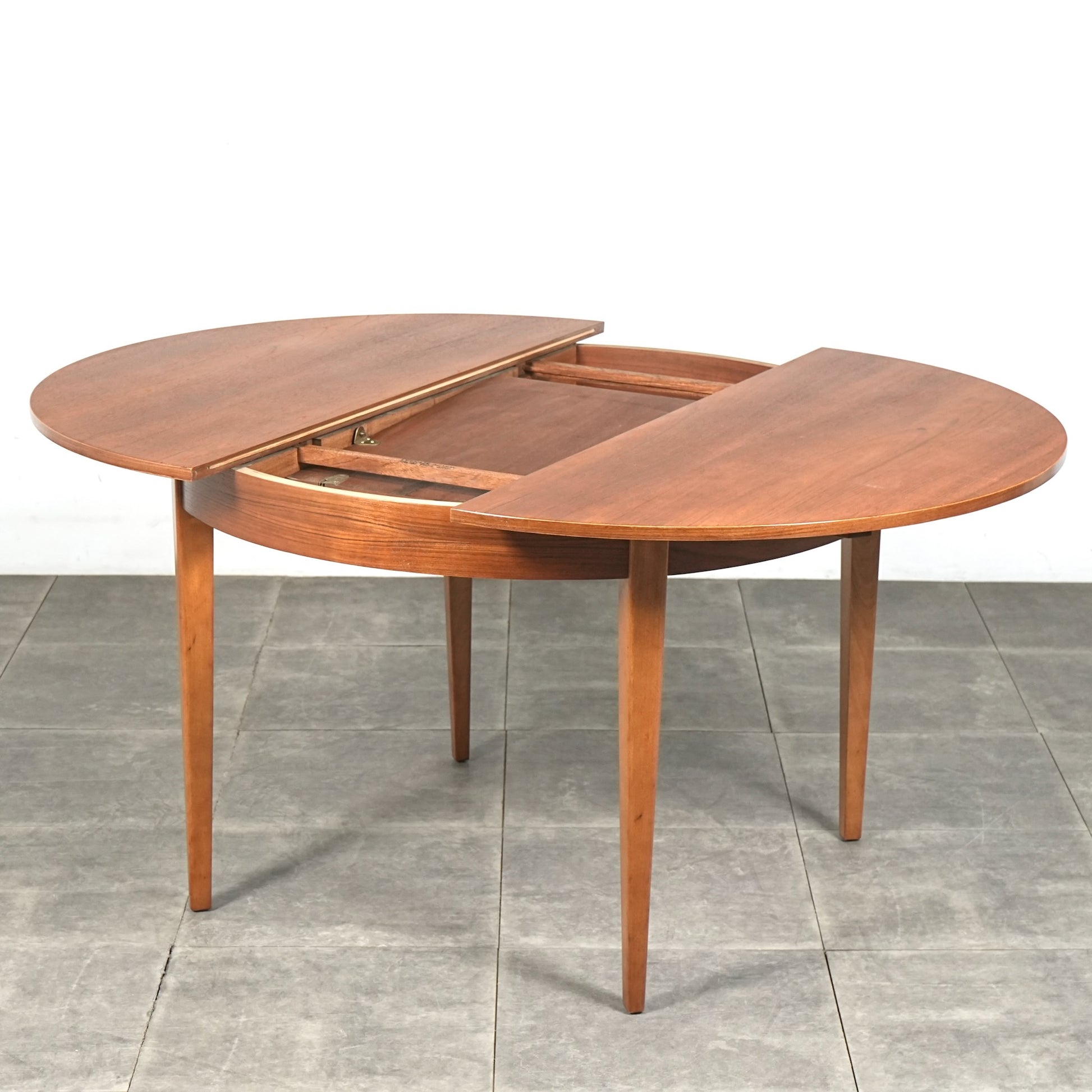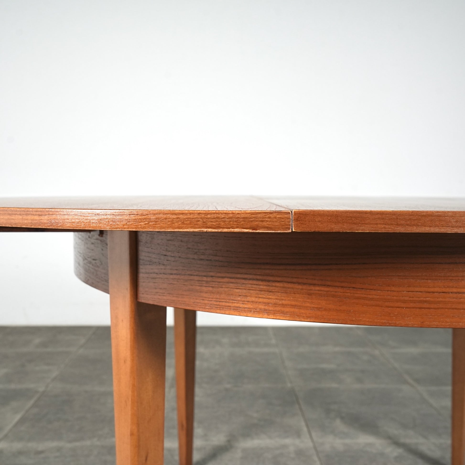 上質なチーク材を使用しており、この時代のテーブルには標準装備とも言えるエクステンション(拡張)機能を備えており、4人掛けサイズ→6人掛けサイズへと簡単に拡張できるのが最大の魅力。