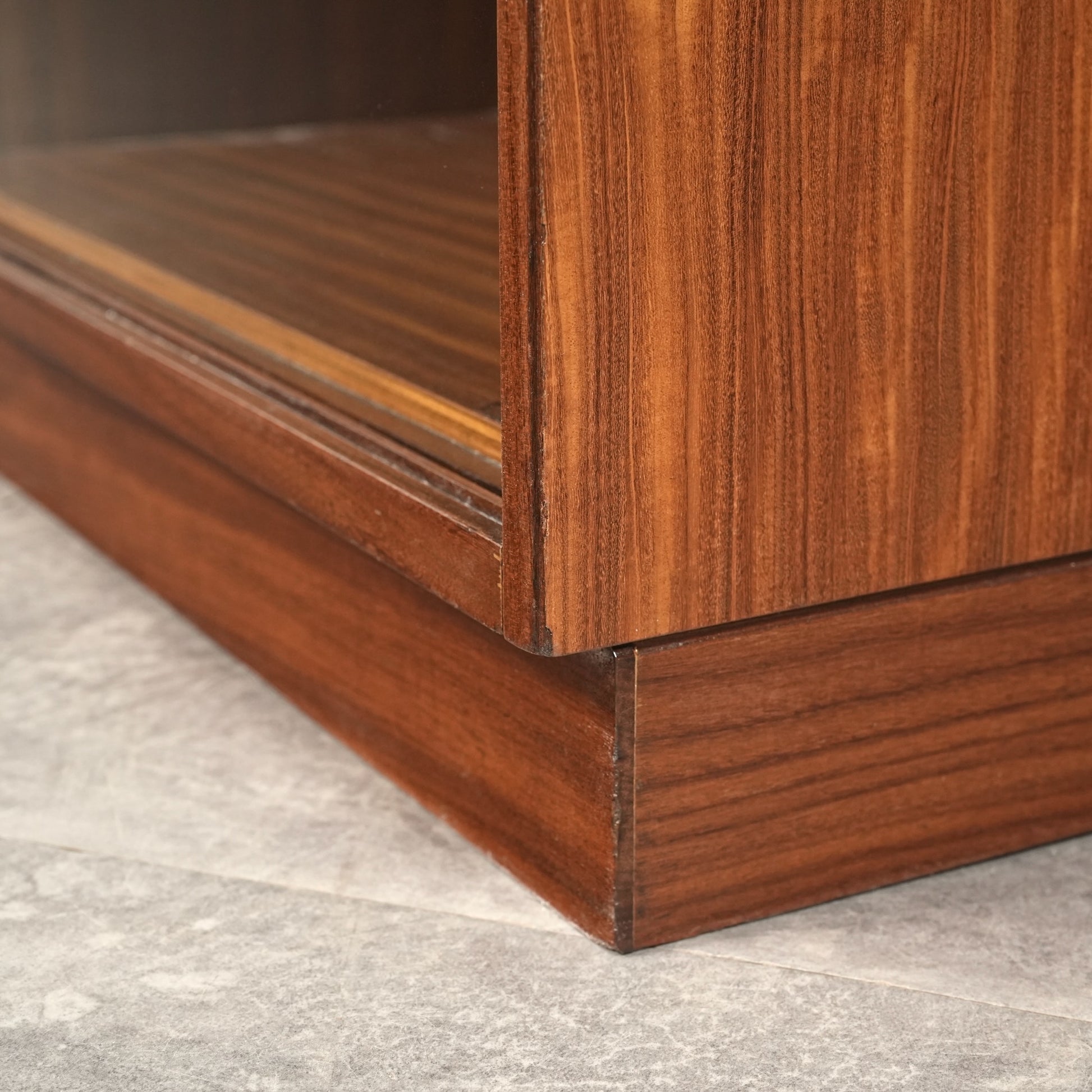 良質なチーク材の魅力が際立つ美しいミニマルデザインで、ガラス戸のユニークな引き手加工も絶妙なバランス。