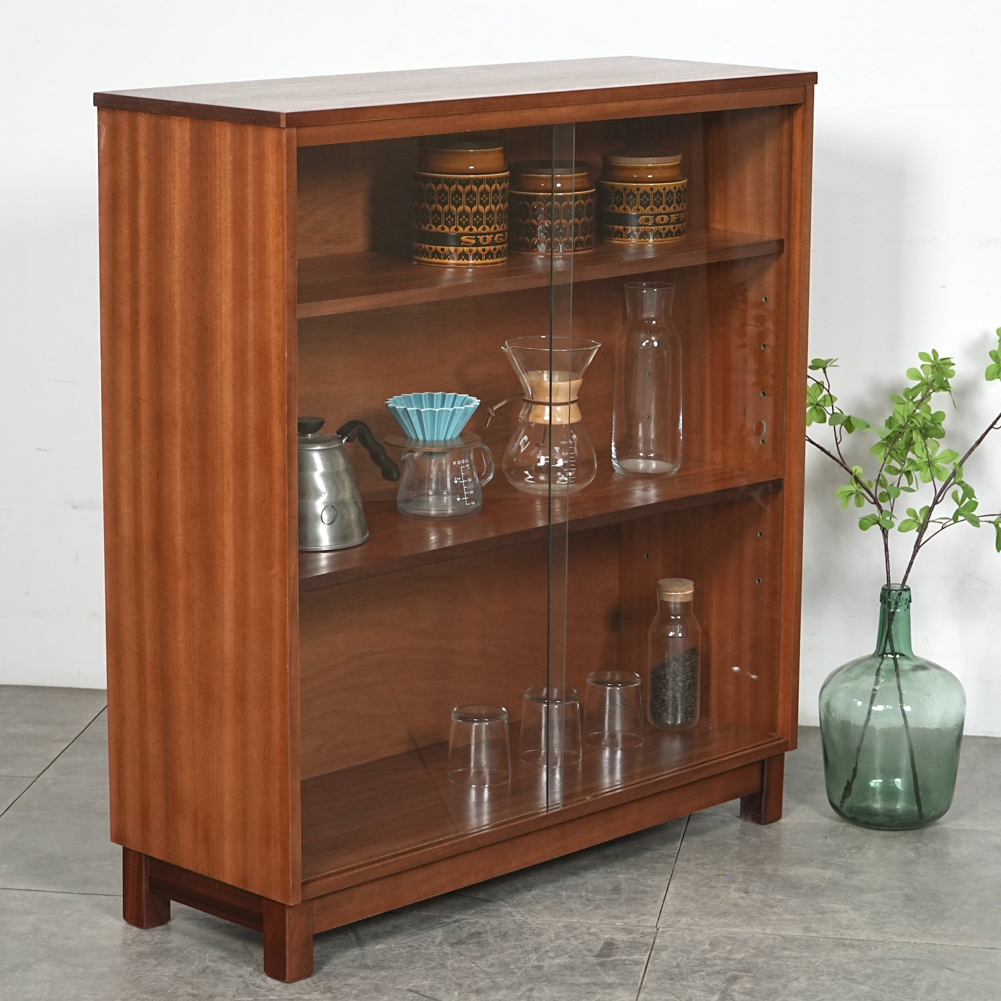ガラスの扉はお気に入りのアイテムを見せながら収納が可能で、優れた収納力と実用性を兼ね備えたヴィンテージ初心者にもオススメの優秀家具。