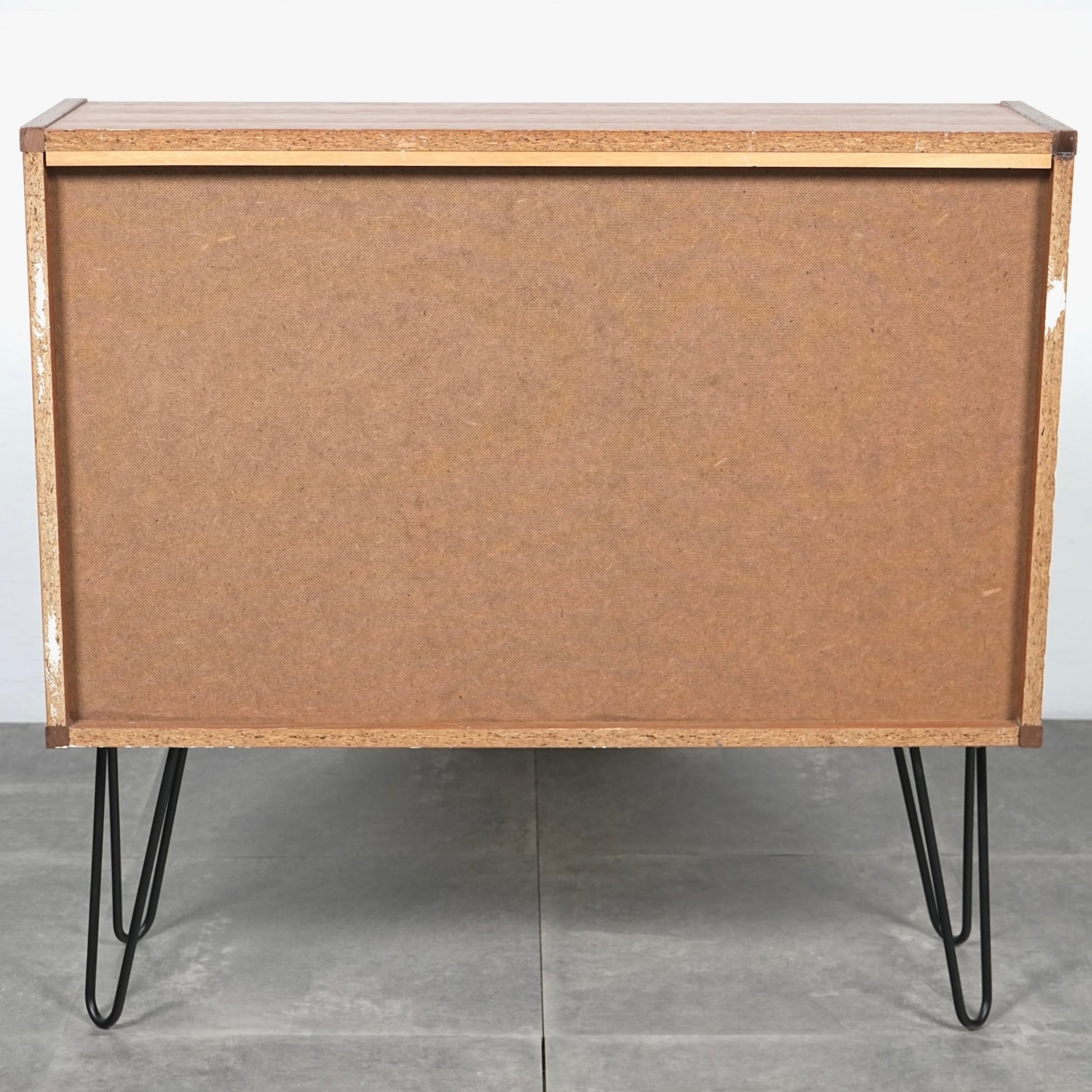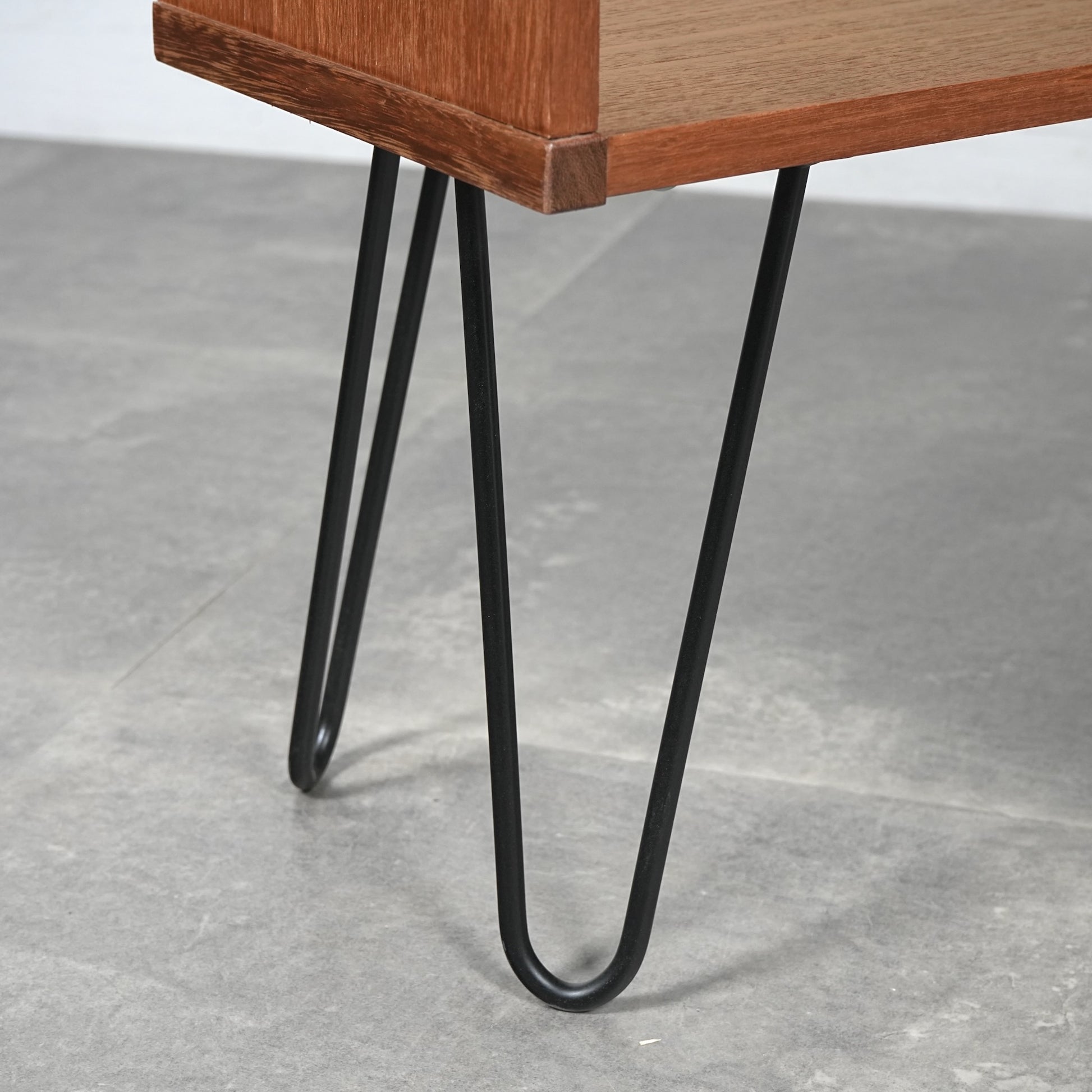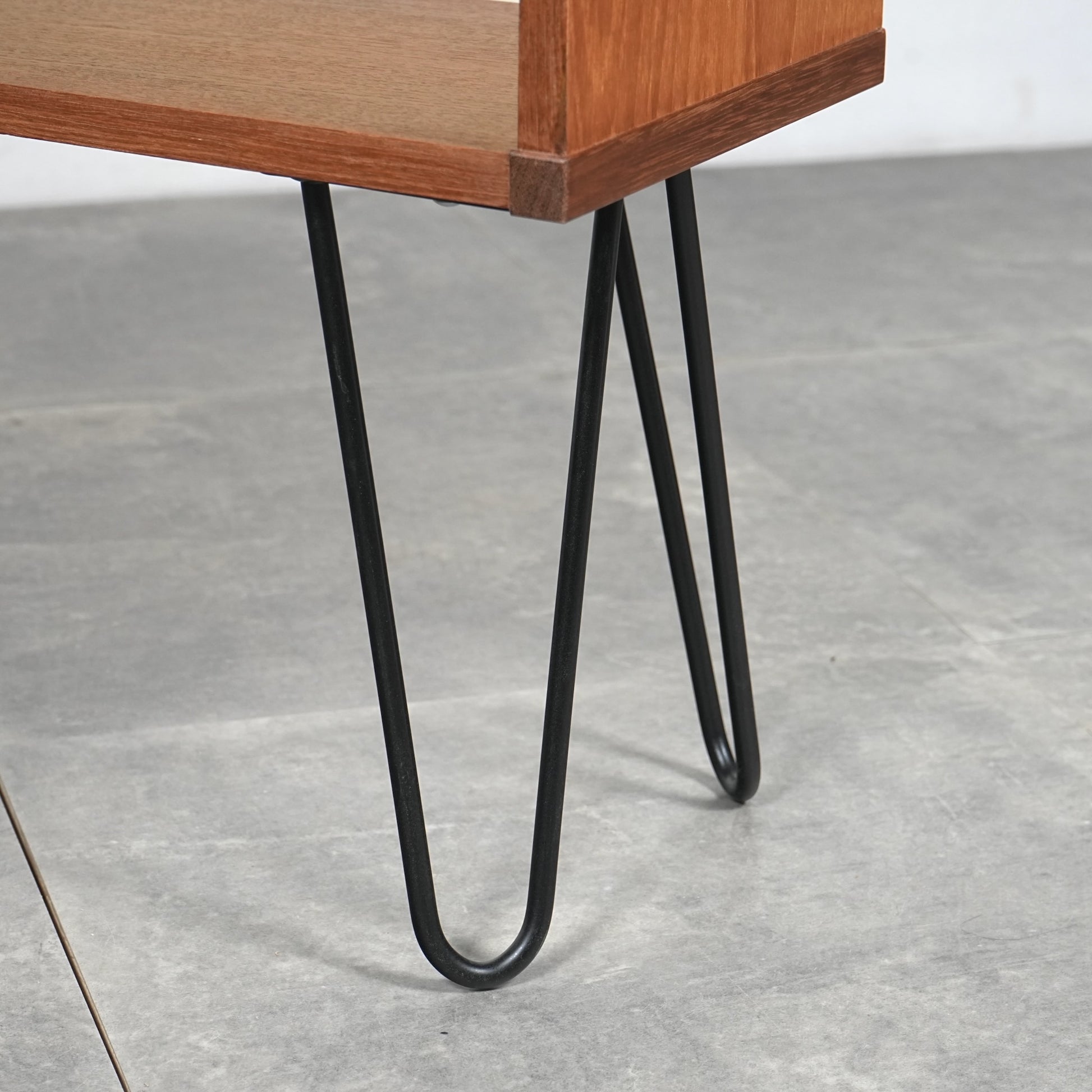 良質なチーク材の美しい木目や質感が際立つミニマルデザインで、異素材のヘアピンレッグとも良いバランスにまとまっています。