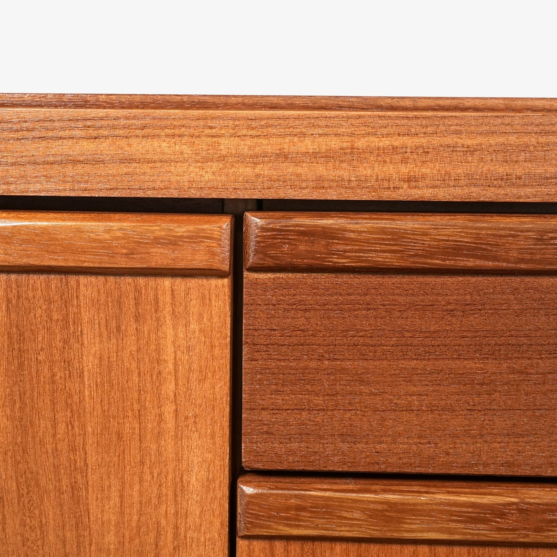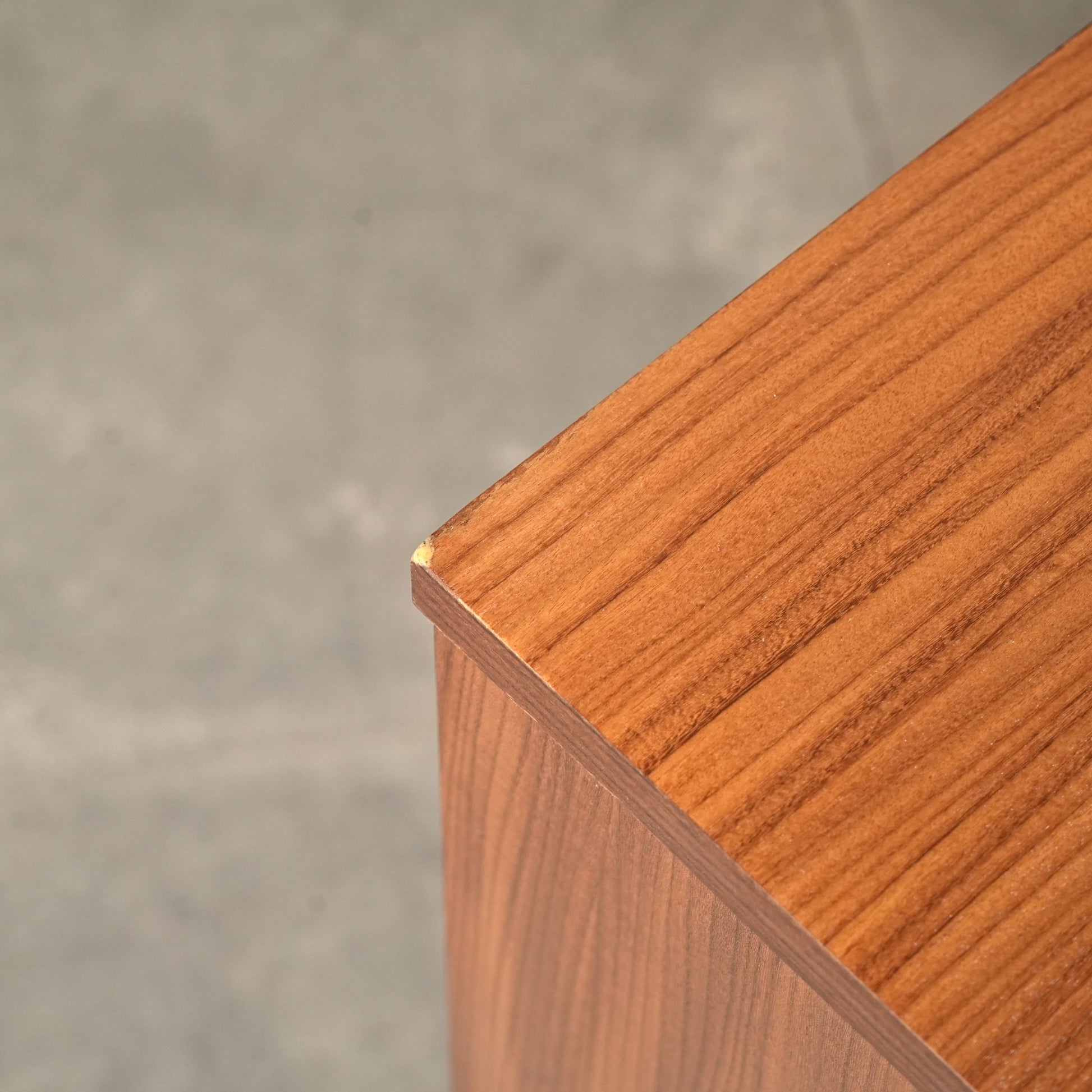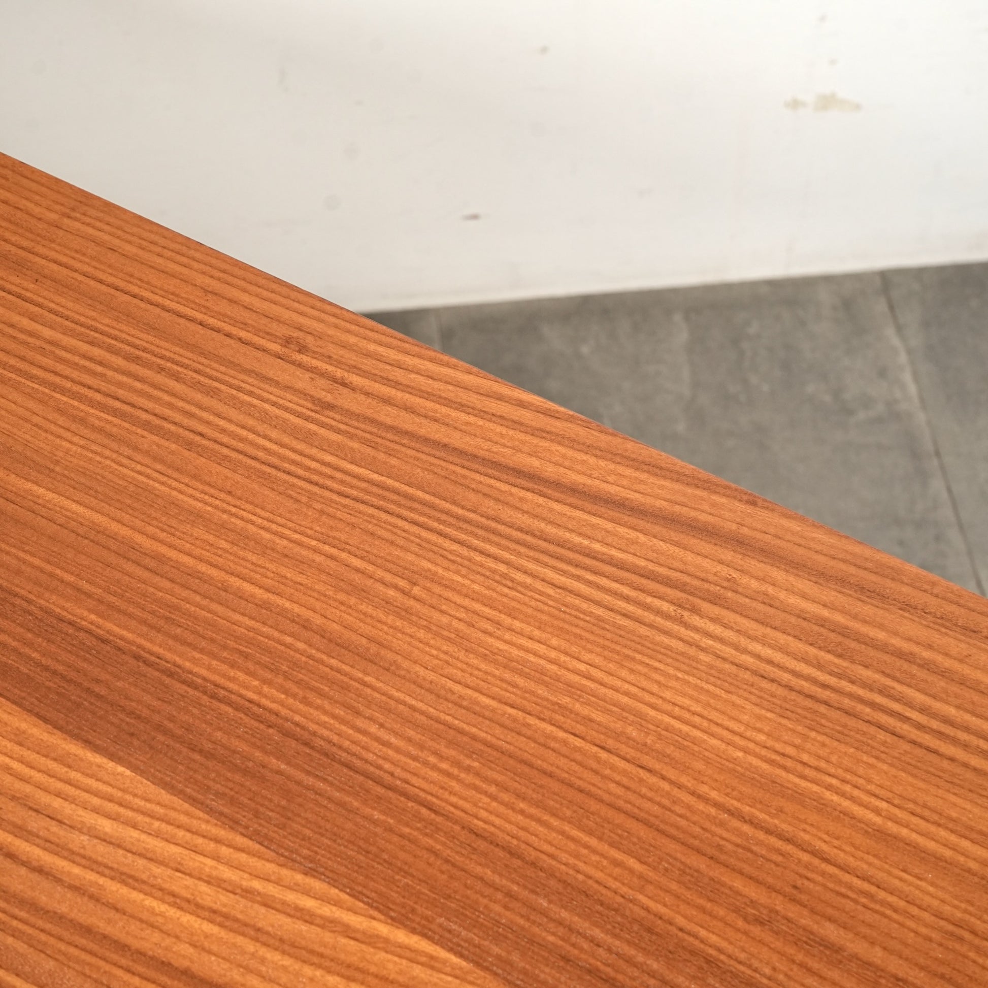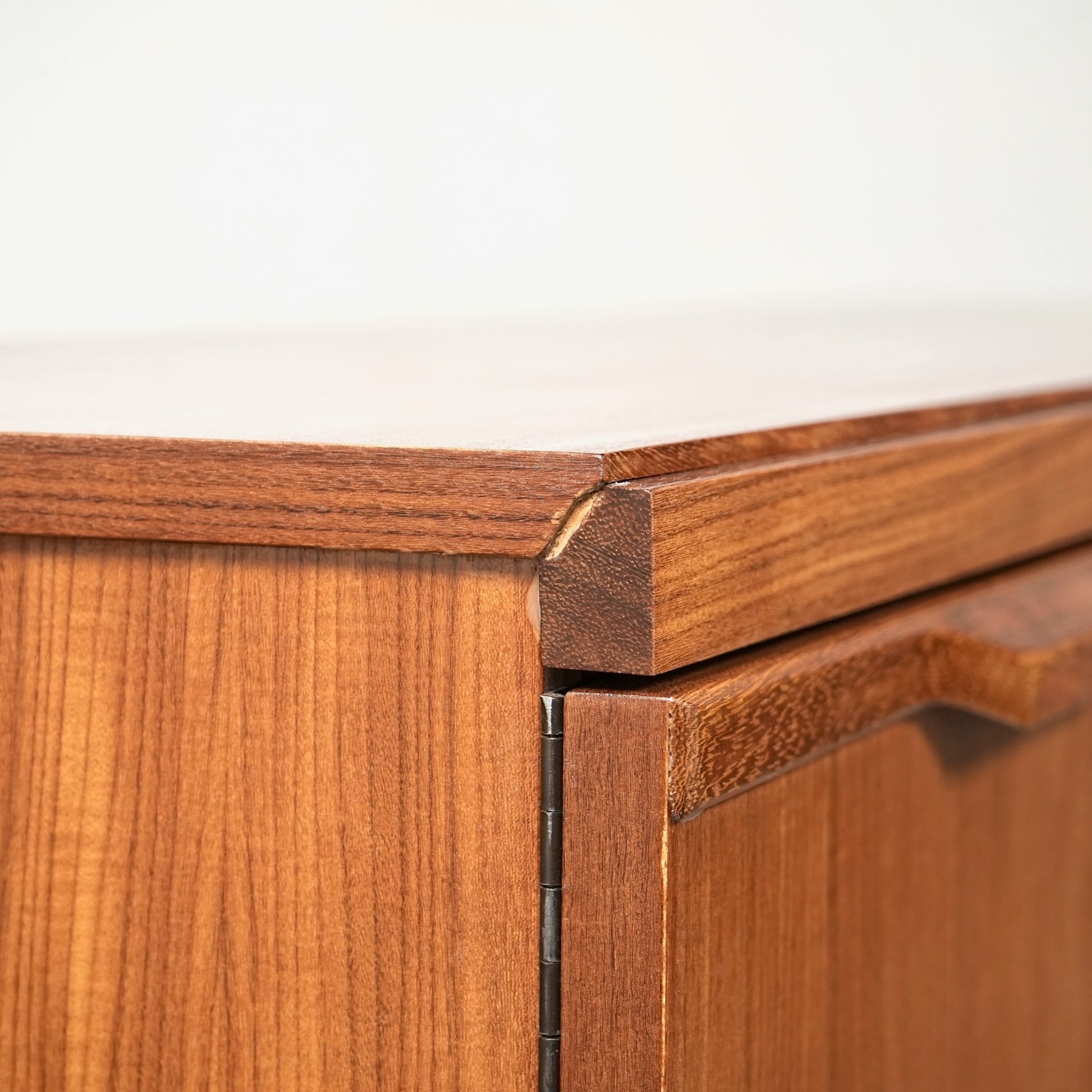 無駄を削ぎ落とした美しいミニマルデザインに加えて、上質なチーク材の美しい質感、削り出しで作られたシャープな取手や、ビーチ材を使用した脚部とのコントラストも絶妙なバランス。
