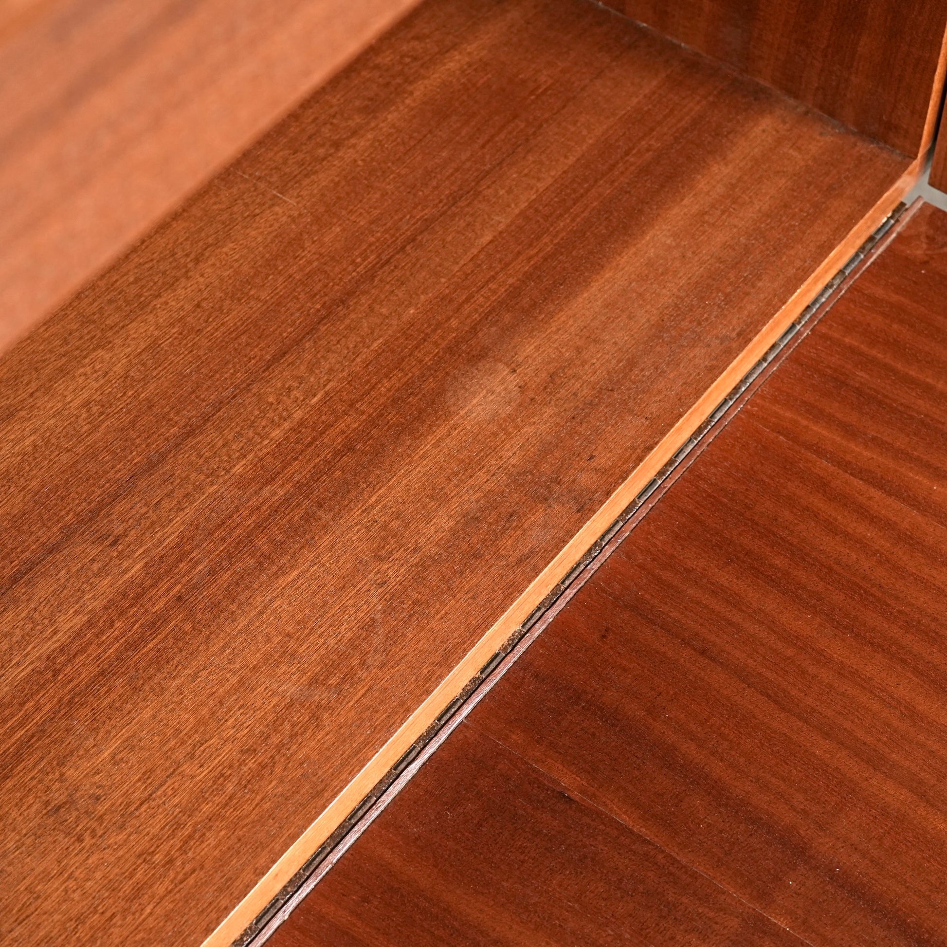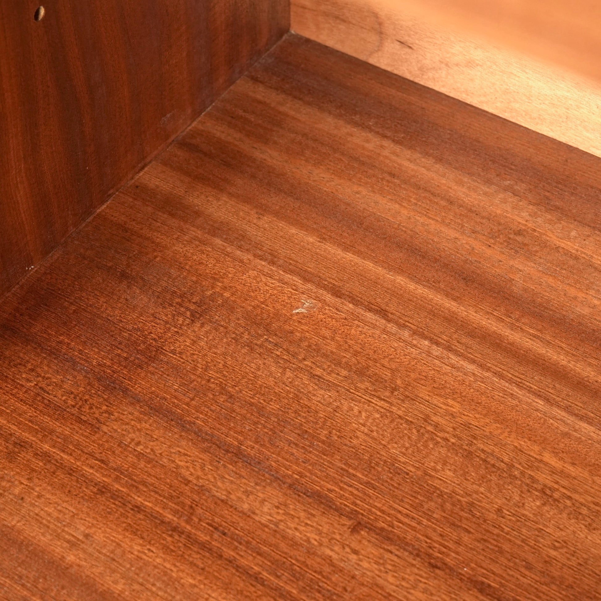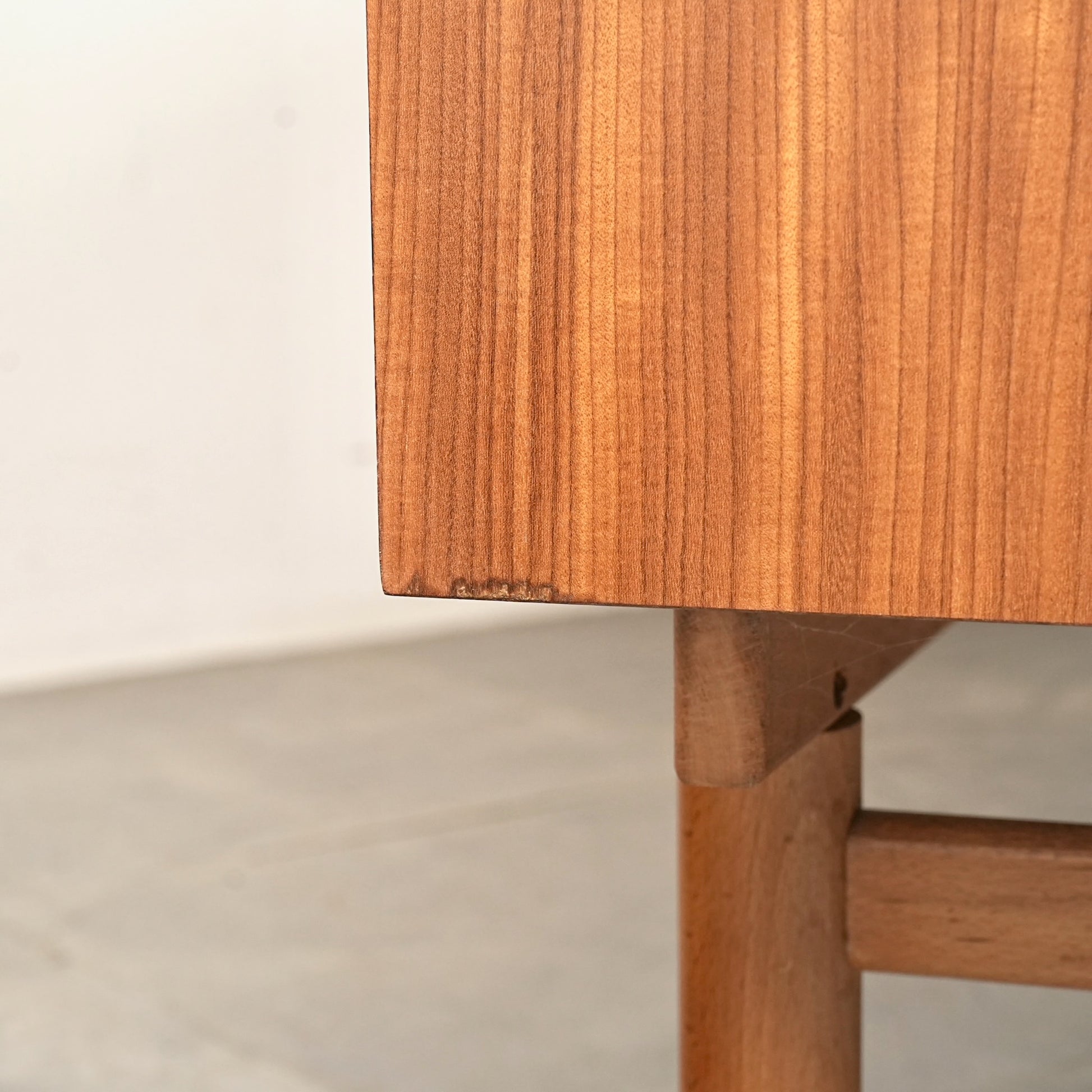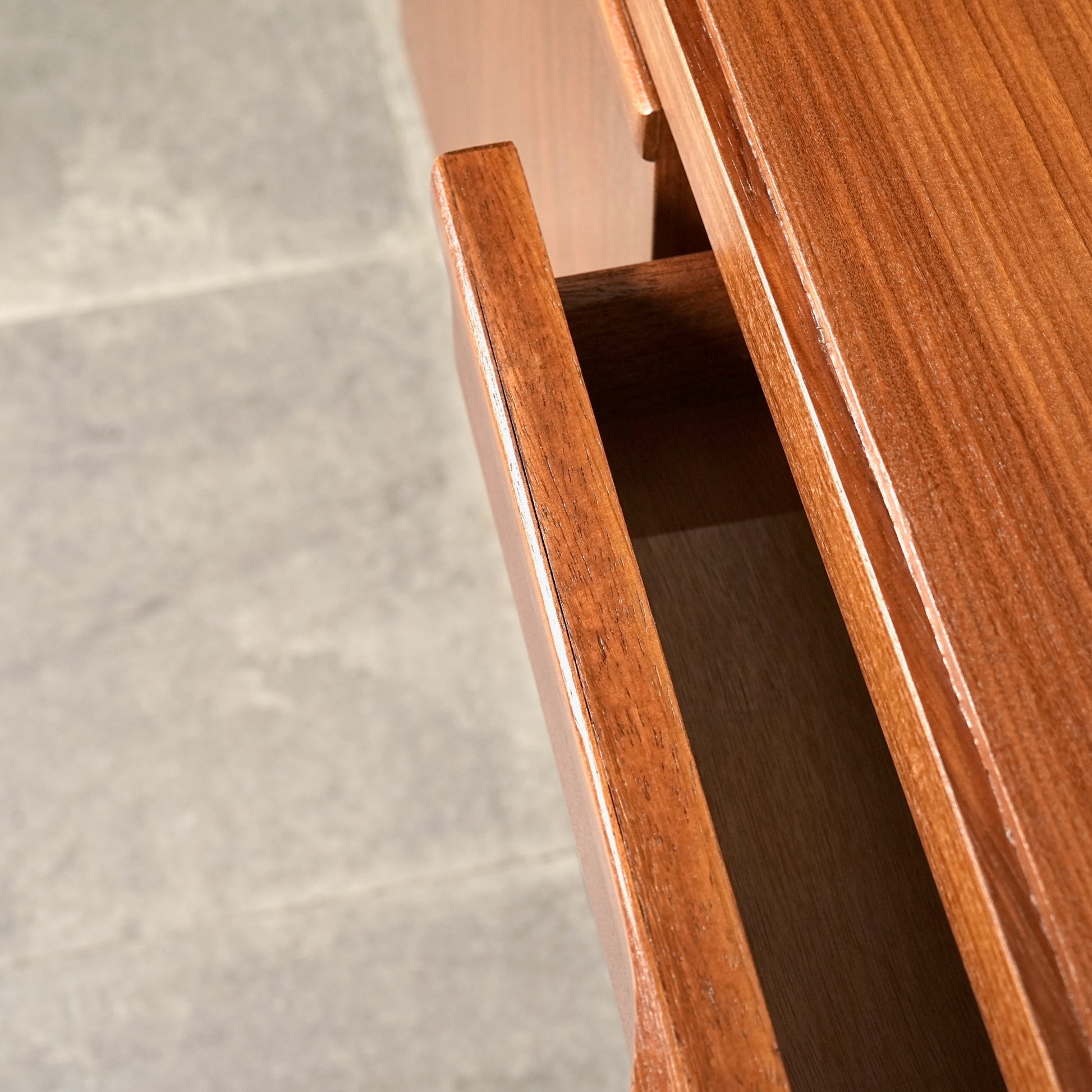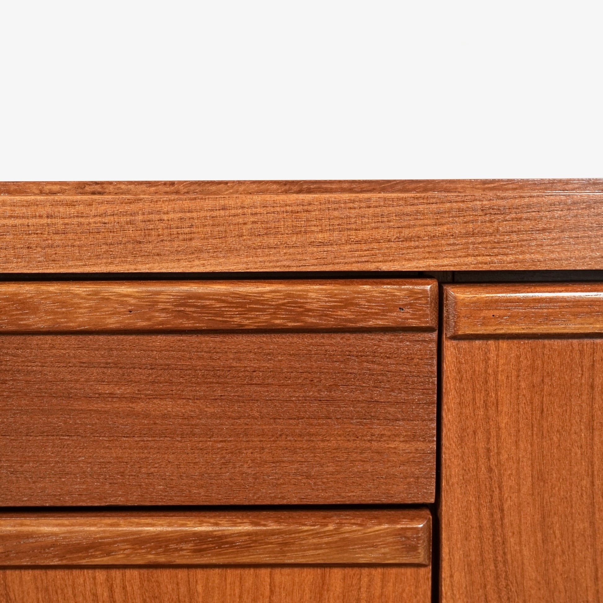 無駄を削ぎ落とした美しいミニマルデザインに加えて、上質なチーク材の美しい質感、削り出しで作られたシャープな取手や、ビーチ材を使用した脚部とのコントラストも絶妙なバランス。
