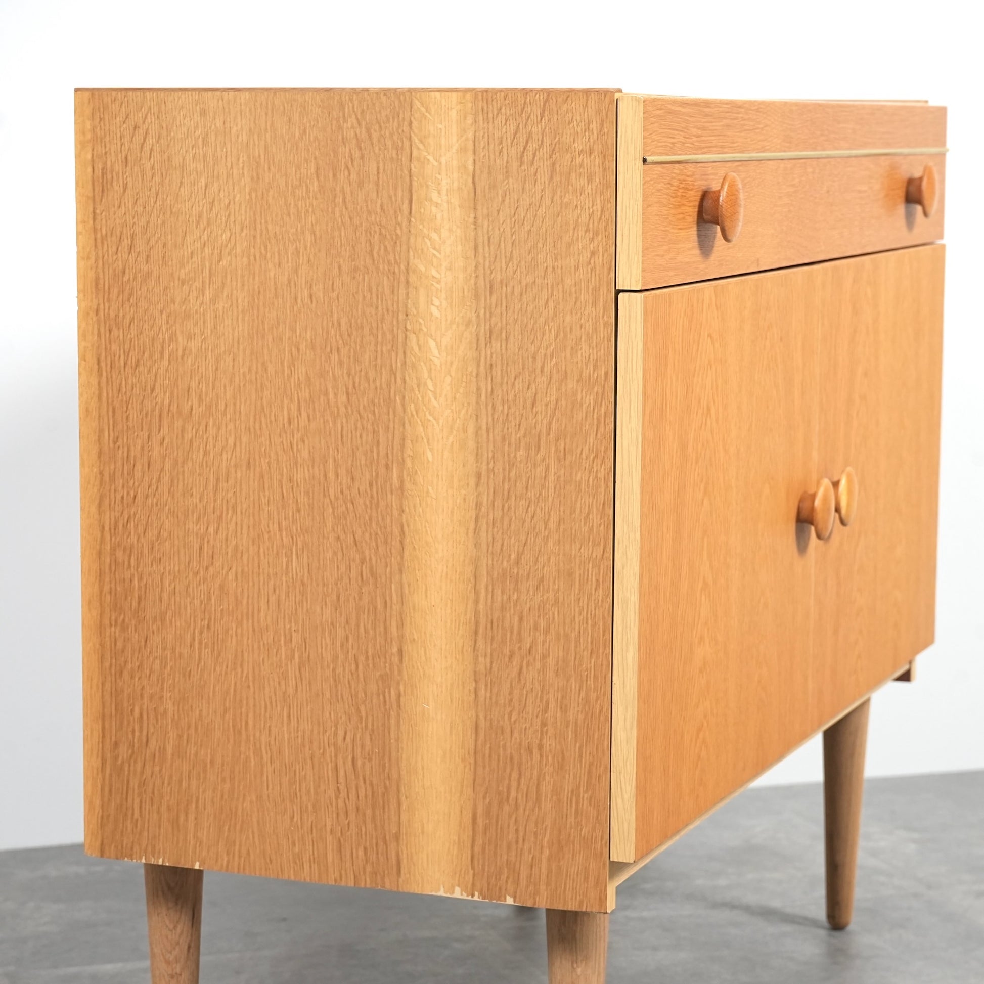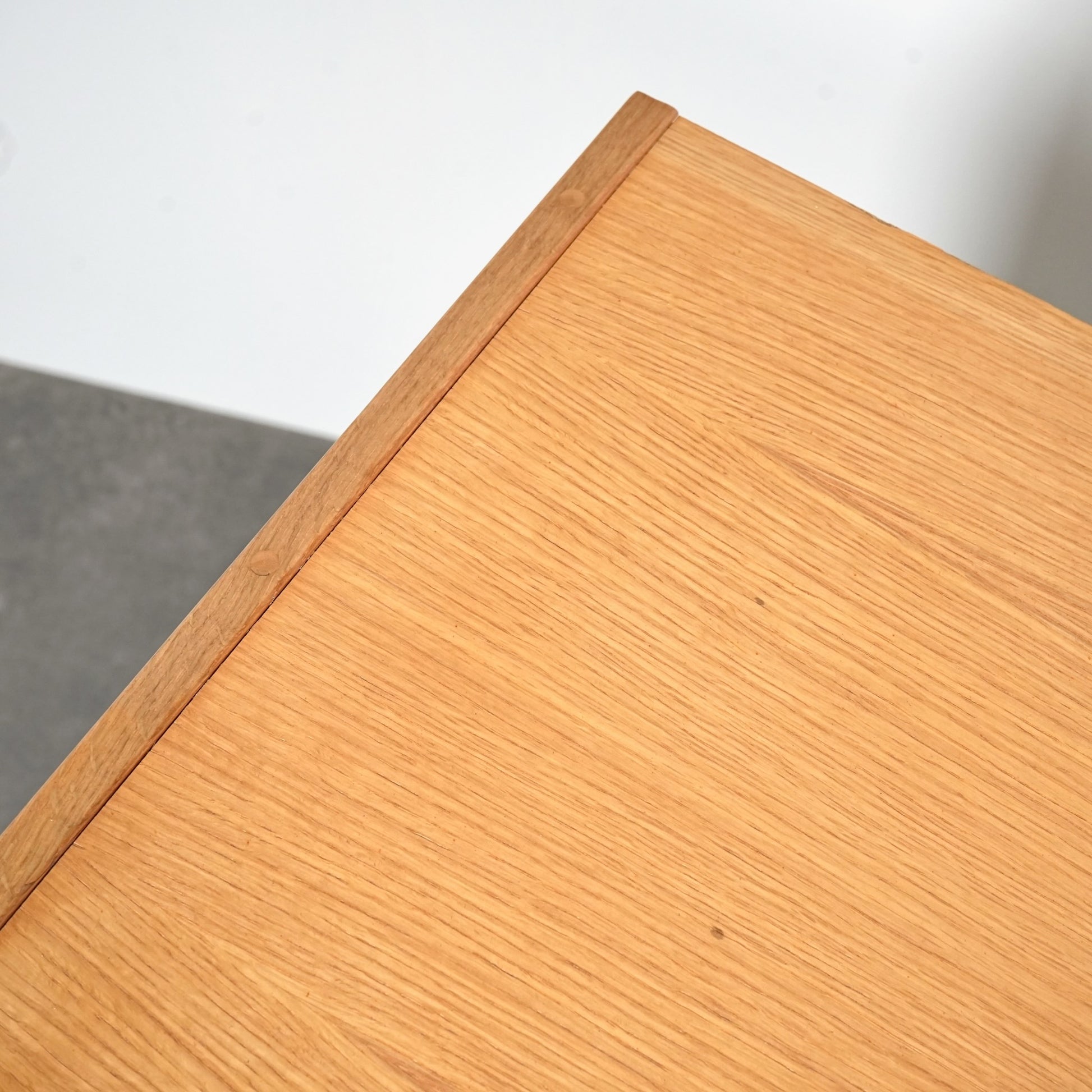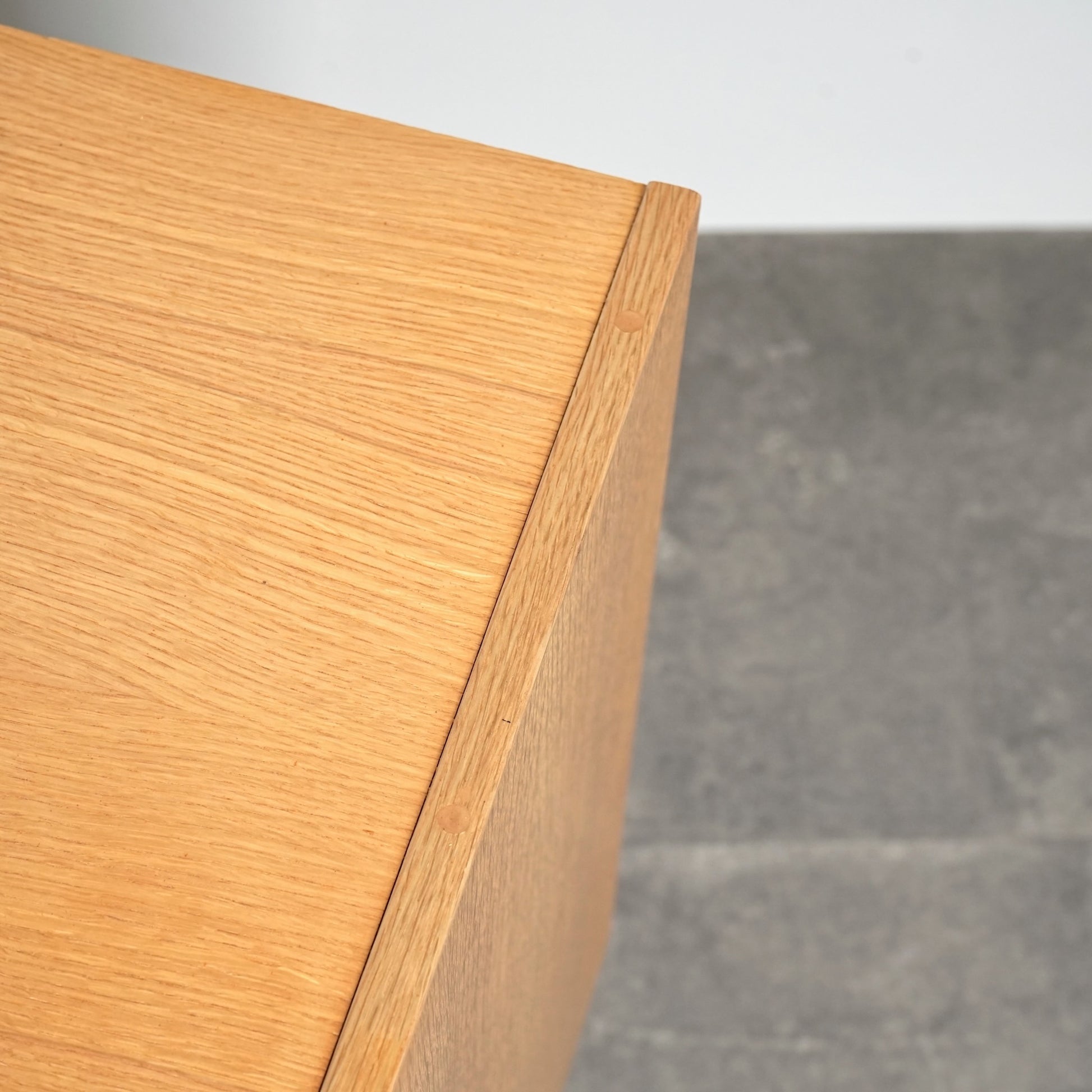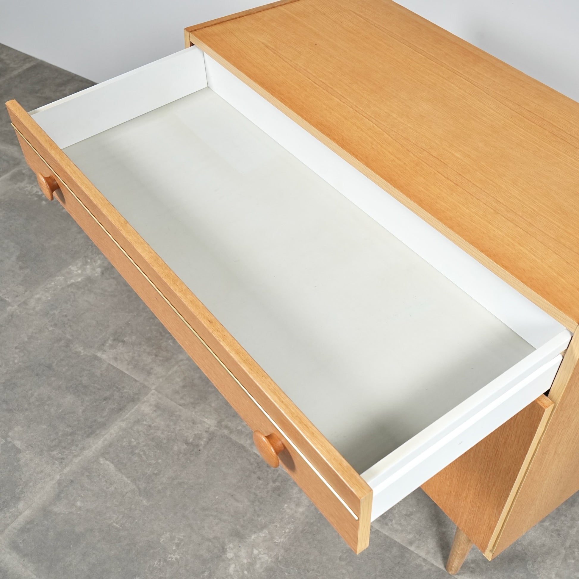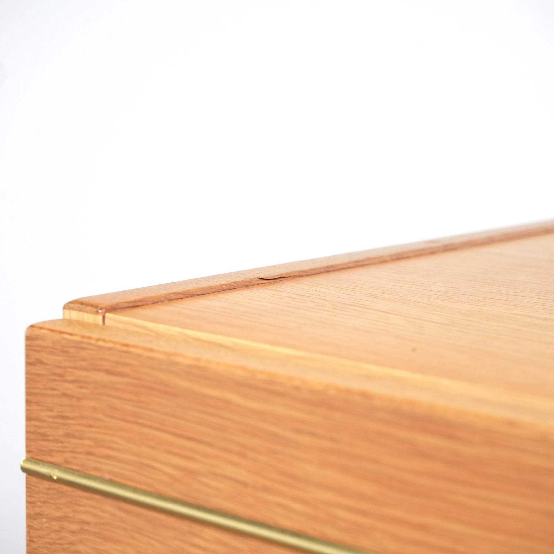 明るいトーンのオーク材を使用しており、主張しすぎないバランスの良いデザインの中に、削り出しの可愛らしい取手や脚部のスリムなラインが良いアクセントとなっています。