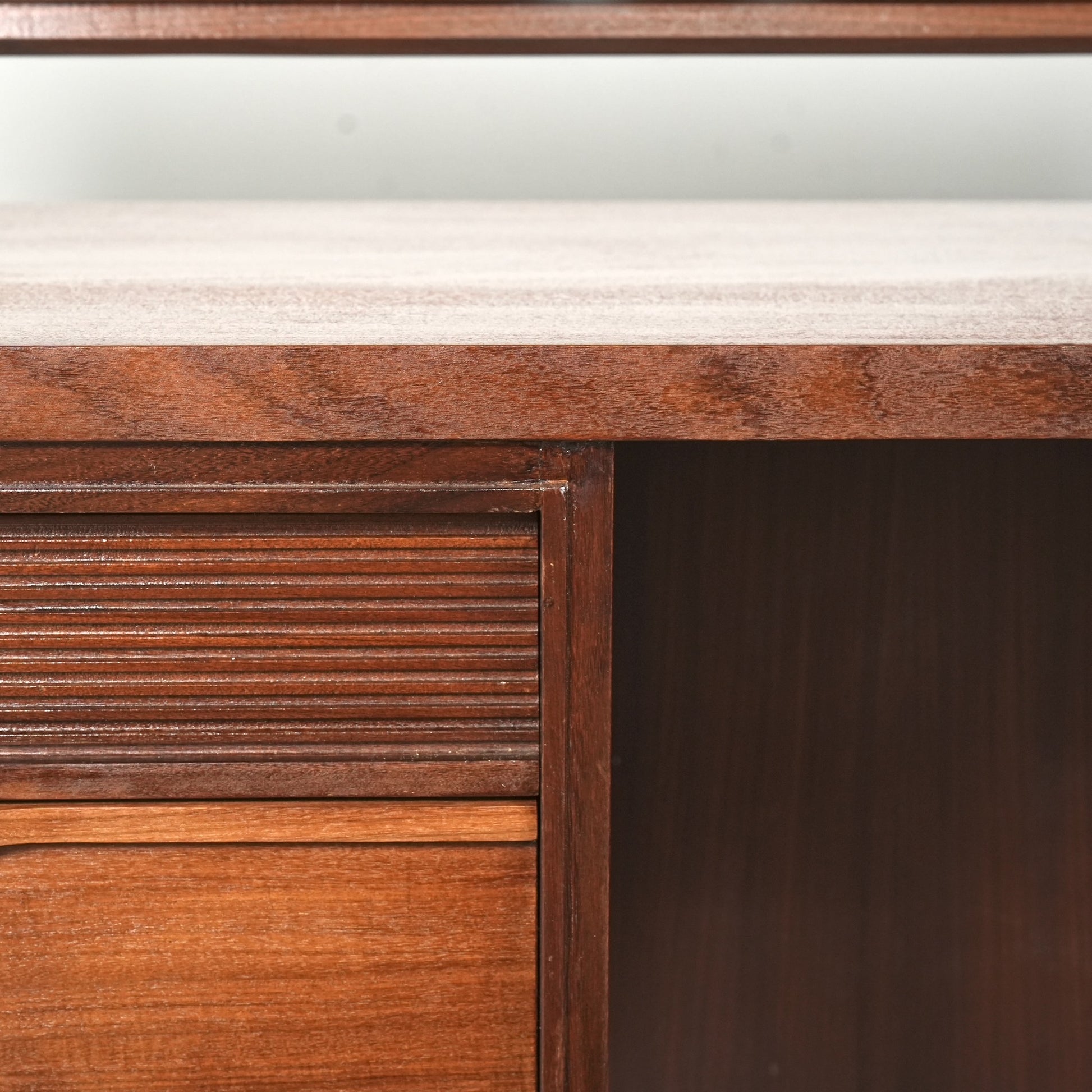 上質なチーク材の温かい色味と美しい木目が印象的で、主張しすぎないシンプルで洗練されたデザインの中に、取手や脚部のシャープなフォルムが良いアクセントになっています。